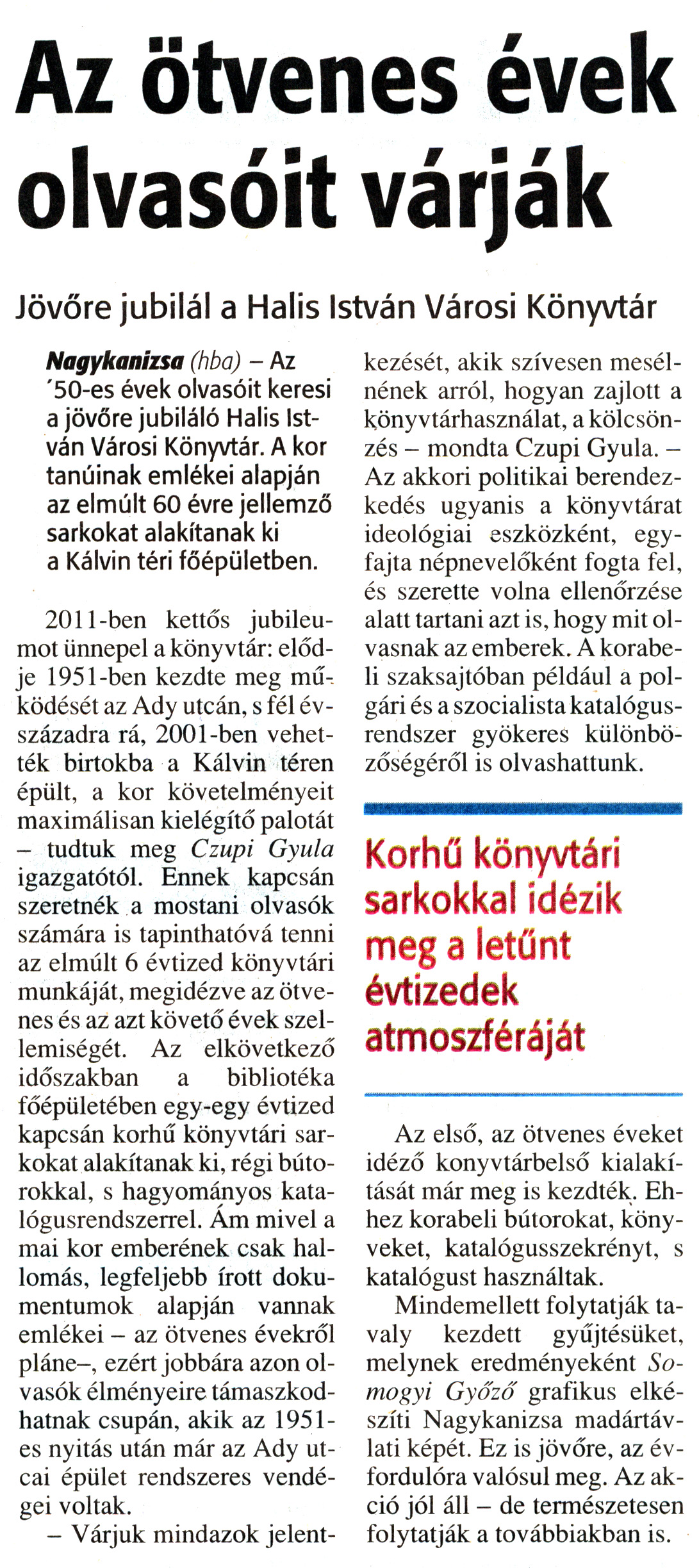 Nyilvános 1105 | 1477 | Zalai Hírlap 2010. szeptember 21. 220. szám 7. oldal - Az ötvenes évek olvasóit várják | A cikk szövege: Az ötvenes évek olvasóit várják Jövőre jubilál a Halis István Városi Könyvtár Nagykanizsa (hba) - Az \'50-es évek olvasóit keresi a jövőre jubiláló Halis István Városi Könyvtár. A kor tanúinak emlékei alapján az elmúlt 60 évre jellemző sarkokat alakítanak ki a Kálvin téri főépületben. 2011-ben kettős jubileumot ünnepel a könyvtár: elődje 1951-ben kezdte meg működését az Ady utcán, s fél évszázadra rá, 2001-ben vehették birtokba a Kálvin téren épült, a kor követelményeit maximálisan kielégítő palotát - tudtuk meg Czupi Gyula igazgatótól. Ennek kapcsán szeretnék a mostani olvasók számára is tapinthatóvá tenni az elmúlt 6 évtized könyvtári munkáját, megidézve az ötvenes és az azt követő évek szellemiségét. Az elkövetkező időszakban a bibliotéka főépületében egy-egy évtized kapcsán korhű könyvtári sarkokat alakítanak ki, régi bútorokkal, s hagyományos katalógusrendszerrel. Ám mivel a mai kor emberének csak hallomás, legfeljebb írott dokumentumok alapján vannak emlékei - az ötvenes évekről pláne -, ezért jobbára azon olvasók élményeire támaszkodhatnak csupán, akik az 1951-es nyitás után már az Ady utcai épület rendszeres vendégei voltak. - Várjuk mindazok jelentkezését, akik szívesen mesélnének arról, hogyan zajlott a könyvtárhasználat, a kölcsönzés - mondta Czupi Gyula. -Az akkori politikai berendezkedés ugyanis a könyvtárat ideológiai eszközként, egyfajta népnevelőként fogta fel, és szerette volna ellenőrzése alatt tartani azt is, hogy mit olvasnak az emberek. A korabeli szaksajtóban például a polgári és a szocialista katalógusrendszer gyökeres különbözőségéről is olvashattunk. Korhű könyvtári sarkokkal idézik meg a letűnt évtizedek atmoszféráját Az első, az ötvenes éveket idéző könyvtárbelső kialakítását már meg is kezdték. Ehhez korabeli bútorokat, könyveket, katalógusszekrényt, s katalógust használtak. Mindemellett folytatják tavaly kezdett gyűjtésüket, melynek eredményeként Somogyi Győző grafikus elkészíti Nagykanizsa madártávlati képét. Ez is jövőre, az évfordulóra valósul meg. Az akció jól áll - de természetesen folytatják a továbbiakban is. |
