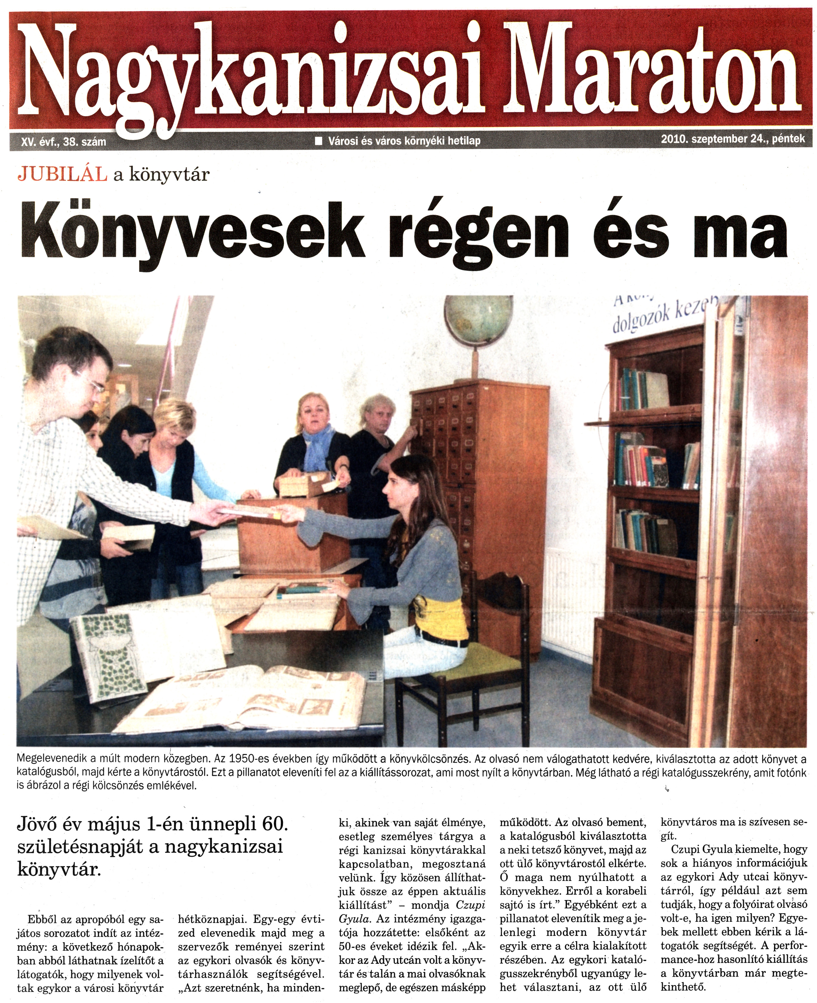 Nyilvános 1209 | 1546 | Nagykanizsai Maraton 2010. szeptember 24. 38. szám 1. oldal - Könyvesek régen és ma | A cikk szövege: JUBILÁL a könyvtár Könyvesek régen és ma Megelevenedik a múlt modern közegben. Az 1950-es években így működött a könyvkölcsönzés. Az olvasó nem válogathatott kedvére, kiválasztotta az adott könyvet a katalógusból, majd kérte a könyvtárostól. Ezt a pillanatot eleveníti fel az a kiállítássorozat, ami most nyílt a könyvtárban. Még látható a régi katalógusszekrény, amit fotónk is ábrázol a régi kölcsönzés emlékével. Jövő év május 1-én ünnepli 60. születésnapját a nagykanizsai könyvtár. Ebből az apropóból egy sajátos sorozatot indít az intézmény: a következő hónapokban abból láthatnak ízelítőt a látogatók, hogy milyenek voltak egykor a városi könyvtár hétköznapjai. Egy-egy évtized elevenedik majd meg a szervezők reményei szerint az egykori olvasók és könyvtárhasználók segítségével. „Azt szeretnénk, ha mindenki, akinek van saját élménye, esetleg személyes tárgya a régi kanizsai könyvtárakkal kapcsolatban, megosztaná velünk. Így közösen állíthatjuk össze az éppen aktuális kiállítást" - mondja Czupi Gyula. Az intézmény igazgatója hozzátette: elsőként az 50-es éveket idézik fel. „Akkor az Ady utcán volt a könyvtár és talán a mai olvasóknak meglepő, de egészen másképp működött. Az olvasó bement, a katalógusból kiválasztotta a neki tetsző könyvet, majd az ott ülő könyvtárostól elkérte. Ő maga nem nyúlhatott a könyvekhez. Erről a korabeli sajtó is írt." Egyébként ezt a pillanatot elevenítik meg a jelenlegi modern könyvtár egyik erre a célra kialakított részében. Az egykori katalógusszekrényből ugyanúgy lehet választani, az ott ülő könyvtáros ma is szívesen segít. Czupi Gyula kiemelte, hogy sok a hiányos információjuk az egykori Ady utcai könyvtárról, így például azt sem tudják, hogy a folyóirat olvasó volt-e, ha igen milyen? Egyebek mellett ebben kérik a látogatók segítségét. A performance-hoz hasonlító kiállítás a könyvtárban már megtekinthető. |