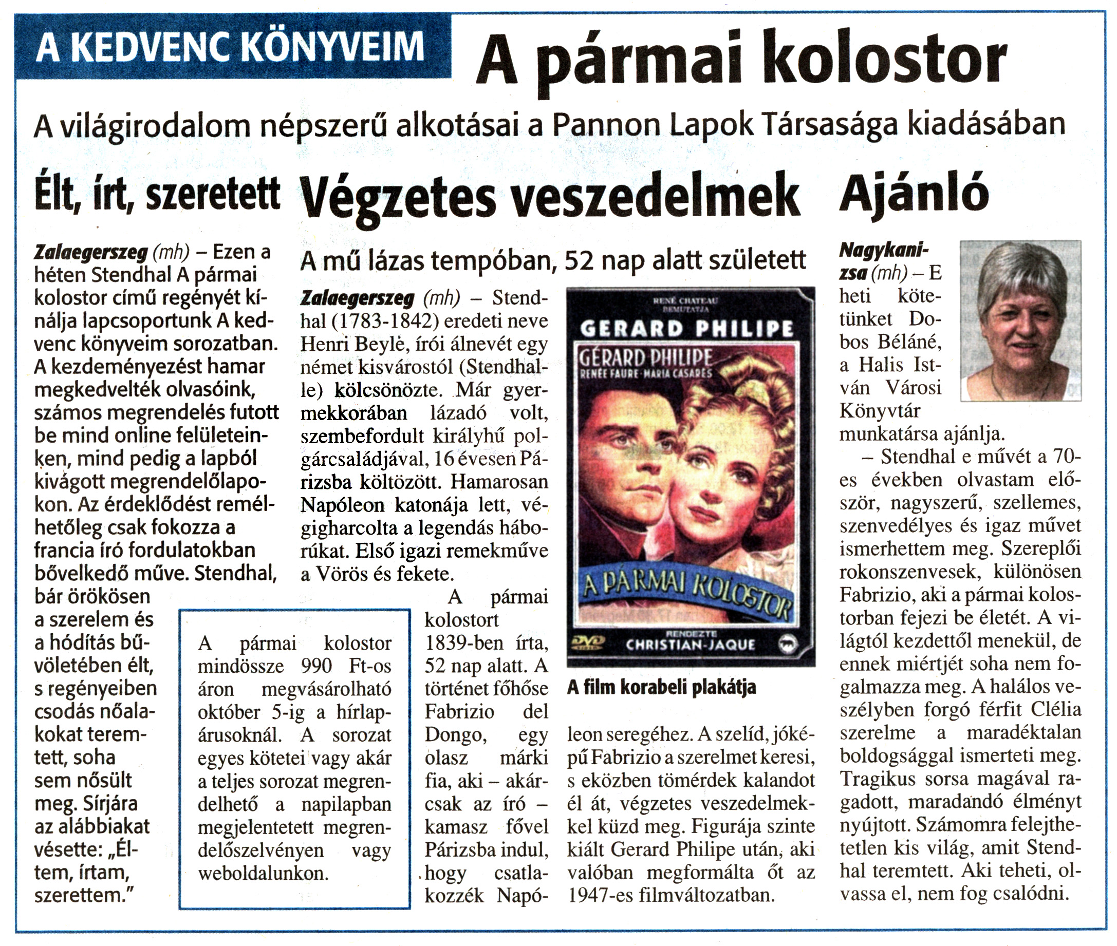 Nyilvános 1054 | 1308 | Zalai Hírlap 2010. szeptember 29. 227. szám 7. oldal - Könyvajánló | A cikk szövege: A KEDVENC KÖNYVEIM A pármai kolostor A világirodalom népszerű alkotásai a Pannon Lapok Társasága kiadásában Élt, írt, szeretett Zalaegerszeg (mh) - Ezen a héten Stendhal A pármai kolostor című regényét kínálja lapcsoportunk A kedvenc könyveim sorozatban. A kezdeményezést hamar megkedvelték olvasóink, számos megrendelés futott be mind online felületeinken, mind pedig a lapból kivágott megrendelőlapokon. Az érdeklődést remélhetőleg csak fokozza a francia író fordulatokban bővelkedő műve. Stendhal, bár örökösen a szerelem és a hódítás bűvöletében élt, s regényeiben csodás nőalakokat teremtett, soha sem nősült meg. Sírjára az alábbiakat vésette: „Éltem, írtam, szerettem." Végzetes veszedelmek A mű lázas tempóban, 52 nap alatt született Zalaegerszeg (mh) - Stendhal (1783-1842) eredeti neve Henri Beyle, írói álnevét egy német kisvárostól (Stendhal-le) kölcsönözte. Már gyermekkorában lázadó volt, szembefordult királyhű polgárcsaládjával, 16 évesen Párizsba költözött. Hamarosan Napóleon katonája lett, végigharcolta a legendás háborúkat. Első igazi remekműve a Vörös és fekete. A pármai kolostort 1839-ben írta, 52 nap alatt. A történet főhőse Fabrizio del Dongó, egy olasz márki fia, aki - akárcsak az író -kamasz fővel Párizsba indul, hogy csatlakozzék Napóleon seregéhez. A szelíd, jóképű Fabrizio a szerelmet keresi, s eközben tömérdek kalandot él át, végzetes veszedelmekkel küzd meg. Figurája szinte kiált Gerard Philipe után, aki valóban megformálta őt az 1947-es filmváltozatban. A pármai kolostor mindössze 990 Ft-os áron megvásárolható október 5-ig a hírlapárusoknál. A sorozat egyes kötetei vagy akár a teljes sorozat megrendelhető a napilapban megjelentetett megrendelőszelvényen vagy weboldalunkon. Ajánló Nagykanizsa (mh) - E heti kötetünket Dobos Béláné, a Halis István Városi Könyvtár munkatársa ajánlja. - Stendhal e művét a 70-es években olvastam először, nagyszerű, szellemes, szenvedélyes és igaz művet ismerhettem meg. Szereplői rokonszenvesek, különösen Fabrizio, aki a pármai kolostorban fejezi be életét. A világtól kezdettől menekül, de ennek miértjét soha nem fogalmazza meg. A halálos veszélyben forgó férfit Clélia szerelme a maradéktalan boldogsággal ismerteti meg. Tragikus sorsa magával ragadott, maradandó élményt nyújtott. Számomra felejthetetlen kis világ, amit Stendhal teremtett. Aki teheti, olvassa el, nem fog csalódni. A film korabeli plakátja |
