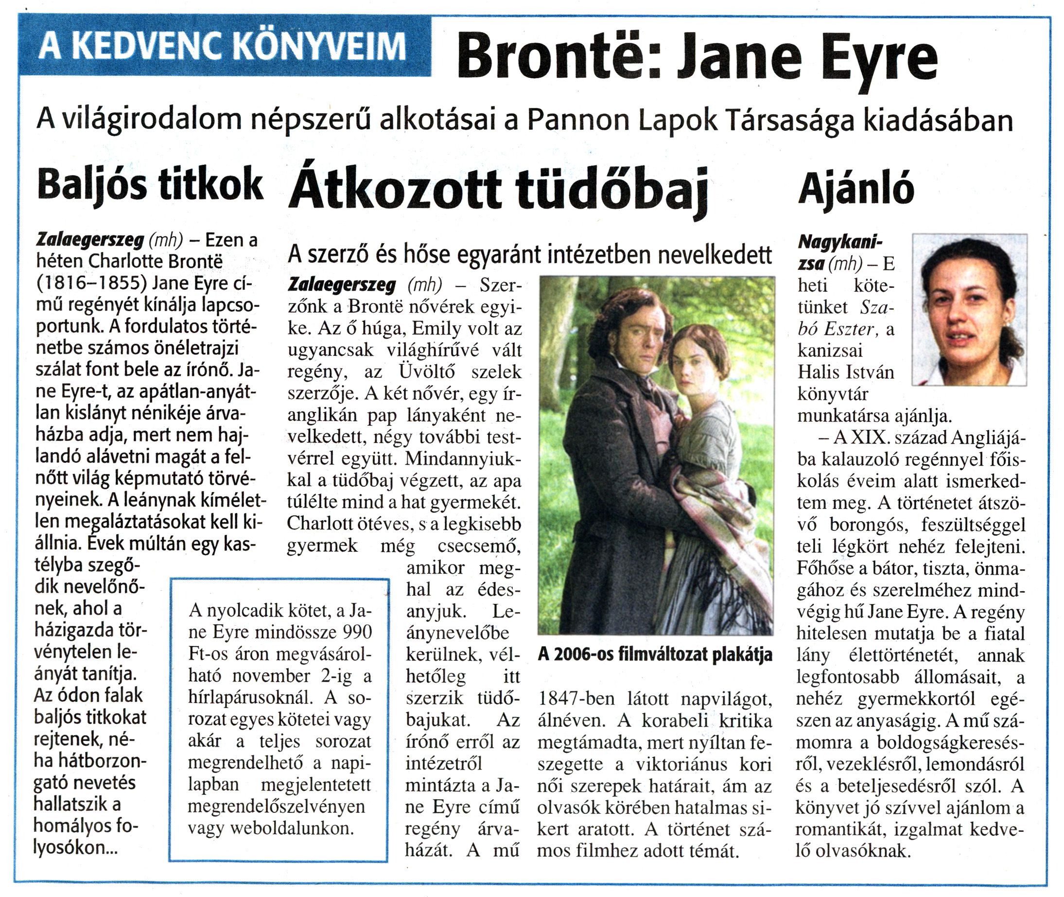 Nyilvános 1070 | 1239 | Zalai Hírlap 2010. október 27. 250. szám 7. oldal - Könyvajánló | A cikk szövege: A KEDVENC KÖNYVEIM Bronte: Jane Eyre A világirodalom népszerű alkotásai a Pannon Lapok Társasága kiadásában Baljós titkok Zalaegerszeg (mh) - Ezen a héten Charlotte Bronté (1816-1855) Jane Eyre című regényét kínálja lapcsoportunk. A fordulatos történetbe számos önéletrajzi szálat font bele az írónő. Jane Eyre-t, az apátlan-anyátlan kislányt nénikéje árvaházba adja, mert nem hajlandó alávetni magát a felnőtt világ képmutató törvényeinek. A leánynak kíméletlen megaláztatásokat kell kiállnia. Evek múltán egy kastélyba szegődik nevelőnőnek, ahol a házigazda törvénytelen leányát tanítja. Az ódon falak baljós titkokat rejtenek, néha hátborzongató nevetés hallatszik a homályos folyosókon... A nyolcadik kötet, a Jane Eyre mindössze 990 Ft-os áron megvásárolható november 2-ig a hírlapárusoknál. A sorozat egyes kötetei vagy akár a teljes sorozat megrendelhető a napilapban megjelentetett megrendelőszelvényen vagy weboldalunkon. Átkozott tüdőbaj A szerző és hőse egyaránt intézetben nevelkedett Zalaegerszeg (mh) - Szerzőnk a Bronte nővérek egyike. Az ő húga, Emily volt az ugyancsak világhírűvé vált regény, az Üvöltő szelek szerzője. A két nővér, egy ír-anglikán pap lányaként nevelkedett, négy további testvérrel együtt. Mindannyiukkal a tüdőbaj végzett, az apa túlélte mind a hat gyermekét. Charlott ötéves, s a legkisebb gyermek még csecsemő, amikor meg- hal az édesanyjuk. Leánynevelőbe kerülnek, vélhetőleg itt szerzik tüdőbajukat. Az írónő erről az intézetről mintázta a Jane Eyre című regény árvaházát. A mű A 2006-os filmváltozat plakátja 1847-ben látott napvilágot, álnéven. A korabeli kritika megtámadta, mert nyíltan feszegette a viktoriánus kori női szerepek határait, ám az olvasók körében hatalmas sikert aratott. A történet számos filmhez adott témát. Ajánló Nagykanizsa (mh) - E heti kötetünket Szabó Eszter, a kanizsai Halis István könyvtár munkatársa ajánlja. - A XIX. század Angliájába kalauzoló regénnyel főiskolás éveim alatt ismerkedtem meg. A történetet átszövő borongós, feszültséggel teli légkört nehéz felejteni. Főhőse a bátor, tiszta, önmagához és szerelméhez mindvégig hű Jane Eyre. A regény hitelesen mutatja be a fiatal lány élettörténetét, annak legfontosabb állomásait, a nehéz gyermekkortól egészen az anyaságig. A mű számomra a boldogságkeresésről, vezeklésről, lemondásról és a beteljesedésről szól. A könyvet jó szívvel ajánlom a romantikát, izgalmat kedvelő olvasóknak. |