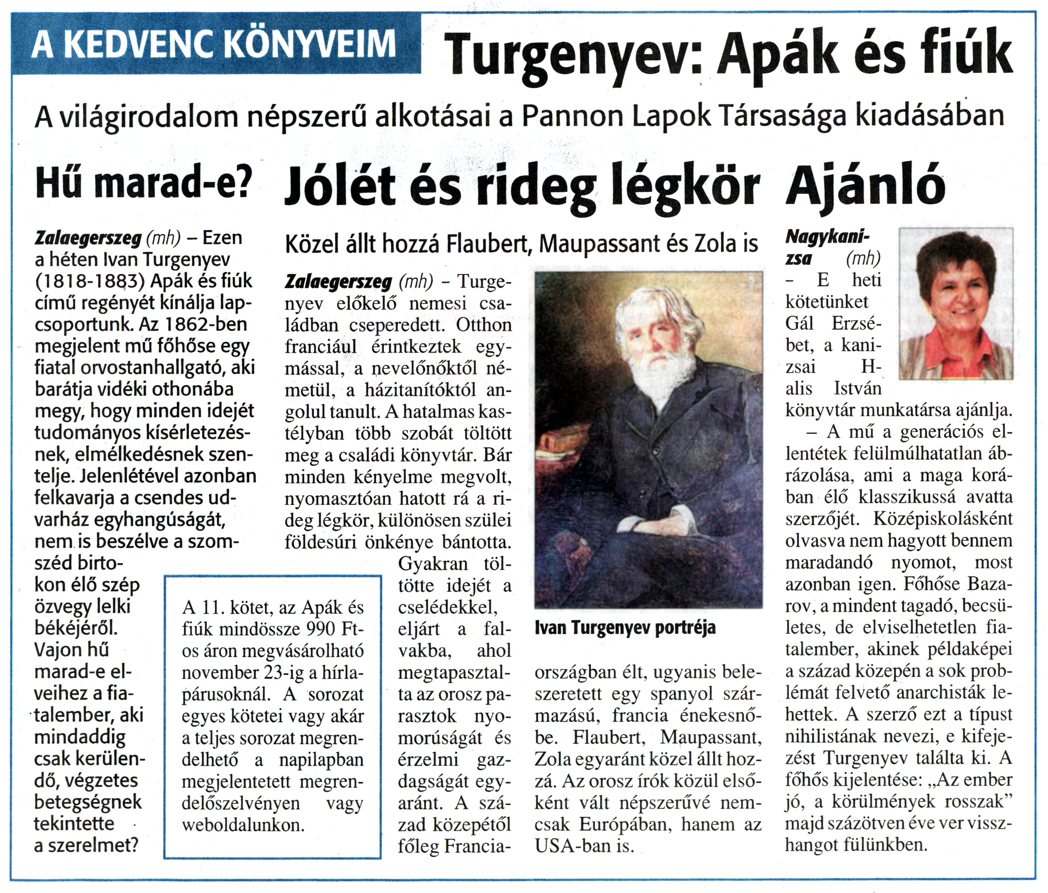 Nyilvános 1845 | 4954 | Zalai Hírlap 2010. november 17. 267. szám 7. oldal - Könyvajánló | A KEDVENC KÖNYVEIM Turgenyev: Apák és fiúk A világirodalom népszerű alkotásai a Pannon Lapok Társasága kiadásában Hű marad-e? Zalaegerszeg (mh) - Ezen a héten Ivan Turgenyev (1818-1883) Apák és fiúk című regényét kínálja lapcsoportunk. Az 1862-ben megjelent mű főhőse egy fiatal orvostanhallgató, aki barátja vidéki otthonába megy, hogy minden idejét tudományos kísérletezésnek, elmélkedésnek szentelje. Jelenlétével azonban felkavarja a csendes udvarház egyhangúságát, nem is beszélve a szomszéd birtokon élő szép özvegy lelki békéjéről. Vajon hű marad-e elveihez a fiatalember, aki mindaddig csak kerülendő, végzetes betegségnek tekintette a szerelmet? A11. kötet, az Apák és fiúk mindössze 990 Ft-os áron megvásárolható november 23-ig a hírlapárusoknál. A sorozat egyes kötetei vagy akár a teljes sorozat megrendelhető a napilapban megjelentetett megrendelőszelvényen vagy weboldalunkon. Jólét és rideg légkör Közel állt hozzá Flaubert, Maupassant és Zola is Zalaegerszeg (mh) - Turgenyev előkelő nemesi családban cseperedett. Otthon franciául érintkeztek egymással, a nevelőnőktől németül, a házitanítóktól angolul tanult. A hatalmas kastélyban több szobát töltött meg a családi könyvtár. Bár minden kényelme megvolt, nyomasztóan hatott rá a rideg légkör, különösen szülei földesúri önkénye bántotta. Gyakran töltötte idejét a cselédekkel, eljárt a falvakba, ahol megtapasztalta az orosz parasztok nyomorúságát és érzelmi gazdagságát egyaránt. A század közepétől főleg Francia- Ivan Turgenyev portréja országban élt, ugyanis beleszeretett egy spanyol származású, francia énekesnőbe. Flaubert, Maupassant, Zola egyaránt közel állt hozzá. Az orosz írók közül elsőként vált népszerűvé nemcsak Európában, hanem az USA-ban is. Ajánló Nagykanizsa (mh) - E heti kötetünket Gál Erzsébet, a kanizsai Halis István könyvtár munkatársa ajánlja. - A mű a generációs ellentétek felülmúlhatatlan ábrázolása, ami a maga korában élő klasszikussá avatta szerzőjét. Középiskolásként olvasva nem hagyott bennem maradandó nyomot, most azonban igen. Főhőse Baza-rov, a mindent tagadó, becsületes, de elviselhetetlen fiatalember, akinek példaképei a század közepén a sok problémát felvető anarchisták lehettek. A szerző ezt a típust nihilistának nevezi, e kifejezést Turgenyev találta ki. A főhős kijelentése: „Az ember jó, a körülmények rosszak" majd százötven éve ver visszhangot fülünkben. |