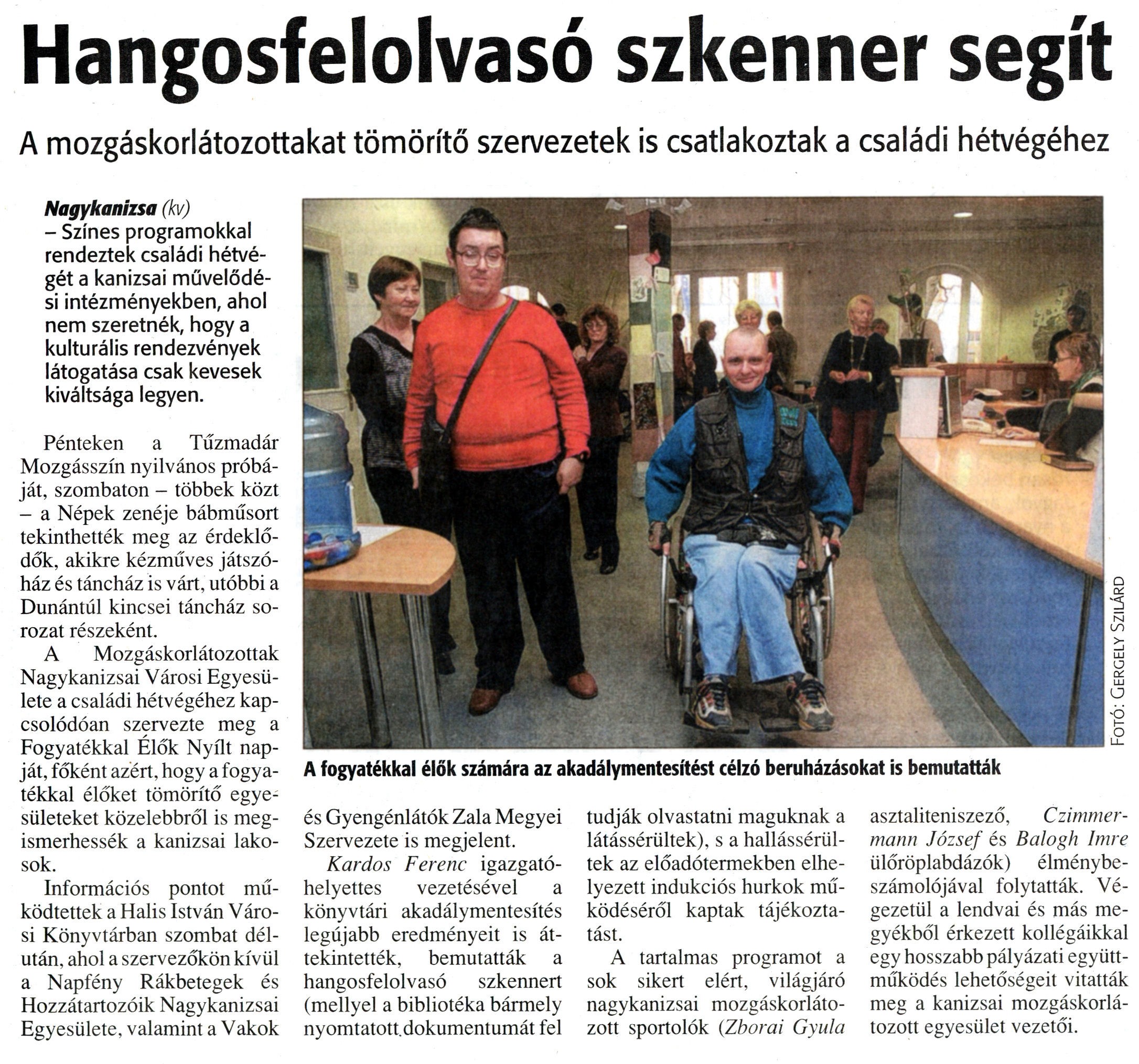 Nyilvános 1807 | 4917 | Zalai Hírlap 2010. november 23. 272. szám 11. oldal - Hangosfelolvasó szkenner segít | A cikk szövege: Hangosfelolvasó szkenner segít A mozgáskorlátozottakat tömörítő szervezetek is csatlakoztak a családi hétvégéhez A fogyatékkal élők számára az akadálymentesítést célzó beruházásokat is bemutatták Nagykanizsa (kv) - Színes programokkal rendeztek családi hétvégét a kanizsai művelődési intézményekben, ahol nem szeretnék, hogy a kulturális rendezvények látogatása csak kevesek kiváltsága legyen. Pénteken a Tűzmadár Mozgásszín nyilvános próbáját, szombaton - többek közt - a Népek zenéje bábműsort tekinthették meg az érdeklődők, akikre kézműves játszóház és táncház is várt, utóbbi a Dunántúl kincsei táncház sorozat részeként. A Mozgáskorlátozottak Nagykanizsai Városi Egyesülete a családi hétvégéhez kapcsolódóan szervezte meg a Fogyatékkal Élők Nyílt napját, főként azért, hogy a fogyatékkal élőket tömörítő egyesületeket közelebbről is megismerhessék a kanizsai lakosok. Információs pontot működtettek a Halis István Városi Könyvtárban szombat délután, ahol a szervezőkön kívül a Napfény Rákbetegek és Hozzátartozóik Nagykanizsai Egyesülete, valamint a Vakok és Gyengénlátók Zala Megyei Szervezete is megjelent. Kardos Ferenc igazgatóhelyettes vezetésével a könyvtári akadálymentesítés legújabb eredményeit is áttekintették, bemutatták a hangosfelolvasó szkennert (mellyel a bibliotéka bármely nyomtatott, dokumentumát fel tudják olvastatni maguknak a látássérültek), s a hallássérültek az előadótermekben elhelyezett indukciós hurkok működéséről kaptak tájékoztatást. A tartalmas programot a sok sikert elért, világjáró nagykanizsai mozgáskorlátozott sportolók (Zborai Gyula asztaliteniszező, Czimmer-mann József és Balogh Imre ülőröplabdázók) élménybeszámolójával folytatták. Végezetül a lendvai és más megyékből érkezett kollégáikkal egy hosszabb pályázati együttműködés lehetőségeit vitatták meg a kanizsai mozgáskorlátozott egyesület vezetői. |