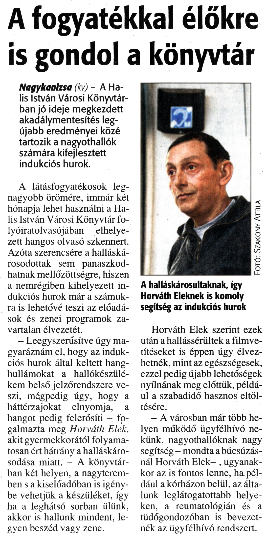 Nyilvános 1755 | 4648 | Zalai Hírlap 2011. január 14. 11. szám 11. oldal - A fogyatékkal élőkre is gondol a könyvtár | A cikk szövege: A fogyatékkal élőkre is gondol a könyvtár Nagykanizsa (kv) - A Halis István Városi Könyvtárban jó ideje megkezdett akadálymentesítés legújabb eredményei közé tartozik a nagyothallók számára kifejlesztett indukciós hurok. A látásfogyatékosok legnagyobb örömére, immár két hónapja lehet használni a Halis István Városi Könyvtár folyóiratolvasójában elhelyezett hangos olvasó szkennert. Azóta szerencsére a halláskárosodottak sem panaszkodhatnak mellőzöttségre, hiszen a nemrégiben kihelyezett indukciós hurok már a számukra is lehetővé teszi az előadások és zenei programok zavartalan élvezetét. - Leegyszerűsítve úgy magyaráznám el, hogy az indukciós hurok által keltett hanghullámokat a hallókészülékem belső jelzőrendszere veszi, mégpedig úgy, hogy a háttérzajokat elnyomja, a hangot pedig felerősíti - fogalmazta meg Horváth Elek, akit gyermekkorától folyamatosan ért hátrány a halláskárosodása miatt. - A könyvtárban két helyen, a nagyteremben s a kiselőadóban is igénybe vehetjük a készüléket, így ha a leghátsó sorban ülünk, akkor is hallunk mindent, legyen beszéd vagy zene. A halláskárosultaknak, így Horváth Eleknek is komoly segítség az indukciós hurok Horváth Elek szerint ezek után a hallássérültek a filmvetítéseket is éppen úgy élvezhetnék, mint az egészségesek, ezzel pedig újabb lehetőségek nyílnának meg előttük, például a szabadidő hasznos eltöltésére. - A városban már több helyen működő ügyfélhívó nekünk, nagyothallóknak nagy segítség - mondta a búcsúzásnál Horváth Elek –, ugyanakkor az is fontos lenne, ha például a kórházon belül, az általunk leglátogatottabb helyeken, a reumatológián és a tüdőgondozóban is bevezetnék az ügyfélhívó rendszert. Fotó: Szakony Attila |