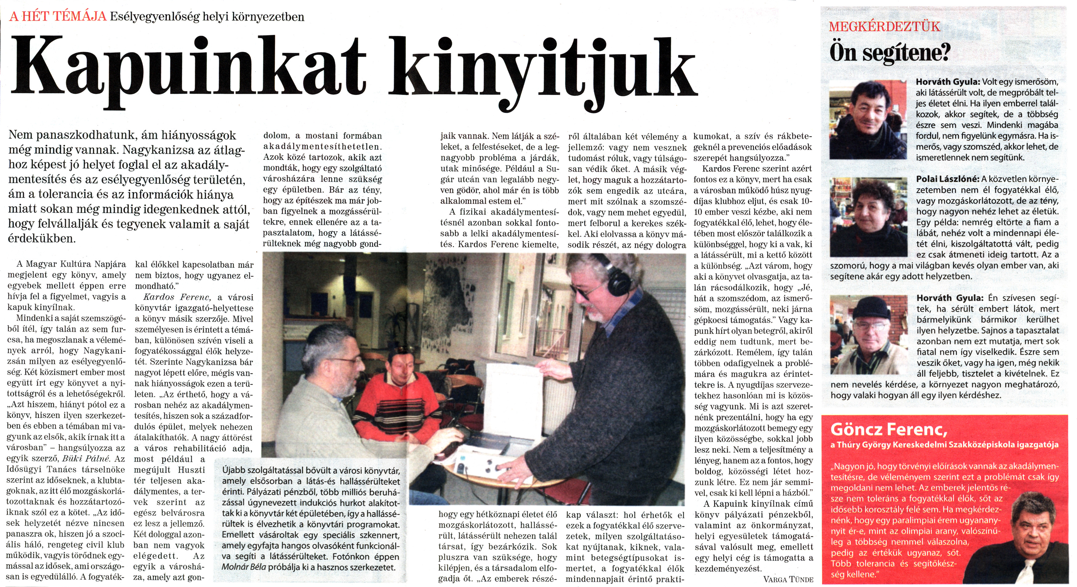 Nyilvános 1840 | 6543 | Nagykanizsai Maraton 2011. január 21. 3. szám 6-7. oldal - Kapuinkat kinyitjuk | A cikk szövege: A HÉT TÉMÁJA Esélyegyenlőség helyi környezetben Kapuinkat kinyitjuk Nem panaszkodhatunk, ám hiányosságok még mindig vannak. Nagykanizsa az átlaghoz képest jó helyet foglal el az akadálymentesítés és az esélyegyenlőség területén, ám a tolerancia és az információk hiánya miatt sokan még mindig idegenkednek attól, hogy felvállalják és tegyenek valamit a saját érdekükben. A Magyar Kultúra Napjára megjelent egy könyv, amely egyebek mellett éppen erre hívja fel a figyelmet, vagyis a kapuk kinyílnak. Mindenki a saját szemszögéből ítél, így talán az sem furcsa, ha megoszlanak a vélemények arról, hogy Nagykanizsán milyen az esélyegyenlőség. Két közismert ember most együtt írt egy könyvet a nyitottságról és a lehetőségekről. „Azt hiszem, hiányt pótol ez a könyv, hiszen ilyen szerkezetben és ebben a témában mi vagyunk az elsők, akik írnak itt a városban" - hangsúlyozza az egyik szerző, Büki Pálné. Az Idősügyi Tanács társelnöke szerint az időseknek, a klubtagoknak, az itt élő mozgáskorlátozottaknak és hozzátartozóiknak szól ez a kötet. „Az idősek helyzetét nézve nincsen panaszra ok. hiszen jó a szociális háló, rengeteg civil klub működik, vagyis törődnek egymással az idősek, ami országosan is egyedülálló. A fogyatékkal élőkkel kapcsolatban már nem biztos, hogy ugyanez elmondható." Kardos Ferenc, a városi könyvtár igazgató-helyettese a könyv másik szerzője. Mivel személyesen is érintett a témában, különösen szívén viseli a fogyatékossággal élők helyzetét. Szerinte Nagykanizsa bár nagyot lépett előre, mégis vannak hiányosságok ezen a területen. „Az érthető, hogy a városban nehéz az akadálymentesítés, hiszen sok a századfordulós épület, melyek nehezen átalakíthatók. A nagy áttörést a város rehabilitáció adja, most például a megújult Huszti tér teljesen akadálymentes, a tervek szerint az egész belvárosra ez lesz a jellemző. Két dologgal azonban nem vagyok elégedett. Az egyik a városháza, amely azt gondolom, a mostani formában akadály mentesít hetet len. Azok közé tartozok, akik azt mondták, hogy egy szolgáltató városházára lenne szükség egy épületben. Bár az tény, hogy az építészek ma már jobban figyelnek a mozgássérültekre, ennek ellenére az a tapasztalatom, hogy a látássérülteknek még nagyobb gondjaik vannak. Nem látják a széleket, a felfestéseket, de a legnagyobb probléma a járdák, utak minősége. Például a Sugár utcán van legalább negyven gödör, ahol már én is több alkalommal estem el." A fizikai akadálymentesítésnél azonban sokkal fontosabb a lelki akadálymentesítés. Kardos Ferenc kiemelte, hogy egy hétköznapi életet élő mozgáskorlátozott, hallássérült, látássérült nehezen talál társat, így bezárkózik. Sok pluszra van szüksége, hogy kilépjen, és a társadalom elfogadja őt. „Az emberek részéről általában két vélemény a jellemző: vagy nem vesznek tudomást róluk, vagy túlságosan védik őket. A másik véglet, hogy maguk a hozzátartozók sem engedik az utcára, mert mit szólnak a szomszédok, vagy nem mehet egyedül, mert felborul a kerekes székkel. Aki elolvassa a könyv második részét, az négy dologra kap választ: hol érhetők el ezek a fogyatékkal élő szervezetek, milyen szolgáltatásokat nyújtanak, kiknek, valamint betegségtípusokat ismertet, a fogyatékkal élők mindennapjait érintő praktikumokat, a szív és rákbetegeknél a prevenciós előadások szerepét hangsúlyozza." Kardos Ferenc szerint azért fontos ez a könyv, mert ha csak a városban működő húsz nyugdíjas klubhoz eljut, és csak 10-10 ember veszi kézbe, aki nem fogyatékkal élő, lehet, hogy életében most először találkozik a különbséggel, hogy ki a vak, ki a látássérült, mi a kettő között a különbség. „Azt várom, hogy aki a könyvet olvasgatja, az talán rácsodálkozik, hogy „Jé, hát a szomszédom, az ismerősöm, mozgássérült, neki járna gépkocsi támogatás." Vagy kapunk hírt olyan betegről, akiről eddig nem tudtunk, mert bezárkózott. Remélem, így talán többen odafigyelnek a problémára és magukra az érintettekre is. A nyugdíjas szervezetekhez hasonlóan mi is közösség vagyunk. Mi is azt szeretnénk prezentálni, hogy ha egy mozgáskorlátozott bemegy egy ilyen közösségbe, sokkal jobb lesz neki. Nem a teljesítmény a lényeg, hanem az a fontos, hogy boldog, közösségi létet hozzunk létre. Ez nem jár semmivel, csak ki kell lépni a házból." A Kapuink kinyílnak című könyv pályázati pénzekből, valamint az önkormányzat, helyi egyesületek támogatásával valósult meg, emellett egy helyi cég is támogatta a kezdeményezést. Varga Tünde Újabb szolgáltatással bővült a városi könyvtár, amely elsősorban a látás-és hallássérülteket érinti. Pályázati pénzből, több milliós beruházással úgynevezett indukciós hurkot alakítottak kl a könyvtár két épületében, így a hallássérültek is élvezhetik a könyvtári programokat. Emellett vásároltak egy speciális szkennert, amely egyfajta hangos olvasóként funkcionálva segíti a látássérülteket. Fotónkon éppen Molnár Béla próbálja kl a hasznos szerkezetet. MEGKÉRDEZTÜK Ön segítene? Horváth Gyula: Volt egy Ismerősöm, aki látássérült volt, de megpróbált teljes életet élni. Ha ilyen emberrel találkozok, akkor segítek, de a többség észre sem veszi. Mindenki magába fordul, nem figyelünk egymásra. Ha ismerős, vagy szomszéd, akkor lehet, de ismeretlennek nem segítünk. Polai Lászlóné: A közvetlen környezetemben nem él fogyatékkal élő, vagy mozgáskorlátozott, de az tény, hogy nagyon nehéz lehet az életük. Egy példa: nemrég 