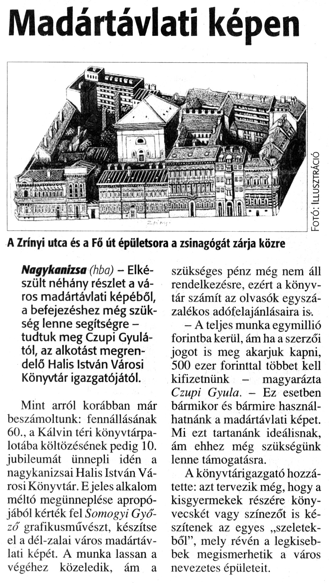 Nyilvános 1758 | 5091 | Zalai Hírlap 2011. február 16. 39. szám 7. oldal - Madártávlati képen | A cikk szövege: Madártávlati képen A Zrínyi utca és a Fő út épületsora a zsinagógát zárja közre Nagykanizsa (hba) - Elkészült néhány részlet a város madártávlati képéből, a befejezéshez még szükség lenne segítségre -tudtuk meg Czupi Gyulától, az alkotást megrendelő Halis István Városi Könyvtár igazgatójától. Mint arról korábban már beszámoltunk: fennállásának 60., a Kálvin téri könyvtárpalotába költözésének pedig 10. jubileumát ünnepli idén a nagykanizsai Halis István Városi Könyvtár. E jeles alkalom méltó megünneplése apropójából kérték fel Somogyi Győző grafikusművészt, készítse el a dél-zalai város madártávlati képét. A munka lassan a végéhez közeledik, ám a szükséges pénz még nem áll rendelkezésre, ezért a könyvtár számít az olvasók egyszázalékos adófelajánlásaira is. - A teljes munka egymillió forintba kerül, ám ha a szerzői jogot is meg akarjuk kapni, 500 ezer forinttal többet kell kifizetnünk - magyarázta Czupi Gyula. - Ez esetben bármikor és bármire használhatnánk a madártávlati képet. Mi ezt tartanánk ideálisnak, ám ehhez még szükségünk lenne támogatásra. A könyvtárigazgató hozzátette: azt tervezik még, hogy a kisgyermekek részére könyvecskét vagy színezőt is készítenek az egyes „szeletekből", mely révén a legkisebbek megismerhetik a város nevezetes épületeit. Fotó: Illusztráció |