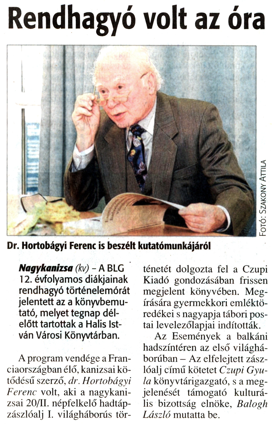 Nyilvános 1818 | 5152 | Zalai Hírlap 2011. március 23. 68. szám 3. oldal - Rendhagyó volt az óra | A cikk szövege: Rendhagyó volt az óra Dr. Hortobágyi Ferenc is beszélt kutatómunkájáról Nagykanizsa (kv) - A BLG 12. évfolyamos diákjainak rendhagyó történelemórát jelentett az a könyvbemutató, melyet tegnap délelőtt tartottak a Halis István Városi Könyvtárban. A program vendége a Franciaországban élő, kanizsai kötődésű szerző, dr. Hortobágyi Ferenc volt, aki a nagykanizsai 20/II. népfelkelő hadtápzászlóalj I. világháborús történetét dolgozta fel a Czupi Kiadó gondozásában frissen megjelent könyvében. Megírására gyermekkori emléktöredékei s nagyapja tábori postai levelezőlapjai indították. Az Események a balkáni hadszíntéren az első világháborúban - Az elfelejtett zászlóalj című kötetet Czupi Gyula könyvtárigazgató, s a megjelenését támogató kulturális bizottság elnöke, Balogh László mutatta be. Fotó: Szakony Attila |