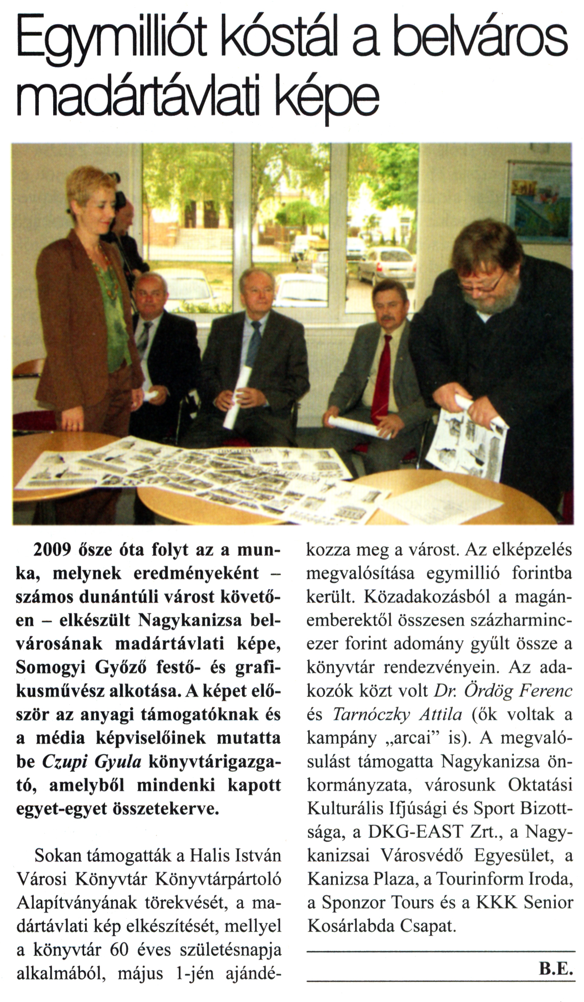 Nyilvános 2419 | 8012 | Kanizsa 2011. április 28. 16. szám 5. oldal - Egymilliót kóstál a belváros madártávlati képe | A cikk szövege: Egymilliót kóstál a belváros madártávlati képe 2009 ősze óta folyt az a munka, melynek eredményeként -számos dunántúli várost követően - elkészült Nagykanizsa belvárosának madártávlati képe, Somogyi Győző festő- és grafikusművész alkotása. A képet először az anyagi támogatóknak és a média képviselőinek mutatta be Czupi Gyula könyvtárigazgató, amelyből mindenki kapott egyet-egyet összetekerve. Sokan támogatták a Halis István Városi Könyvtár Könyvtárpártoló Alapítványának törekvését, a madártávlati kép elkészítését, mellyel a könyvtár 60 éves születésnapja alkalmából, május l-jén ajándékozza meg a várost. Az elképzelés megvalósítása egymillió forintba került. Közadakozásból a magánemberektől összesen százharmincezer forint adomány gyűlt össze a könyvtár rendezvényein. Az adakozók közt volt Dr. Ördög Ferenc és Tarnóczky Attila (ők voltak a kampány „arcai" is). A megvalósulást támogatta Nagykanizsa önkormányzata, városunk Oktatási Kulturális Ifjúsági és Sport Bizottsága, a DKG-EAST Zrt, a Nagykanizsai Városvédő Egyesület, a Kanizsa Plaza, a Tourinform Iroda, a Sponzor Tours és a KKK Senior Kosárlabda Csapat. B.E. |