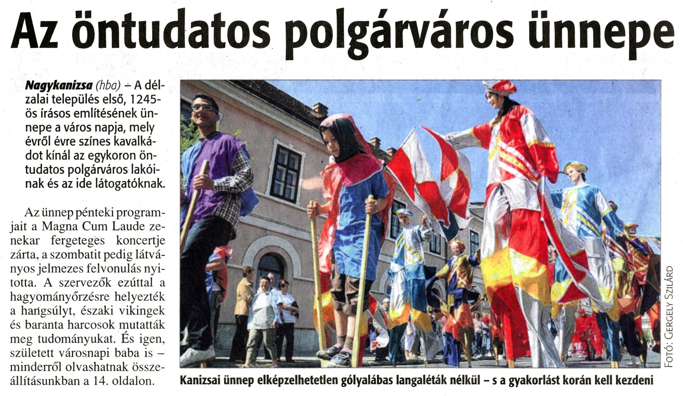 Nyilvános 1794 | 4845 | Zalai Hírlap 2011. május 16. 113. szám 1. oldal - Az öntudatos polgárváros ünnepe | A cikk szövege: Az öntudatos polgárváros ünnepe Nagykanizsa (hba) - A délzalai település első, 1245-ös írásos említésének ünnepe a város napja, mely évről évre színes kavalkádot kínál az egykoron öntudatos polgárváros lakóinak és az ide látogatóknak. Az ünnep pénteki programjait a Magna Cum Laude zenekar fergeteges koncertje zárta, a szombatit pedig látványos jelmezes felvonulás nyitotta. A szervezők ezúttal a hagyományőrzésre helyezték a hangsúlyt, északi vikingek és baranta harcosok mutatták meg tudományukat. És igen, született városnapi baba is - minderről olvashatnak összeállításunkban a 14. oldalon. Kanizsai ünnep elképzelhetetlen gólyalábas langaléták nélkül - s a gyakorlást korán kell kezdeni |