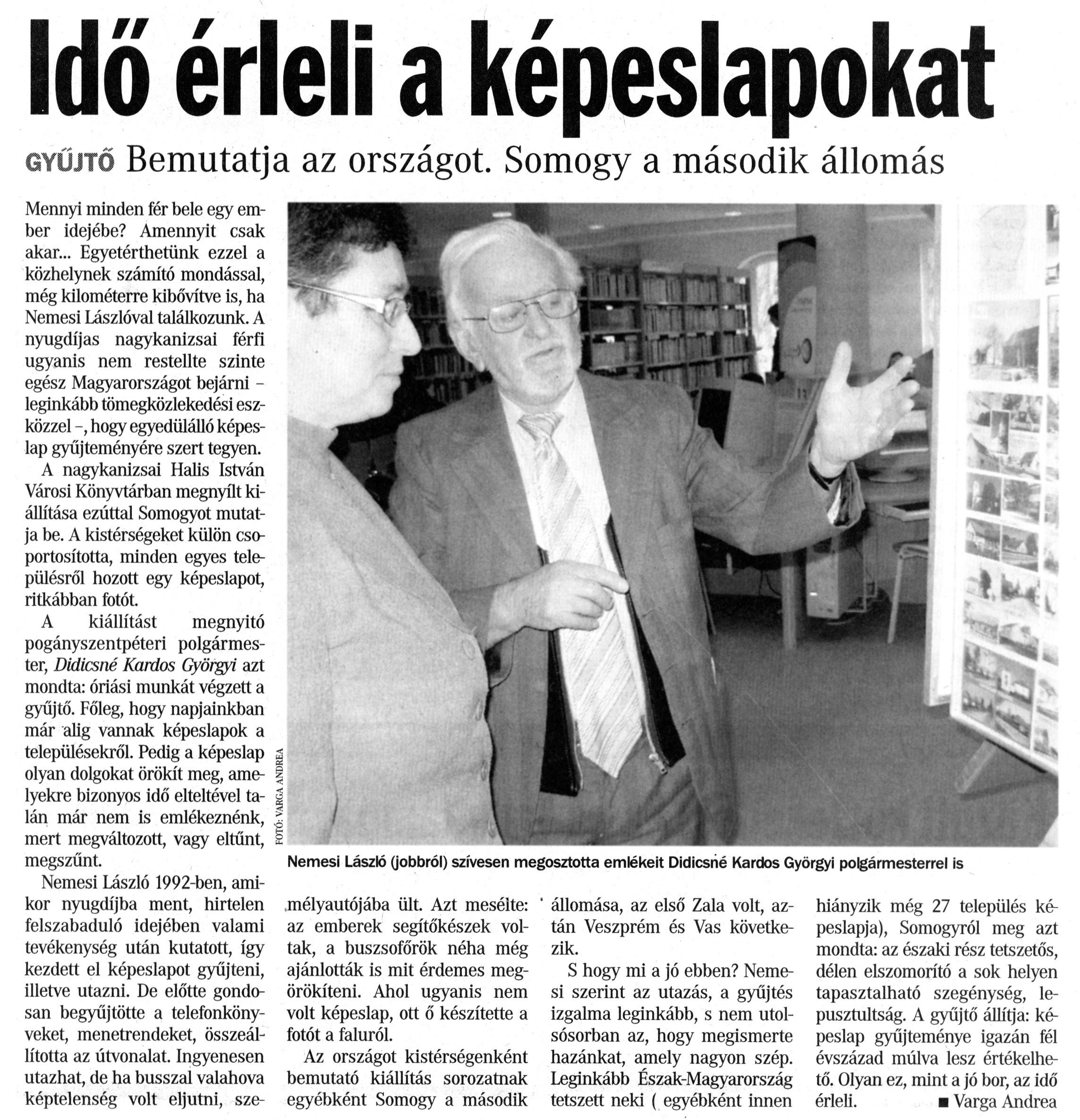 Nyilvános 1685 | 4795 | Somogyi Hírlap 2011. február 5. 30. szám 14. oldal - Idő érleli a képeslapokat | A cikk szövege: Idő érleli a képeslapokat gyűjtő Bemutatja az országot. Somogy a második állomás Nemesi László (jobbról) szívesen megosztotta emlékeit Didicsné Kardos Györgyi polgármesterrel is Mennyi minden fér bele egy ember idejébe? Amennyit csak akar... Egyetérthetünk ezzel a közhelynek számító mondással, még kilométerre kibővítve is, ha Nemesi Lászlóval találkozunk. A nyugdíjas nagykanizsai férfi ugyanis nem restellte szinte egész Magyarországot bejárni -leginkább tömegközlekedési eszközzel hogy egyedülálló képeslap gyűjteményére szert tegyen. A nagykanizsai Halis István Városi Könyvtárban megnyílt kiállítása ezúttal Somogyot mutatja be. A kistérségeket külön csoportosította, minden egyes településről hozott egy képeslapot, ritkábban fotót. A kiállítást megnyitó pogányszentpéteri polgármester, Didicsné Kardos Györgyi azt mondta: óriási munkát végzett a gyűjtő. Főleg, hogy napjainkban már alig vannak képeslapok a településekről. Pedig a képeslap olyan dolgokat örökít meg, amelyekre bizonyos idő elteltével talán már nem is emlékeznénk, mert megváltozott, vagy eltűnt, megszűnt. Nemesi László 1992-ben, amikor nyugdíjba ment, hirtelen felszabaduló idejében valami tevékenység után kutatott, így kezdett el képeslapot gyűjteni, illetve utazni. De előtte gondosan begyűjtötte a telefonkönyveket, menetrendeket, összeállította az útvonalat. Ingyenesen utazhat, de ha busszal valahova képtelenség volt eljutni, személyautójába ült. Azt mesélte: az emberek segítőkészek voltak, a buszsofőrök néha még ajánlották is mit érdemes megörökíteni. Ahol ugyanis nem volt képeslap, ott ő készítette a fotót a faluról. Az országot kistérségenként bemutató kiállítás sorozatnak egyébként Somogy a második állomása, az első Zala volt, aztán Veszprém és Vas következik. S hogy mi a jó ebben? Nemesi szerint az utazás, a gyűjtés izgalma leginkább, s nem utolsósorban az, hogy megismerte hazánkat, amely nagyon szép. Leginkább Észak-Magyarország tetszett neki (egyébként innen hiányzik még 27 település képeslapja), Somogyról meg azt mondta: az északi rész tetszetős, délen elszomorító a sok helyen tapasztalható szegénység, le-pusztultság. A gyűjtő állítja: képeslap gyűjteménye igazán fél évszázad múlva lesz értékelhető. Olyan ez, mint a jó bor, az idő érleli. Varga Andrea |