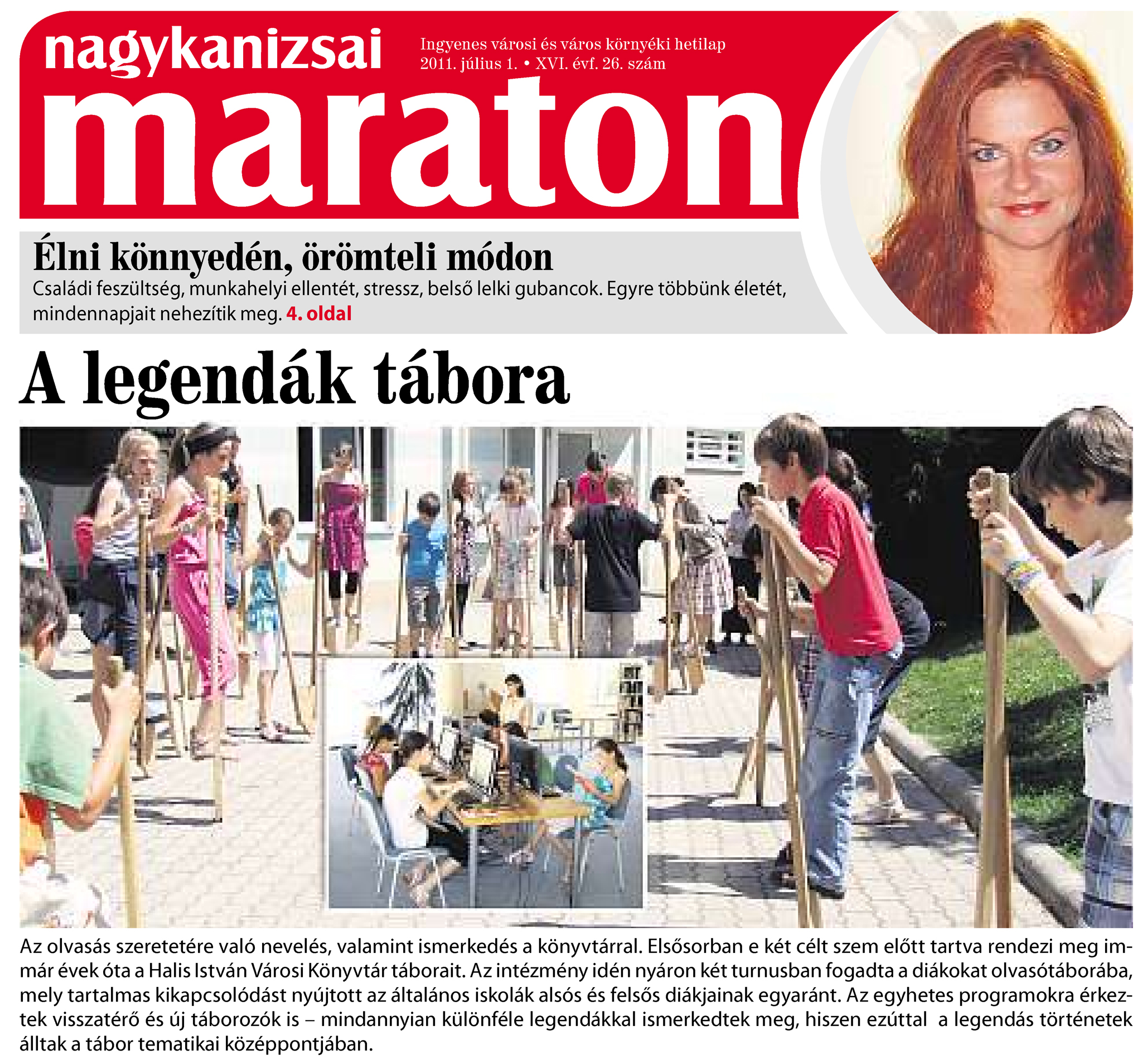 Nyilvános 2072 | 7734 | Nagykanizsai Maraton 2011. július 1. 26. szám 1. oldal - A legendák tábora | A legendák tábora Az olvasás szeretetére való nevelés, valamint ismerkedés a könyvtárral. Elsősorban e két célt szem előtt tartva rendezi meg immár évek óta a Halis István Városi Könyvtár táborait. Az intézmény idén nyáron két turnusban fogadta a diákokat olvasótáborába, mely tartalmas kikapcsolódást nyújtott az általános iskolák alsós és felsős diákjainak egyaránt. Az egyhetes programokra érkeztek visszatérő és új táborozók is – mindannyian különféle legendákkal ismerkedtek meg, hiszen ezúttal a legendás történetek álltak a tábor tematikai középpontjában. |