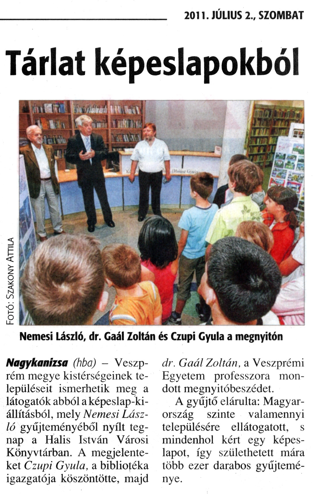Nyilvános 1707 | 4803 | Zalai Hírlap 2011. július 2. 153. szám 16. oldal - Tárlat képeslapokból | A cikk szövege: Tárlat képeslapokból Nemesi László, dr. Gaál Zoltán és Czupi Gyula a megnyitón Nagykanizsa (hba) - Veszprém megye kistérségeinek településeit ismerhetik meg a látogatók abból a képeslap-kiállításból, mely Nemesi László gyűjteményéből nyílt tegnap a Halis István Városi Könyvtárban. A megjelenteket Czupi Gyula, a bibliotéka igazgatója köszöntötte, majd dr. Gaál Zoltán, a Veszprémi Egyetem professzora mondott megnyitóbeszédet. A gyűjtő elárulta: Magyarország szinte valamennyi településére ellátogatott, s mindenhol kért egy képeslapot, így születhetett mára több ezer darabos gyűjteménye. |