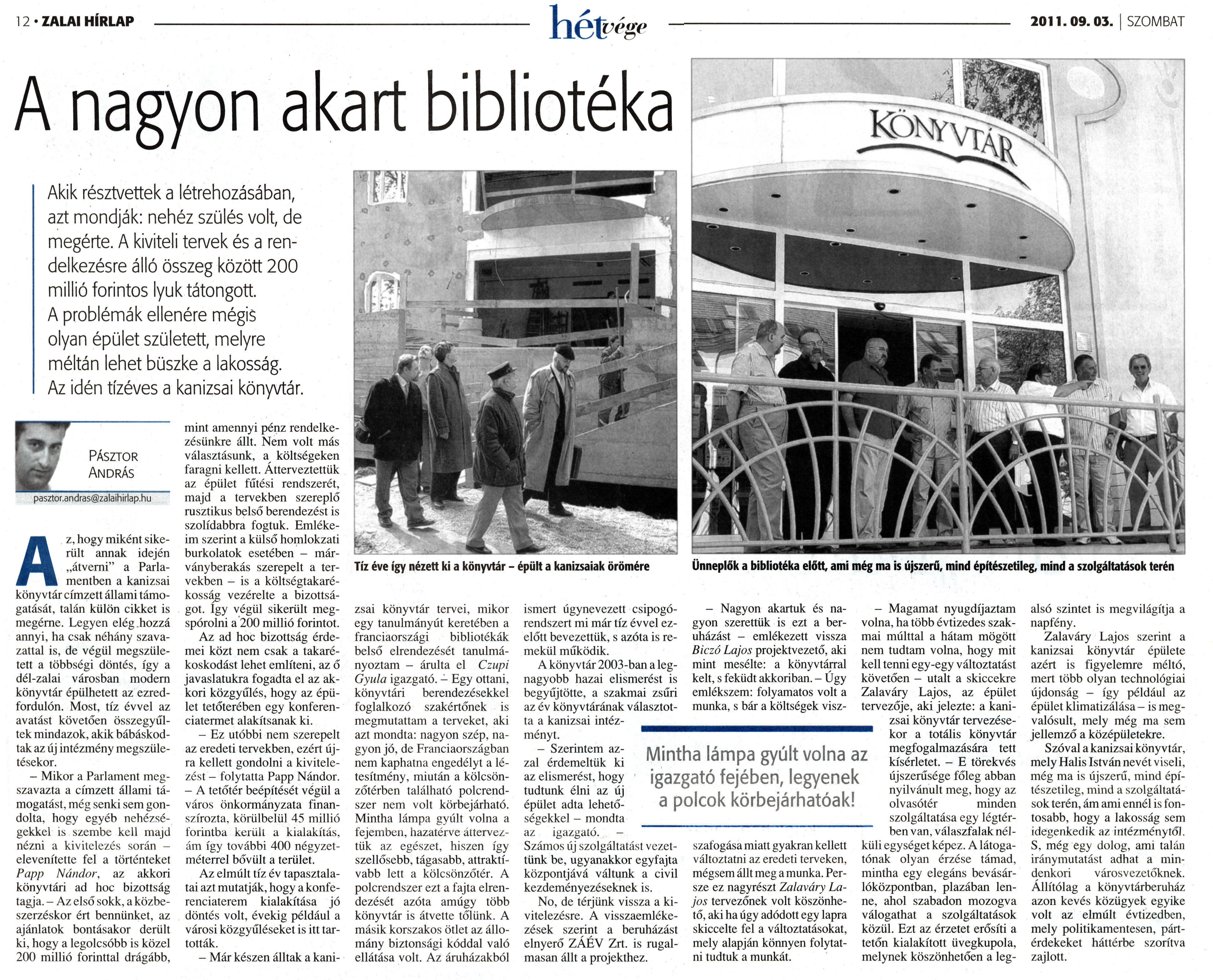 Nyilvános 2143 | 6862 | Zalai Hírlap 2011. szeptember 3. 206. szám 12. oldal - A nagyon akart bibliotéka | 12 ZALAI HÍRLAP 2011.09.03. SZOMBAT A nagyon akart bibliotéka Akik résztvettek a létrehozásában, azt mondják: nehéz szülés volt, de megérte. A kiviteli tervek és a rendelkezésre álló összeg között 200 millió forintos lyuk tátongott. A problémák ellenére mégis olyan épület született, melyre méltán lehet büszke a lakosság. Az idén tízéves a kanizsai könyvtár. Az, hogy miként sikerült annak idején „átverni" a Parlamentben a kanizsai könyvtár címzett állami támogatását, talán külön cikket is megérne. Legyen elég hozzá annyi, ha csak néhány szavazattal is, de végül megszületett a többségi döntés, így a dél-zalai városban modern könyvtár épülhetett az ezredfordulón. Most, tíz évvel az avatást követően összegyűltek mindazok, akik bábáskodtak az új intézmény megszületésekor. - Mikor a Parlament megszavazta a címzett állami támogatást, még senki sem gondolta, hogy egyéb nehézségekkel is szembe kell majd nézni a kivitelezés során - elevenítette fel a történteket Papp Nándor, az akkori könyvtári ad hoc bizottság tagja. - Az első sokk, a közbeszerzéskor ért bennünket, az ajánlatok bontásakor derült ki, hogy a legolcsóbb is közel 200 millió forinttal drágább, mint amennyi pénz rendelkezésünkre állt. Nem volt más választásunk, a költségeken faragni kellett. Átterveztettük az épület fűtési rendszerét, majd a tervekben szereplő rusztikus belső berendezést is szolidabbra fogtuk. Emlékeim szerint a külső homlokzati burkolatok esetében - márványberakás szerepelt a tervekben - is a költségtakarékosság vezérelte a bizottságot, így végül sikerült megspórolni a 200 millió forintot. Az ad hoc bizottság érdemei közt nem csak a takarékoskodást lehet említeni, az ő javaslatukra fogadta el az akkori közgyűlés, hogy az épület tetőterében egy konferenciatermet alakítsanak ki. - Ez utóbbi nem szerepelt az eredeti tervekben, ezért újra kellett gondolni a kivitelezést - folytatta Papp Nándor. - A tetőtér beépítését végül a város önkormányzata finanszírozta, körülbelül 45 millió forintba került a kialakítás, ám így további 400 négyzetméterrel bővült a terület. Az elmúlt tíz év tapasztalatai azt mutatják, hogy a konferenciaterem kialakítása jó döntés volt, évekig például a városi közgyűléseket is itt tartották. - Már készen álltak a kanizsai könyvtár tervei, mikor egy tanulmányút keretében a franciaországi bibliotékák belső elrendezését tanulmányoztam - árulta el Czupi Gyula igazgató. - Egy ottani, könyvtári berendezésekkel foglalkozó szakértőnek is megmutattam a terveket, aki azt mondta: nagyon szép, nagyon jó, de Franciaországban nem kaphatna engedélyt a létesítmény, miután a kölcsönzőtérben található polcrendszer nem volt körbejárható. Mintha lámpa gyúlt volna a fejemben, hazatérve átterveztük az egészet, hiszen így szellősebb, tágasabb, attraktívabb lett a kölcsönzőtér. A polcrendszer ezt a fajta elrendezését azóta amúgy több könyvtár is átvette tőlünk. A másik korszakos ötlet az állomány biztonsági kóddal való ellátása volt. Az áruházakból ismert úgynevezett csipogórendszert mi már tíz évvel ezelőtt bevezettük, s azóta is remekül működik. A könyvtár 2003-ban a legnagyobb hazai elismerést is begyűjtötte, a szakmai zsűri az év könyvtárának választotta a kanizsai intézményt. - Szerintem azzal érdemeltük ki az elismerést, hogy tudtunk élni az új épület adta lehetőségekkel - mondta az igazgató. -Számos új szolgáltatást vezettünk be, ugyanakkor egyfajta központjává váltunk a civil kezdeményezéseknek is. No, de térjünk vissza a kivitelezésre. A visszaemlékezések szerint a beruházást elnyerő ZAÉV Zrt. is rugalmasan állt a projekthez. - Nagyon akartuk és nagyon szerettük is ezt a beruházást - emlékezett vissza Biczó Lajos projektvezető, aki mint mesélte: a könyvtárral kelt, s feküdt akkoriban. - Úgy emlékszem: folyamatos volt a munka, s bár a költségek visszafogása miatt gyakran kellett változtatni az eredeti terveken, mégsem állt meg a munka. Persze ez nagyrészt Zalaváry Lajos tervezőnek volt köszönhető, aki ha úgy adódott egy lapra skiccelte fel a változtatásokat, mely alapján könnyen folytatni tudtuk a munkát. - Magamat nyugdíjaztam volna, ha több évtizedes szakmai múlttal a hátam mögött nem tudtam volna, hogy mit kell tenni egy-egy változtatást követően - utalt a skiccekre Zalaváry Lajos, az épület tervezője, aki jelezte: a kanizsai könyvtár tervezésekor a totális könyvtár megfogalmazására tett kísérletet. - E törekvés újszerűsége főleg abban nyilvánult meg, hogy az olvasótér minden szolgáltatása egy légtérben van, válaszfalak nélküli egységet képez. A látogatónak olyan érzése támad, mintha egy elegáns bevásárlóközpontban, plazában lenne, ahol szabadon mozogva válogathat a szolgáltatások közül. Ezt az érzetet erősíti a tetőn kialakított üvegkupola, melynek köszönhetően a legalsó szintet is megvilágítja a napfény. Zalaváry Lajos szerint a kanizsai könyvtár épülete azért is figyelemre méltó, mert több olyan technológiai újdonság - így például az épület klimatizálása - is megvalósult, mely még ma sem jellemző a középületekre. Szóval a kanizsai könyvtár, mely Halis István nevét viseli, még ma is újszerű, mind építészetileg, mind a szolgáltatások terén, ám ami ennél is fontosabb, hogy a lakosság sem idegenkedik az intézménytől. S, még egy dolog, ami talán iránymutatást adhat a mindenkori városvezetőknek. Állítólag a könyvtárberuház azon kevés közügyek egyike volt az elmúlt évtizedben, mely politikamentesen, pá