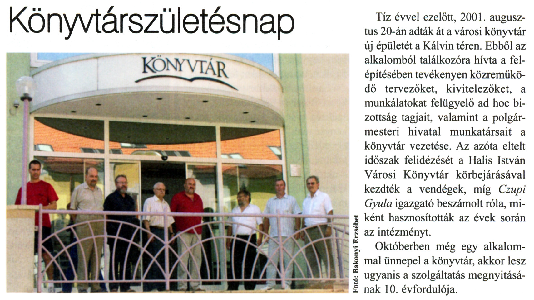 Nyilvános 2724 | 9007 | Kanizsa 2011. szeptember 1. 28. szám 4. oldal - Könyvtárszületésnap | Könyvtárszületésnap Tíz évvel ezelőtt, 2001. augusztus 20-án adták át a városi könyvtár új épületét a Kálvin téren. Ebből az alkalomból találkozóra hívta a felépítésében tevékenyen közreműködő tervezőket, kivitelezőket, a munkálatokat felügyelő ad hoc bizottság tagjait, valamint a polgármesteri hivatal munkatársait a könyvtár vezetése. Az azóta eltelt időszak felidézését a Halis István Városi Könyvtár körbejárásával kezdték a vendégek, míg Czupi Gyula igazgató beszámolt róla, miként hasznosították az évek során az intézményt. Októberben még egy alkalommal ünnepel a könyvtár, akkor lesz ugyanis a szolgáltatás megnyitásának 10. évfordulója. |
