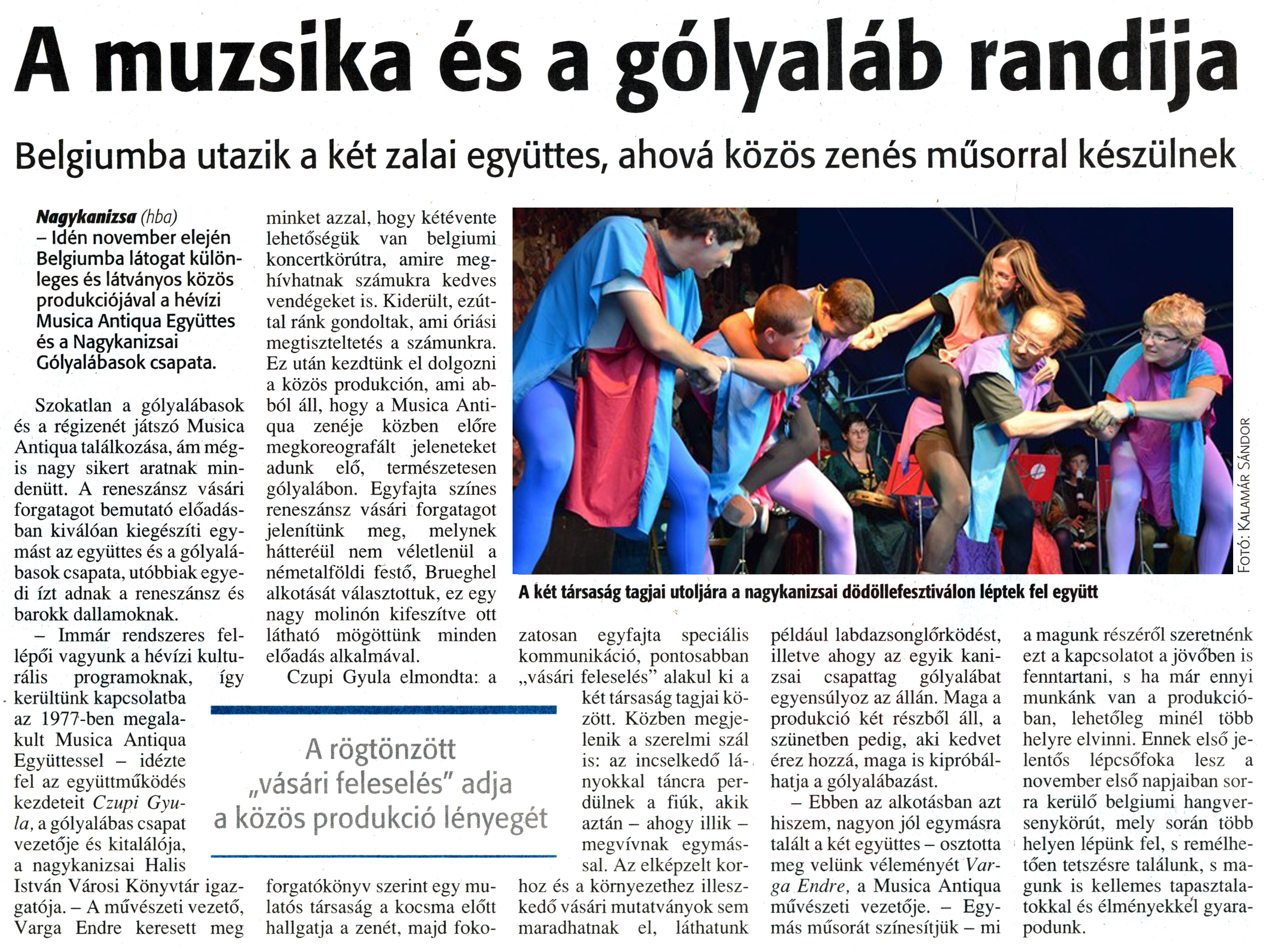 Nyilvános 2239 | 5444 | Zalai Hírlap 2011. szeptember 22. 222. szám 7. oldal - A muzsika és a gólyaláb randija | A muzsika és a gólyaláb randija Belgiumba utazik a két zalai együttes, ahová közös zenés műsorral készülnek A rögtönzött „vásári feleselés" adja a közös produkció lényegét Nagykanizsa (hba) - Idén november elején Belgiumba látogat különleges és látványos közös produkciójával a hévízi Musica Antiqua Együttes és a Nagykanizsai Gólyalábasok csapata. Szokatlan a gólyalábasok és a régizenét játszó Musica Antiqua találkozása, ám mégis nagy sikert aratnak mindenütt. A reneszánsz vásári forgatagot bemutató előadásban kiválóan kiegészíti egymást az együttes és a gólyalábasok csapata, utóbbiak egyedi ízt adnak a reneszánsz és barokk dallamoknak. - Immár rendszeres fellépői vagyunk a hévízi kulturális programoknak, így kerültünk kapcsolatba az 1977-ben megalakult Musica Antiqua Együttessel - idézte fel az együttműködés kezdeteit Czupi Gyula, a gólyalábas csapat vezetője és kitalálója, a nagykanizsai Halis István Városi Könyvtár igazgatója. - A művészeti vezető, Varga Endre keresett meg minket azzal, hogy kétévente lehetőségük van belgiumi koncertkörútra, amire meghívhatnak számukra kedves vendégeket is. Kiderült, ezúttal ránk gondoltak, ami óriási megtiszteltetés a számunkra. Ez után kezdtünk el dolgozni a közös produkción, ami abból áll, hogy a Musica Antiqua zenéje közben előre megkoreografált jeleneteket adunk elő, természetesen gólyalábon. Egyfajta színes reneszánsz vásári forgatagot jelenítünk meg, melynek hátteréül nem véletlenül a németalföldi festő, Brueghel alkotását választottuk, ez egy nagy molinón kifeszítve ott látható mögöttünk minden előadás alkalmával. Czupi Gyula elmondta: a forgatókönyv szerint egy mulatós társaság a kocsma előtt hallgatja a zenét, majd fokozatosan egyfajta speciális kommunikáció, pontosabban „vásári feleselés" alakul ki a két társaság tagjai között. Közben megjelenik a szerelmi szál is: az incselkedő lányokkal táncra perdülnek a fiúk, akik aztán - ahogy illik -megvívnak egymással. Az elképzelt korhoz és a környezethez illeszkedő vásári mutatványok sem maradhatnak el, láthatunk például labdazsonglőrködést, illetve ahogy az egyik kanizsai csapattag gólyalábat egyensúlyoz az állán. Maga a produkció két részből áll, a szünetben pedig, aki kedvet érez hozzá, maga is kipróbálhatja a gólyalábazást. - Ebben az alkotásban azt hiszem, nagyon jól egymásra talált a két együttes - osztotta meg velünk véleményét Varga Endre, a Musica Antiqua művészeti vezetője. - Egymás műsorát színesítjük - mi a magunk részéről szeretnénk ezt a kapcsolatot a jövőben is fenntartani, s ha már ennyi munkánk van a produkcióban, lehetőleg minél több helyre elvinni. Ennek első jelentős lépcsőfoka lesz a november első napjaiban sorra kerülő belgiumi hangversenykörút, mely során több helyen lépünk fel, s remélhetően tetszésre találunk, s magunk is kellemes tapasztalatokkal és élményekkel gyarapodunk. A két társaság tagjai utoljára a nagykanizsai dödöllefesztiválon léptek fel együtt |