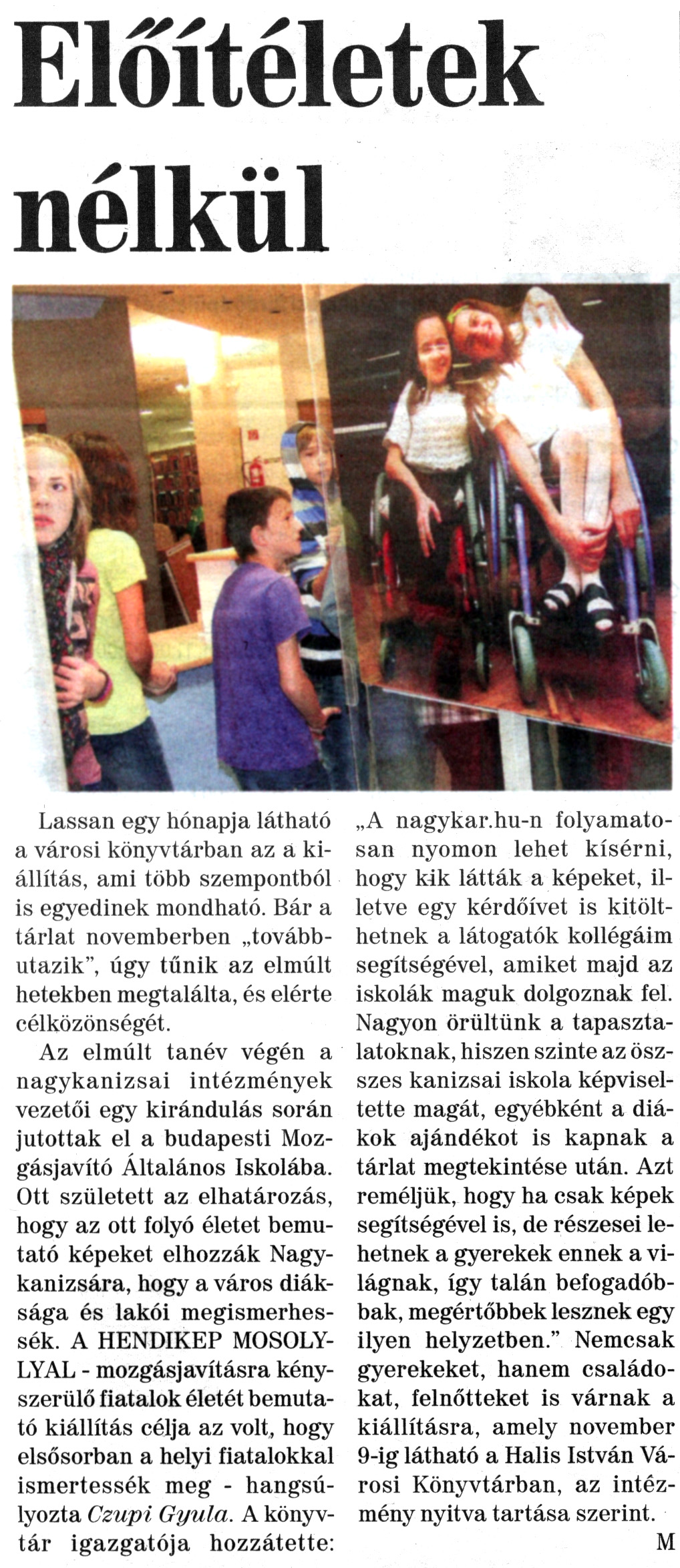 Nyilvános 2273 | 7302 | Nagykanizsai Maraton 2011. október 28. 43. szám 4. oldal - Előítéletek nélkül | A cikk szövege: Előítéletek nélkül Lassan egy hónapja látható a városi könyvtárban az a kiállítás, ami több szempontból is egyedinek mondható. Bár a tárlat novemberben „továbbutazik", úgy tűnik az elmúlt hetekben megtalálta, és elérte célközönségét. Az elmúlt tanév végén a nagykanizsai intézmények vezetői egy kirándulás során jutottak el a budapesti Mozgásjavító Általános Iskolába. Ott született az elhatározás, hogy az ott folyó életet bemutató képeket elhozzák Nagykanizsára, hogy a város diáksága és lakói megismerhessék. A HENDIKEP MOSOLLYAL - mozgásjavításra kényszerülő fiatalok életét bemutató kiállítás célja az volt, hogy elsősorban a helyi fiatalokkal ismertessék meg - hangsúlyozta Czupi Gyula. A könyvtár igazgatója hozzátette: „A nagykar.hu-n folyamatosan nyomon lehet kísérni, hogy kik látták a képeket, illetve egy kérdőívet is kitölthetnek a látogatók kollégáim segítségével, amiket majd az iskolák maguk dolgoznak fel. Nagyon örültünk a tapasztalatoknak, hiszen szinte az összes kanizsai iskola képviseltette magát, egyébként a diákok ajándékot is kapnak a tárlat megtekintése után. Azt reméljük, hogy ha csak képek segítségével is, de részesei lehetnek a gyerekek ennek a világnak, így talán befogadóbbak, megértőbbek lesznek egy ilyen helyzetben." Nemcsak gyerekeket, hanem családokat, felnőtteket is várnak a kiállításra, amely november 9-ig látható a Halis István Városi Könyvtárban, az intézmény nyitva tartása szerint. M |