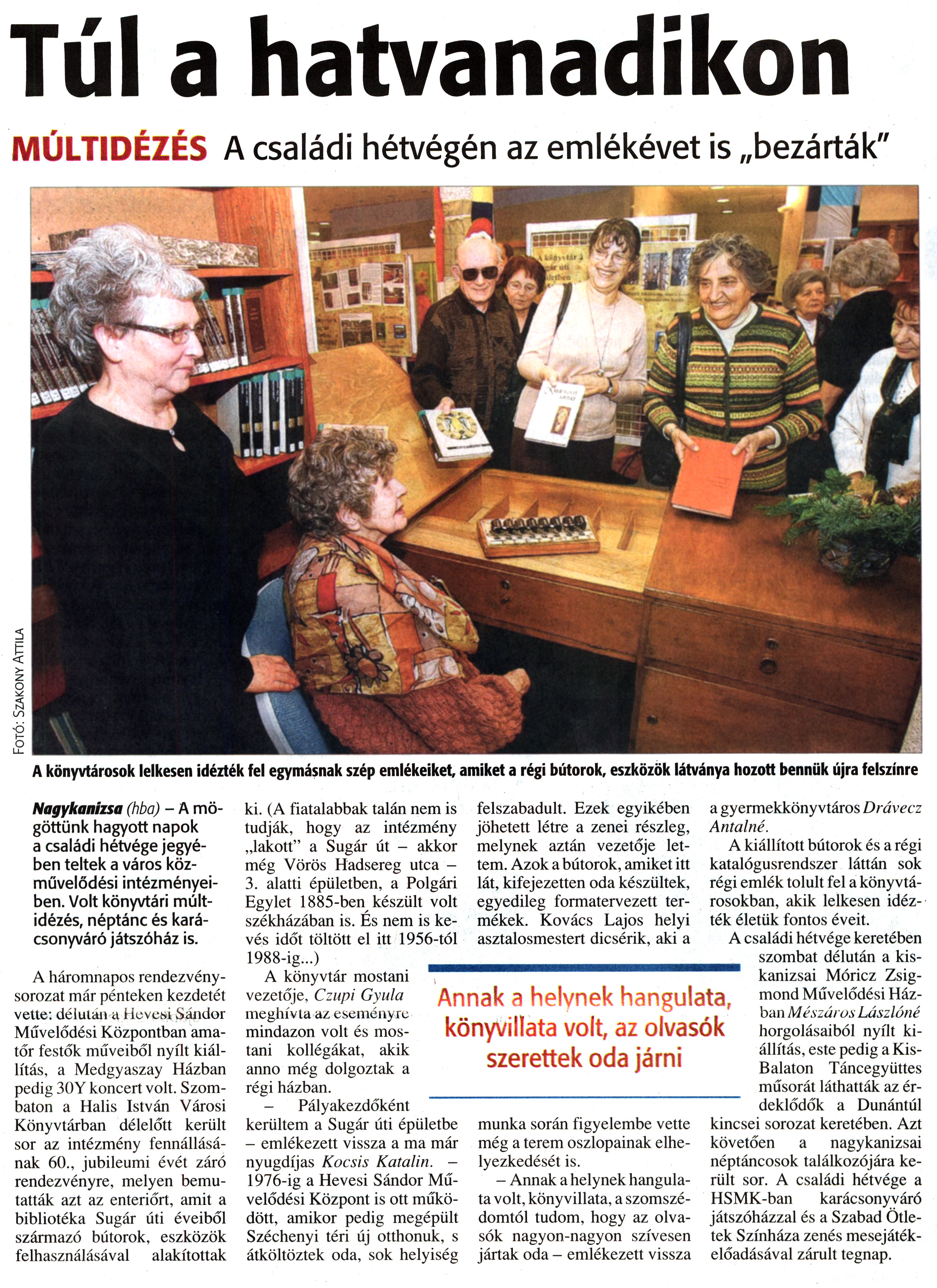 Nyilvános 1793 | 4355 | Zalai Hírlap 2011. december 12. 290. szám 11. oldal - Túl a hatvanadikon | Túl a hatvanadikon MÚLTIDÉZÉS A családi hétvégén az emlékévet is „bezárták" A könyvtárosok lelkesen idézték fel egymásnak szép emlékeiket, amiket a régi bútorok, eszközök látványa hozott bennük újra felszínre Nagykanizsa (hba) - A mögöttünk hagyott napok a családi hétvége jegyében teltek a város közművelődési intézményeiben. Volt könyvtári múltidézés, néptánc és karácsonyváró játszóház is. A háromnapos rendezvénysorozat már pénteken kezdetét vette: délután a Hevesi Sándor Művelődési Központban amatőr festők műveiből nyílt kiállítás, a Medgyaszay Házban pedig 30Y koncert volt. Szombaton a Halis István Városi Könyvtárban délelőtt került sor az intézmény fennállásának 60., jubileumi évét záró rendezvényre, melyen bemutatták azt az enteriőrt, amit a bibliotéka Sugár úti éveiből származó bútorok, eszközök felhasználásával alakítottak ki. (A fiatalabbak talán nem is tudják, hogy az intézmény „lakott" a Sugár út - akkor még Vörös Hadsereg utca -3. alatti épületben, a Polgári Egylet 1885-ben készült volt székházában is. És nem is kevés időt töltött el itt 1956-tól 1988-ig...) A könyvtár mostani vezetője, Czupi Gyula meghívta az eseményre mindazon volt és mostani kollégákat, akik anno még dolgoztak a régi házban. - Pályakezdőként kerültem a Sugár úti épületbe - emlékezett vissza a ma már nyugdíjas Kocsis Katalin. -1976-ig a Hevesi Sándor Művelődési Központ is ott működött, amikor pedig megépült Széchenyi téri új otthonuk, s átköltöztek oda, sok helyiség felszabadult. Ezek egyikében jöhetett létre a zenei részleg, melynek aztán vezetője lettem. Azok a bútorok, amiket itt lát, kifejezetten oda készültek, egyedileg formatervezett termékek. Kovács Lajos helyi asztalosmestert dicsérik, aki a munka során figyelembe vette még a terem oszlopainak elhelyezkedését is. - Annak a helynek hangulata volt, könyvillata, a szomszédomtól tudom, hogy az olvasók nagyon-nagyon szívesen jártak oda - emlékezett vissza a gyermekkönyvtáros Drávecz Antalné. A kiállított bútorok és a régi katalógusrendszer láttán sok régi emlék tolult fel a könyvtárosokban, akik lelkesen idézték életük fontos éveit. A családi hétvége keretében szombat délután a kis-kanizsai Móricz Zsigmond Művelődési Házban Mészáros László/lé horgolásaiból nyílt kiállítás, este pedig a Kis-Balaton Táncegyüttes műsorát láthatták az érdeklődők a Dunántúl kincsei sorozat keretében. Azt követően a nagykanizsai néptáncosok találkozójára került sor. A családi hétvége a HSMK-ban karácsonyváró játszóházzal és a Szabad Ötletek Színháza zenés mesejátékelőadásával zárult tegnap. Fotó: Szakony Attila |