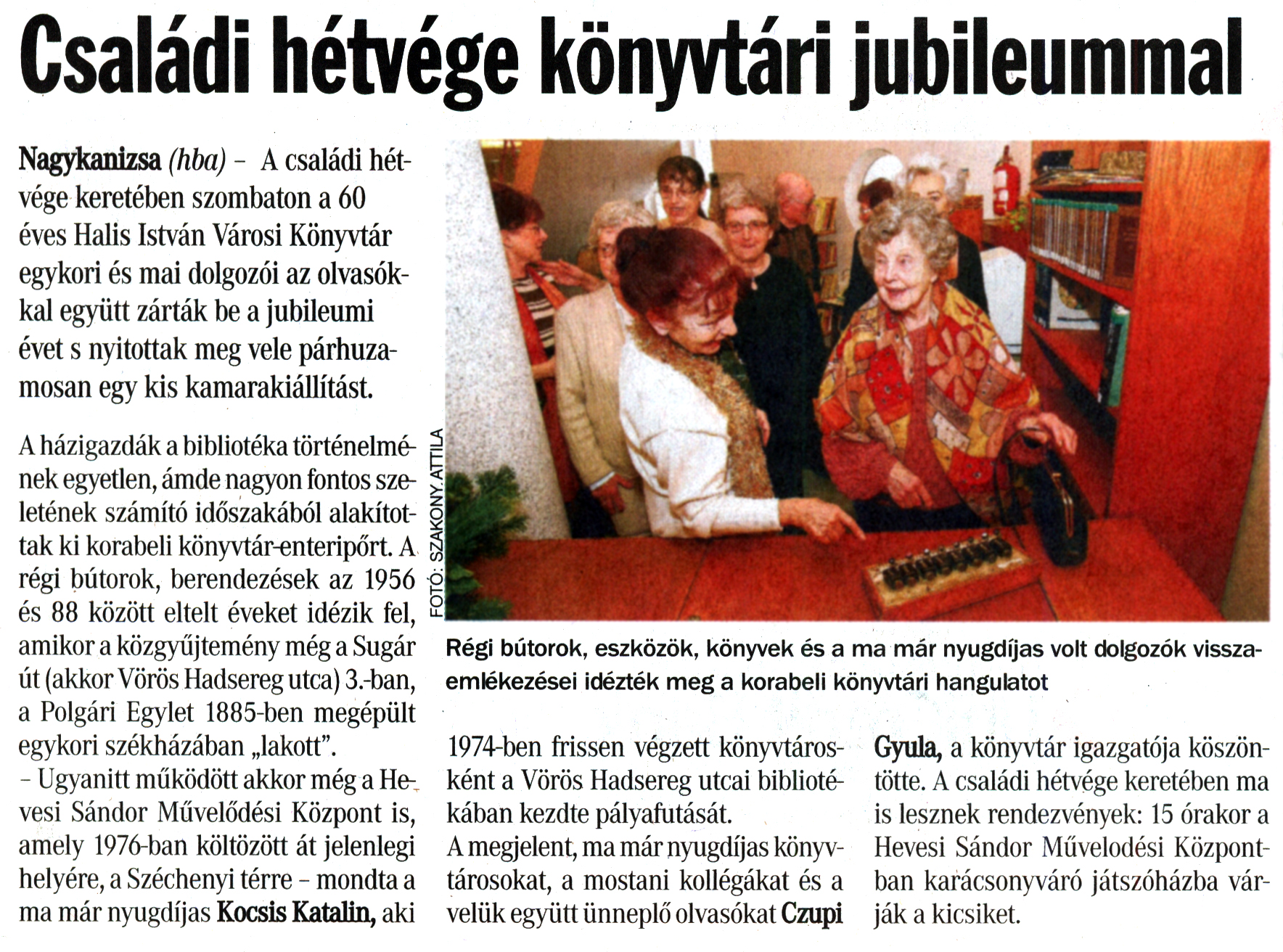 Nyilvános 1772 | 5867 | Vasárnapi Zalai Hírlap 2011. december 11. 48. szám 1. oldal - Családi hétvége könyvtári jubileummal | Családi hétvége könyvtári jubileummal Nagykanizsa (hba) - A családi hétvége keretében szombaton a 60 éves Halis István Városi Könyvtár egykori és mai dolgozói az olvasókkal együtt zárták be a jubileumi évet s nyitottak meg vele párhuzamosan egy kis kamarakiállítást. A házigazdák a bibliotéka történelmének egyetlen, ámde nagyon fontos szeletének számító időszakából alakítottak ki korabeli könyvtár-enteripőrt. A régi bútorok, berendezések az 1956 és 88 között eltelt éveket idézik fel, amikor a közgyűjtemény még a Sugár út (akkor Vörös Hadsereg utca) 3.-ban, a Polgári Egylet 1885-ben megépült egykori székházában „lakott". - Ugyanitt működött akkor még a Hevesi Sándor Művelődési Központ is, amely 1976-ban költözött át jelenlegi helyére, a Széchenyi térre - mondta a ma már nyugdíjas Kocsis Katalin, aki 1974-ben frissen végzett könyvtárosként a Vörös Hadsereg utcai bibliotékában kezdte pályafutását. A megjelent, ma már nyugdíjas könyvtárosokat, a mostani kollégákat és a velük együtt ünneplő olvasókat Czupi Gyula, a könyvtár igazgatója köszöntötte. A családi hétvége keretében ma is lesznek rendezvények: 15 órakor a Hevesi Sándor Művelődési Központban karácsonyváró játszóházba várják a kicsiket. Régi bútorok, eszközök, könyvek és a ma már nyugdíjas volt dolgozók visszaemlékezései idézték meg a korabeli könyvtári hangulatot |