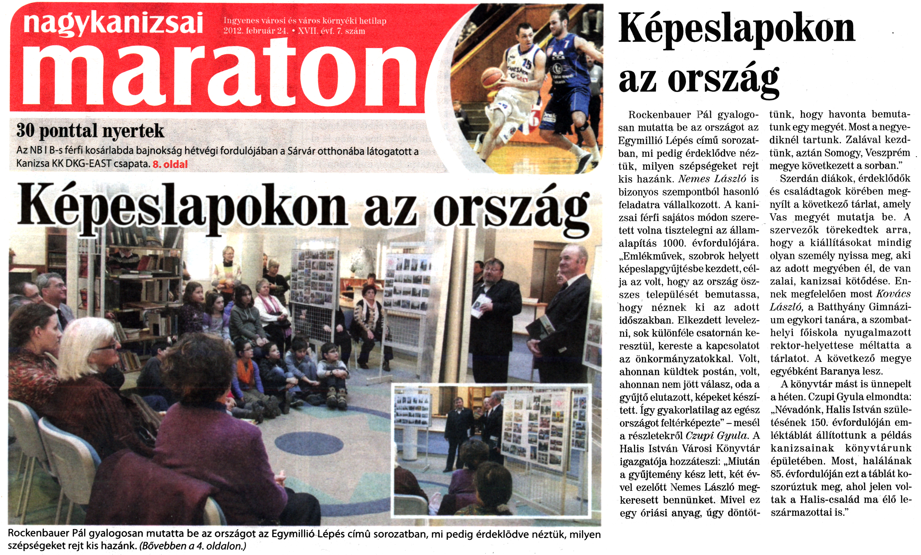 Nyilvános 1913 | 6156 | Nagykanizsai Maraton 2012. február 24. 7. szám 1, 4. oldal - Képeslapokon az ország | Képeslapokon az ország Rockenbauer Pál gyalogosan mutatta be az országot az Egymillió Lépés című sorozatban, mi pedig érdeklődve néztük, milyen szépségeket rejt kis hazánk. Nemes László is bizonyos szempontból hasonló feladatra vállalkozott. A kanizsai férfi sajátos módon szeretett volna tisztelegni az államalapítás 1000. évfordulójára. „Emlékművek, szobrok helyett képeslapgyűjtésbe kezdett, célja az volt, hogy az ország összes települését bemutassa, hogy néznek ki az adott időszakban. Elkezdett levelezni, sok különféle csatornán keresztül, kereste a kapcsolatot az önkormányzatokkal. Volt, ahonnan küldtek postán, volt, ahonnan nem jött válasz, oda a gyűjtő elutazott, képeket készített. Így gyakorlatilag az egész országot feltérképezte" - mesél a részletekről Czupi Gyula. A Halis István Városi Könyvtár igazgatója hozzáteszi: „Miután a gyűjtemény kész lett, két évvel ezelőtt Nemes László megkeresett bennünket. Mivel ez egy óriási anyag, úgy döntöttünk, hogy havonta bemutatunk egy megyét. Most a negyediknél tartunk. Zalával kezdtünk, aztán Somogy, Veszprém megye következett a sorban." Szerdán diákok, érdeklődők és családtagok körében megnyílt a következő tárlat, amely Vas megyét mutatja be. A szervezők törekedtek arra, hogy a kiállításokat mindig olyan személy nyissa meg, aki az adott megyében él, de van zalai, kanizsai kötődése. Ennek megfelelően most Kovács László, a Batthyány Gimnázium egykori tanára, a szombathelyi főiskola nyugalmazott rektor-helyettese méltatta a tárlatot. A következő megye egyébként Baranya lesz. A könyvtár mást is ünnepelt a héten. Czupi Gyula elmondta: „Névadónk, Halis István születésének 150. évfordulóján emléktáblát állítottunk a példás kanizsainak könyvtárunk épületében. Most, halálának 85. évfordulóján ezt a táblát koszorúztuk meg, ahol jelen voltak a Halis-család ma élő leszármazottai is." |