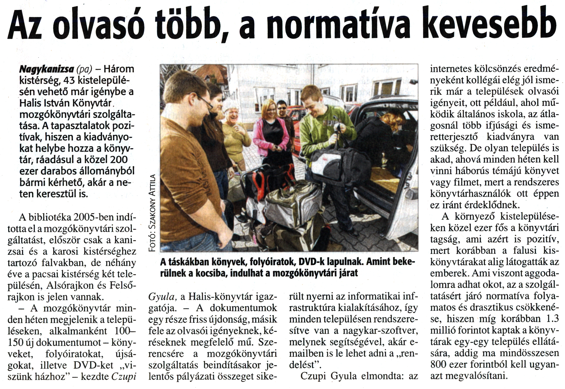 Nyilvános 1715 | 4110 | Zalai Hírlap 2012. március 20. 67. szám 4. oldal - Az olvasó több, a normatíva kevesebb | Az olvasó több, a normatíva kevesebb A táskákban könyvek, folyóiratok, DVD-k lapulnak. Amint bekerülnek a kocsiba, indulhat a mozgókönyvtári járat Nagykanizsa (pa) - Három kistérség, 43 kistelepülésén vehető már igénybe a Halis István Könyvtár mozgókönyvtári szolgáltatása. A tapasztalatok pozitívak, hiszen a kiadványokat helybe hozza a könyvtár, ráadásul a közel 200 ezer darabos állományból bármi kérhető, akár a ne-ten keresztül is. A bibliotéka 2005-ben indította el a mozgókönyvtári szolgáltatást, először csak a kanizsai és a karosi kistérséghez tartozó falvakban, de néhány éve a pacsai kistérség két településén, Alsórajkon és Felsőrajkon is jelen vannak. - A mozgókönyvtár minden héten megjelenik a településeken, alkalmanként 100-150 új dokumentumot - könyveket, folyóiratokat, újságokat, illetve DVD-ket „viszünk házhoz" - kezdte Czupi Fotó: Szakony Attila Gyula, a Halis-könyvtár igazgatója. - A dokumentumok egy része friss újdonság, másik fele az olvasói igényeknek, kéréseknek megfelelő mű. Szerencsére a mozgókönyvtári szolgáltatás beindításakor jelentős pályázati összeget sike- rült nyerni az informatikai infrastruktúra kialakításához, így minden településen rendszeresítve van a nagykar-szoftver, melynek segítségével, akár e-mailben is le lehet adni a „rendelést". Czupi Gyula elmondta: az internetes kölcsönzés eredményeként kollégái elég jól ismerik már a települések olvasói igényeit, ott például, ahol működik általános iskola, az átlagosnál több ifjúsági és ismeretterjesztő kiadványra van szükség. De olyan település is akad, ahová minden héten kell vinni háborús témájú könyvet vagy filmet, mert a rendszeres könyvtárhasználók ott éppen ez iránt érdeklődnek. A környező kistelepüléseken közel ezer fős a könyvtári tagság, ami azért is pozitív, mert korábban a falusi kiskönyvtárakat alig látogatták az emberek. Ami viszont aggodalomra adhat okot, az a szolgáltatásért járó normatíva folyamatos és drasztikus csökkenése, hiszen míg korábban 1.3 millió forintot kaptak a könyvtárak egy-egy település ellátására, addig ma mindösszesen 800 ezer forintból kell ugyanazt megvalósítani. |
