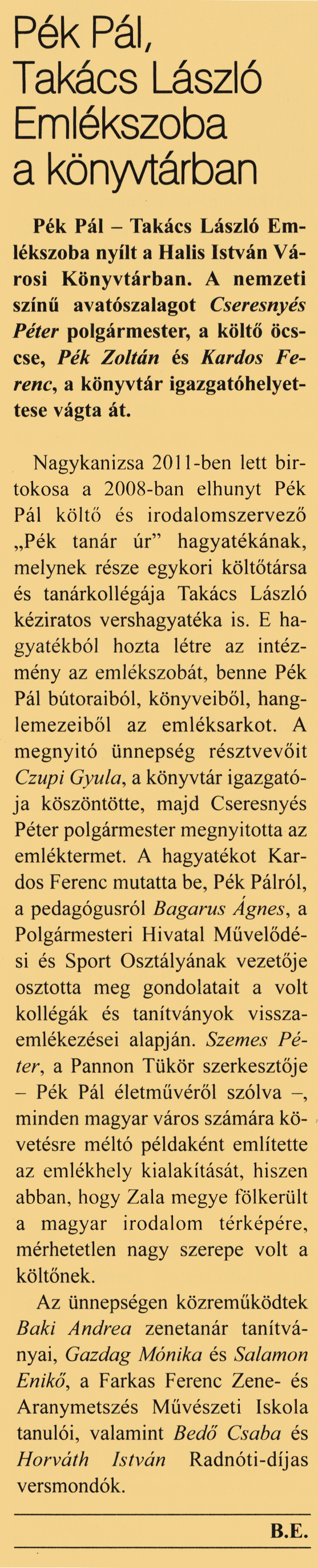 Nyilvános 2134 | 6627 | Kanizsa 2012. április 19. 15. szám 1. oldal - Pék Pál, Takács László Emlékszoba | Pék Pál, Takács László Emlékszoba a könyvtárban Pék Pál - Takács László Emlékszoba nyílt a Halis István Városi Könyvtárban. A nemzeti színű avatószalagot Cseresnyés Péter polgármester, a költő öccse, Pék Zoltán és Kardos Ferenc, a könyvtár igazgatóhelyettese vágta át. Nagykanizsa 2011-ben lett birtokosa a 2008-ban elhunyt Pék Pál költő és irodalomszervező „Pék tanár úr" hagyatékának, melynek része egykori költőtársa és tanárkollégája Takács László kéziratos vershagyatéka is. E hagyatékból hozta létre az intézmény az emlékszobát, benne Pék Pál bútoraiból, könyveiből, hanglemezeiből az emléksarkot. A megnyitó ünnepség résztvevőit Czupi Gyula, a könyvtár igazgatója köszöntötte, majd Cseresnyés Péter polgármester megnyitotta az emléktermet. A hagyatékot Kardos Ferenc mutatta be. Pék Pálról, a pedagógusról Bagarus Ágnes, a Polgármesteri Hivatal Művelődési és Sport Osztályának vezetője osztotta meg gondolatait a volt kollégák és tanítványok visszaemlékezései alapján. Szemes Péter, a Pannon Tükör szerkesztője - Pék Pál életművéről szólva -, minden magyar város számára követésre méltó példaként említette az emlékhely kialakítását, hiszen abban, hogy Zala megye fölkerült a magyar irodalom térképére, mérhetetlen nagy szerepe volt a költőnek. Az ünnepségen közreműködtek Baki Andrea zenetanár tanítványai, Gazdag Mónika és Salamon Enikő, a Farkas Ferenc Zene- és Aranymetszés Művészeti Iskola tanulói, valamint Bedő Csaba és Horváth István Radnóti-díjas versmondók. B.E. |