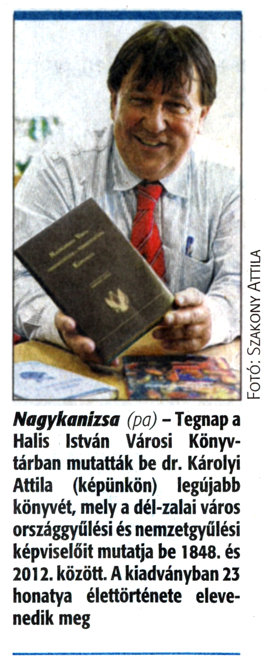 Nyilvános 1711 | 4099 | Zalai Hírlap 2012. június 6. 131. szám 5. oldal - Károlyi Attila könyvbemutató | Nagykanizsa (pa) - Tegnap a Halis István Városi Könyvtárban mutatták be dr. Károlyi Attila (képünkön) legújabb könyvét, mely a dél-zalai város országgyűlési és nemzetgyűlési képviselőit mutatja be 1848. és 2012. között. A kiadványban 23 honatya élettörténete elevenedik meg. |