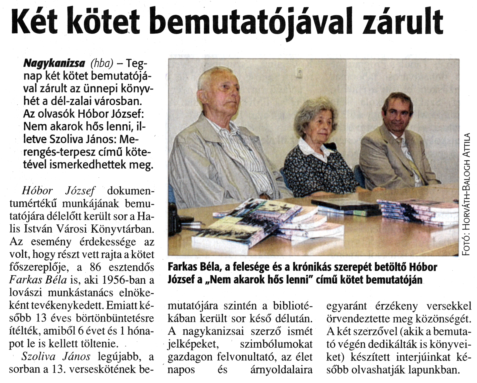 Nyilvános 1582 | 3400 | Zalai Hírlap 2012. június 9. 134. szám 5. oldal - Két kötet bemutatójával zárult | Két kötet bemutatójával zárult Farkas Béla, a felesége és a krónikás szerepét betöltő Hóbor József a „Nem akarok hős lenni" című kötet bemutatóján Fotó: Horváth-Balogh Attila Nagykanizsa (hba) - Tegnap két kötet bemutatójával zárult az ünnepi könyvhét a dél-zalai városban. Az olvasók Hóbor József: Nem akarok hős lenni, illetve Szoliva János: Merengés-terpesz című kötetével ismerkedhettek meg. Hóbor József dokumentumértékű munkájának bemutatójára délelőtt került sor a Halis István Városi Könyvtárban. Az esemény érdekessége az volt, hogy részt vett rajta a kötet főszereplője, a 86 esztendős Farkas Béla is, aki 1956-ban a lovászi munkástanács elnökeként tevékenykedett. Emiatt később 13 éves börtönbüntetésre ítélték, amiből 6 évet és 1 hónapot le is kellett töltenie. Szoliva János legújabb, a sorban a 13. verseskötének be- mutatójára szintén a bibliotékában került sor késő délután. A nagykanizsai szerző ismét jelképeket, szimbólumokat gazdagon felvonultató, az élet napos és árnyoldalaira egyaránt érzékeny versekkel örvendeztette meg közönségét. A két szerzővel (akik a bemutató végén dedikálták is könyveiket) készített interjúinkat később olvashatják lapunkban. |