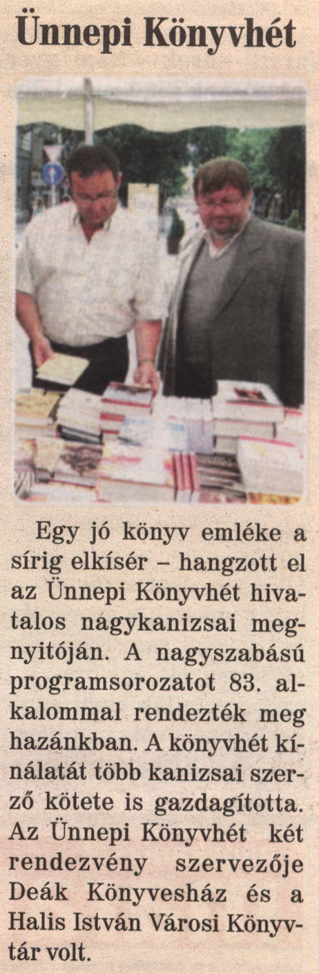 Nyilvános 1793 | 4918 | Nagykanizsai Maraton 2012. június 15. 23. szám 1. oldal - Ünnepi Könyvhét | Ünnepi Könyvhét Egy jó könyv emléke a sírig elkísér - hangzott el az Ünnepi Könyvhét hivatalos nagykanizsai megnyitóján. A nagyszabású programsorozatot 83. alkalommal rendezték meg hazánkban. A könyvhét kínálatát több kanizsai szerző kötete is gazdagította. Az Ünnepi Könyvhét két rendezvény szervezője Deák Könyvesház és a Halis István Városi Könyvtár volt. |