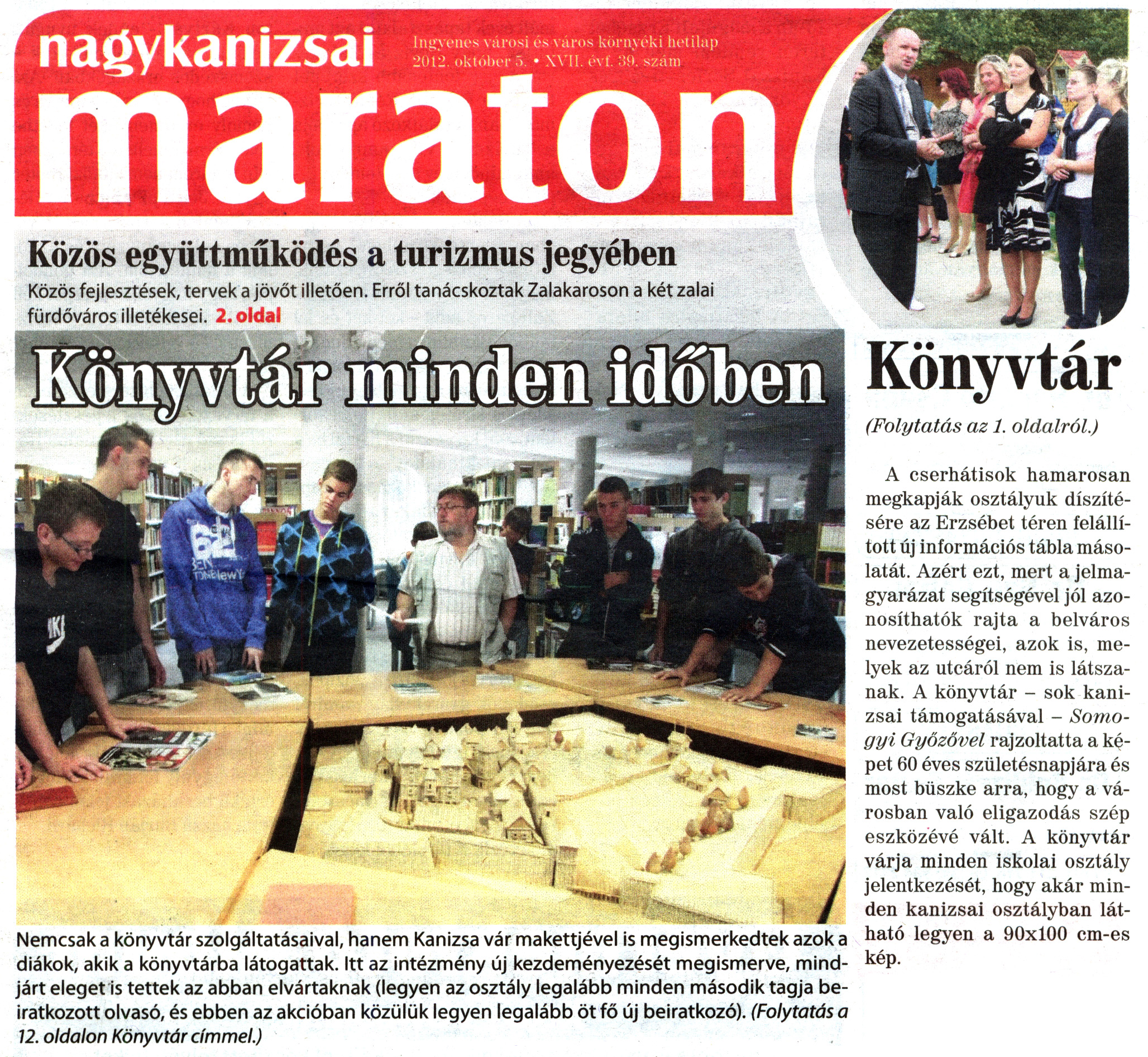 Nyilvános 1751 | 4497 | Nagykanizsai Maraton 2012. október 5. 39. szám 1. oldal - Könyvtár minden időben | Nemcsak a könyvtár szolgáltatásaival, hanem Kanizsa vár makettjével is megismerkedtek azok a diákok, akik a könyvtárba látogattak. Itt az intézmény új kezdeményezését megismerve, mindjárt eleget is tettek az abban elvártaknak (legyen az osztály legalább minden második tagja beiratkozott olvasó, és ebben az akcióban közülük legyen legalább öt fő új beiratkozó). A cserhátisok hamarosan megkapják osztályuk díszítésére az Erzsébet téren felállított új információs tábla másolatát. Azért ezt, mert a jelmagyarázat segítségével jól azonosíthatók rajta a belváros nevezetességei, azok is, melyek az utcáról nem is látszanak. A könyvtár - sok kanizsai támogatásával - Somogyi Győzővel rajzoltatta a képet 60 éves születésnapjára és most büszke arra, hogy a városban való eligazodás szép eszközévé vált. A könyvtár várja minden iskolai osztály jelentkezését, hogy akár minden kanizsai osztályban látható legyen a 90x100 cm-es kép. |