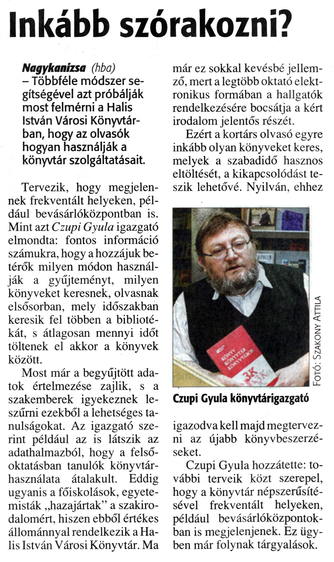 Nyilvános 1602 | 3722 | Zalai Hírlap 2013. január 14. 11. szám 3. oldal - Inkább szórakozni | Inkább szórakozni? Nagykanizsa (hba) - Többféle módszer segítségével azt próbálják most felmérni a Halis István Városi Könyvtárban, hogy az olvasók hogyan használják a könyvtár szolgáltatásait. Tervezik, hogy megjelennek frekventált helyeken, például bevásárlóközpontban is. Mint azt Czupi Gyula igazgató elmondta: fontos információ számukra, hogy a hozzájuk betérők milyen módon használják a gyűjteményt, milyen könyveket keresnek, olvasnak elsősorban, mely időszakban keresik fel többen a bibliotékát, s átlagosan mennyi időt töltenek el akkor a könyvek között. Most már a begyűjtött adatok értelmezése zajlik, s a szakemberek igyekeznek leszűrni ezekből a lehetséges tanulságokat. Az igazgató szerint például az is látszik az adathalmazból, hogy a felsőoktatásban tanulók könyvtárhasználata átalakult. Eddig ugyanis a főiskolások, egyetemisták „hazajártak" a szakirodalomért, hiszen ebből értékes állománnyal rendelkezik a Halis István Városi Könyvtár. Ma már ez sokkal kevésbé jellemző, mert a legtöbb oktató elektronikus formában a hallgatók rendelkezésére bocsátja a kért irodalom jelentős részét. Ezért a kortárs olvasó egyre inkább olyan könyveket keres, melyek a szabadidő hasznos eltöltését, a kikapcsolódást teszik lehetővé. Nyilván, ehhez igazodva kell majd megtervezni az újabb könyvbeszerzéseket. Czupi Gyula hozzátette: további terveik közt szerepel, hogy a könyvtár népszerűsítésével frekventált helyeken, például bevásárlóközpontokban is megjelenjenek. Ez ügyben már folynak tárgyalások. Czupi Gyula könyvtárigazgató Fotó: Szakony Attila |
