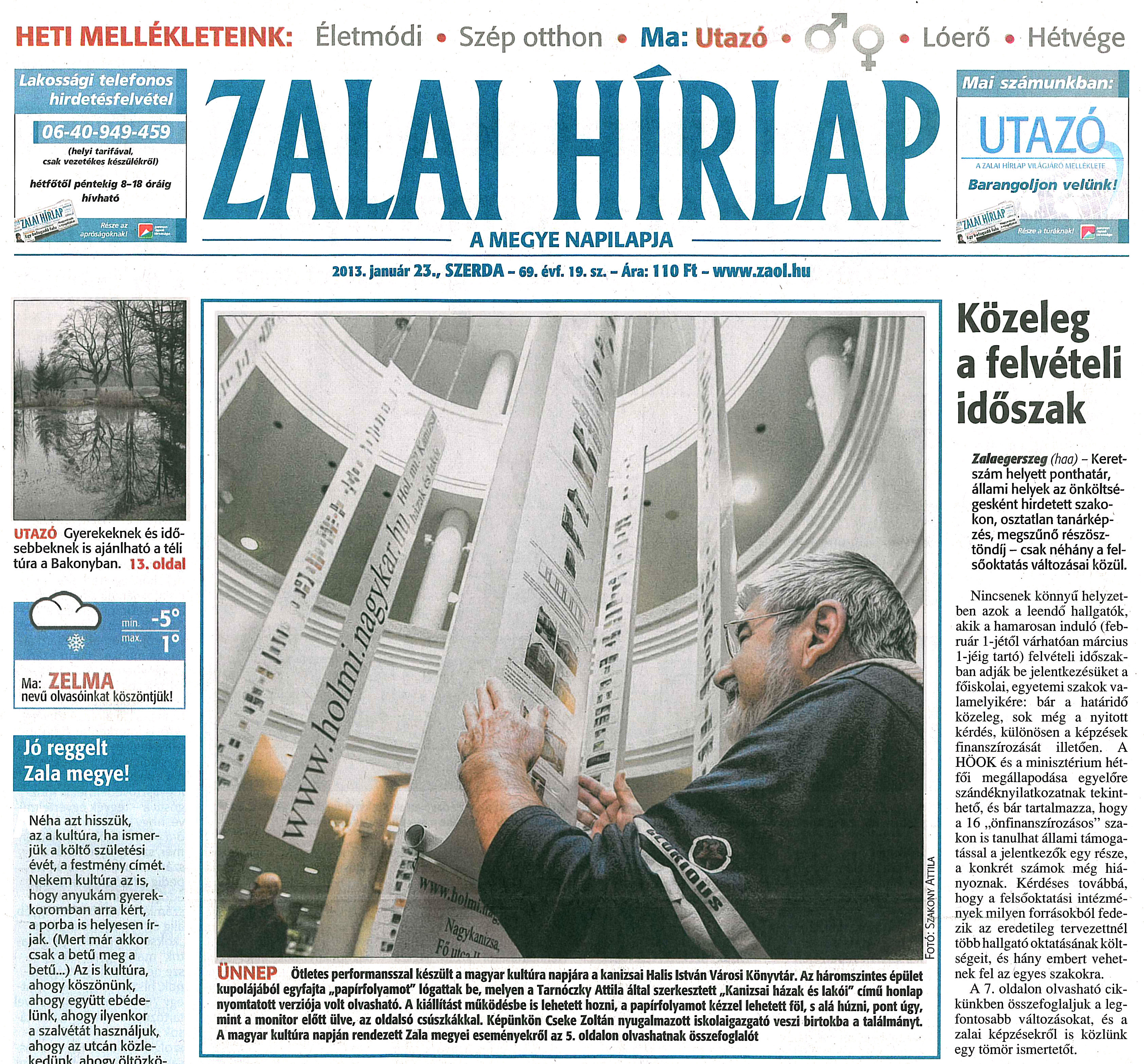 Nyilvános 1679 | 5181 | Zalai Hírlap 2013. január 23. 19. szám 1. oldal - Ünnep | ÜNNEP Ötletes performansszal készült a magyar kultúra napjára a kanizsai Halis István Városi Könyvtár. Az háromszintes épület kupolájából egyfajta „papírfolyamot" lógattak be, melyen a Tarnóczky Attila által szerkesztett „Kanizsai házak és lakói" című honlap nyomtatott verziója volt olvasható. A kiállítást működésbe is lehetett hozni, a papírfolyamot kézzel lehetett föl, s alá húzni, pont úgy, mint a monitor előtt ülve, az oldalsó csúszkákkal. Képünkön Cseke Zoltán nyugalmazott iskolaigazgató veszi birtokba a találmányt. A magyar kultúra napján rendezett Zala megyei eseményekről az 5. oldalon olvashatnak összefoglalót Fotó: Szakony Attila |