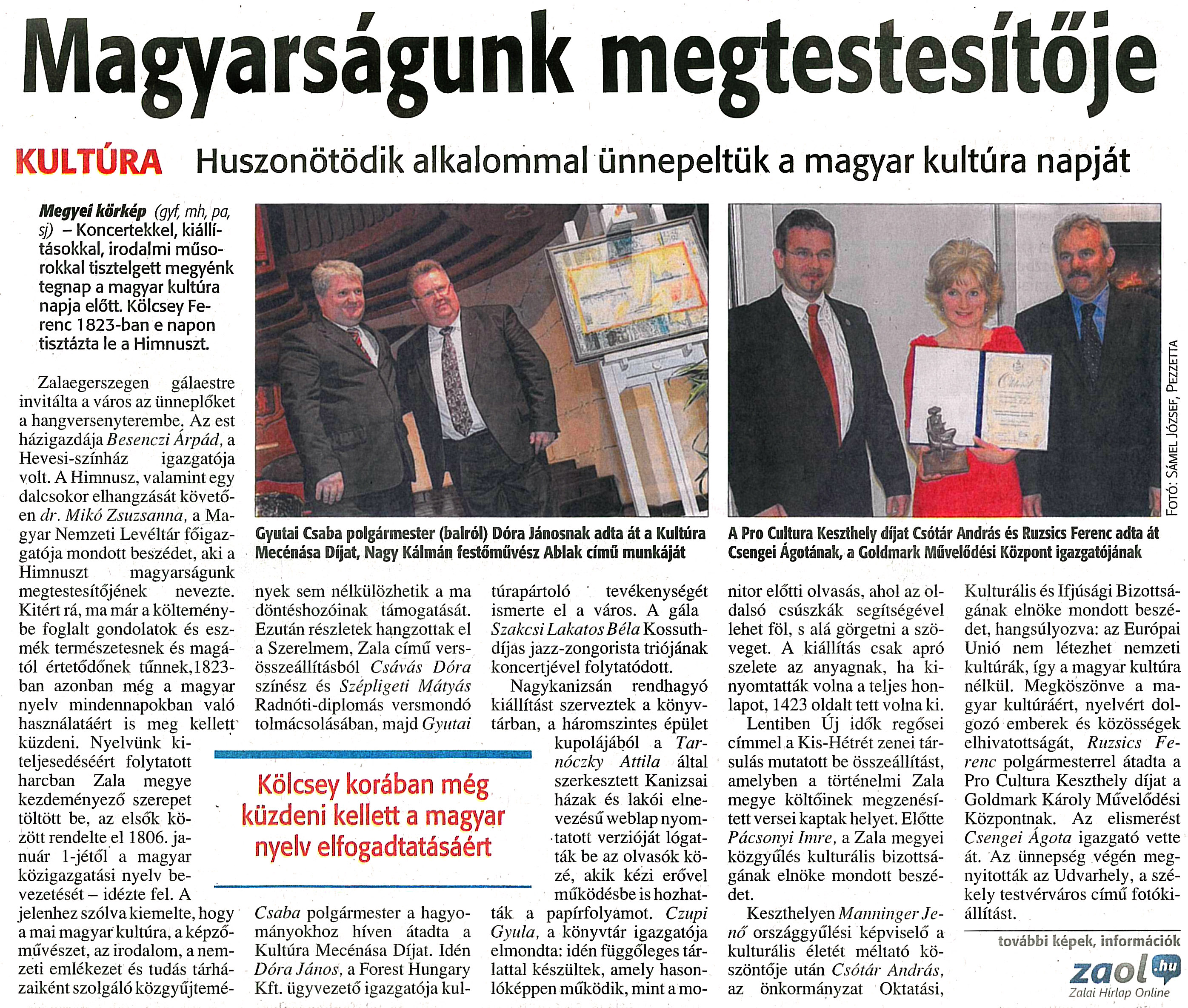 Nyilvános 1682 | 4322 | Zalai Hírlap 2013. január 23. 19. szám 5. oldal - Magyarságunk megtestesítője | Magyarságunk megtestesítője KULTÚRA Huszonötödik alkalommal ünnepeltük a magyar kultúra napját Kölcsey korában még küzdeni kellett a magyar nyelv elfogadtatásáért Megyei körkép (gyf, mh, pa, sj) - Koncertekkel, kiállításokkal, irodalmi műsorokkal tisztelgett megyénk tegnap a magyar kultúra napja előtt. Kölcsey Ferenc 1823-ban e napon tisztázta le a Himnuszt. Zalaegerszegen gálaestre invitálta a város az ünneplőket a hangversenyterembe. Az est házigazdája Besenczi Árpád, a Hevesi-színház igazgatója volt. A Himnusz, valamint egy dalcsokor elhangzását követően dr. Mikó Zsuzsanna, a Magyar Nemzeti Levéltár főigazgatója mondott beszédet, aki a Himnuszt magyarságunk megtestesítőjének nevezte. Kitért rá, ma már a költeménybe foglalt gondolatok és eszmék természetesnek és magától értetődőnek tűnnek, 1823-ban azonban még a magyar nyelv mindennapokban való használatáért is meg kellett küzdeni. Nyelvünk kiteljesedéséért folytatott harcban Zala megye kezdeményező szerepet töltött be. az elsők között rendelte el 1806. január l-jétől a magyar közigazgatási nyelv bevezetését - idézte fel. A jelenhez szólva kiemelte, hogy a mai magyar kultúra, a képzőművészet, az irodalom, a nemzeti emlékezet és tudás tárházaiként szolgáló közgyűjtemények sem nélkülözhetik a ma döntéshozóinak támogatását. Ezután részletek hangzottak el a Szerelmem, Zala című versösszeállításból Csávás Dóra színész és Szépligeti Mátyás Radnóti-diplomás versmondó tolmácsolásában, majd Gyutai Csaba polgármester a hagyományokhoz híven átadta a Kultúra Mecénása Díjat. Idén Dóra János, a Forest Hungary Kft. ügyvezető igazgatója kultúrapártoló tevékenységét ismerte el a város. A gála Szakcsi Lakatos Béla Kossuth-díjas jazz-zongorista triójának koncertjével folytatódott. Nagykanizsán rendhagyó kiállítást szerveztek a könyvtárban, a háromszintes épület kupolájából a Tarnóczky Attila által szerkesztett Kanizsai házak és lakói elnevezésű weblap nyomtatott verzióját lógatták be az olvasók közé, akik kézi erővel működésbe is hozhatták a papírfolyamot. Czupi Gyula, a könyvtár igazgatója elmondta: idén függőleges tárlattal készültek, amely hasonlóképpen működik, mint a monitor előtti olvasás, ahol az oldalsó csúszkák segítségével lehet föl, s alá görgetni a szöveget. A kiállítás csak apró szelete az anyagnak, ha kinyomtatták volna a teljes honlapot, 1423 oldalt tett volna ki. Lentiben Új idők regősei címmel a Kis-Hétrét zenei társulás mutatott be összeállítást, amelyben a történelmi Zala megye költőinek megzenésített versei kaptak helyet. Előtte Pácsonyi Imre, a Zala megyei közgyűlés kulturális bizottságának elnöke mondott beszédet. Keszthelyen Manninger Jenő országgyűlési képviselő a kulturális életét méltató köszöntője után Csótár András, az önkormányzat Oktatási, Kulturális és Ifjúsági Bizottságának elnöke mondott beszédet, hangsúlyozva: az Európai Unió nem létezhet nemzeti kultúrák, így a magyar kultúra nélkül. Megköszönve a magyar kultúráért, nyelvért dolgozó emberek és közösségek elhivatottságát, Ruzsics Ferenc polgármesterrel átadta a Pro Cultura Keszthely díjat a Goldmark Károly Művelődési Központnak. Az elismerést Csengei Ágota igazgató vette át. Az ünnepség végén megnyitották az Udvarhely, a székely testvérváros című fotókiállítást. további képek, információk zaol.hu Zalai Hírlap Online Gyutai Csaba polgármester (balról) Dóra Jánosnak adta át a Kultúra Mecénása Díjat, Nagy Kálmán festőművész Ablak című munkáját A Pro Cultura Keszthely díjat Csótár András és Ruzsics Ferenc adta át Csengei Ágotának, a Goldmark Művelődési Központ igazgatójának Fotó: Sámel József, Pezzetta |