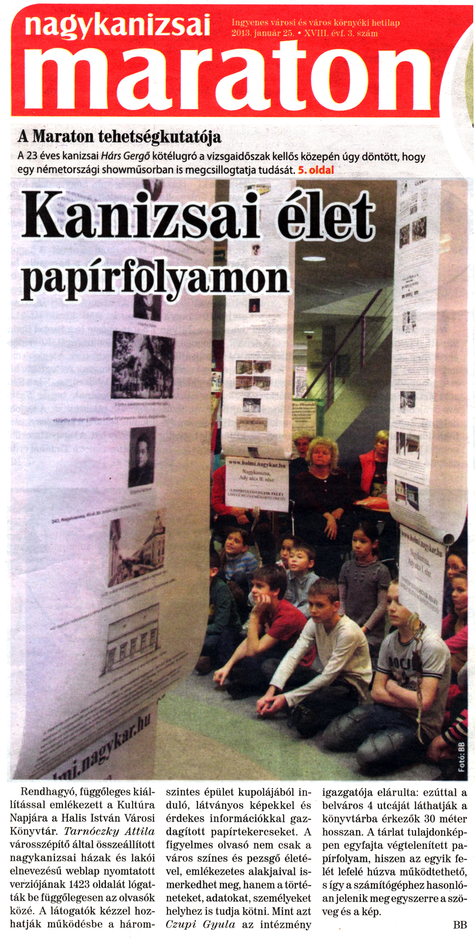 Nyilvános 1695 | 5083 | Nagykanizsai Maraton 2013. január 25. 3. szám 1. oldal - Kanizsai élet papírfolyamon | Kanizsai élet papírfolyamon Rendhagyó, függőleges kiállítással emlékezett a Kultúra Napjára a Halis István Városi Könyvtár. Tarnóczky Attila városszépítő által összeállított nagykanizsai házak és lakói elnevezésű weblap nyomtatott verziójának 1423 oldalát lógatták be függőlegesen az olvasók közé. A látogatók kézzel hozhatják működésbe a háromszintes épület kupolájából induló, látványos képekkel és érdekes információkkal gazdagított papírtekercseket. A figyelmes olvasó nem csak a város színes és pezsgő életével, emlékezetes alakjaival ismerkedhet meg, hanem a történeteket, adatokat, személyeket helyhez is tudja kötni. Mint azt Czupi Gyula az intézmény igazgatója elárulta: ezúttal a belváros 4 utcáját láthatják a könyvtárba érkezők 30 méter hosszan. A tárlat tulajdonképpen egyfajta végtelenített papírfolyam, hiszen az egyik felét lefelé húzva működtethető, s így a számítógéphez hasonlóan jelenik meg egyszerre a szöveg és a kép. BB |