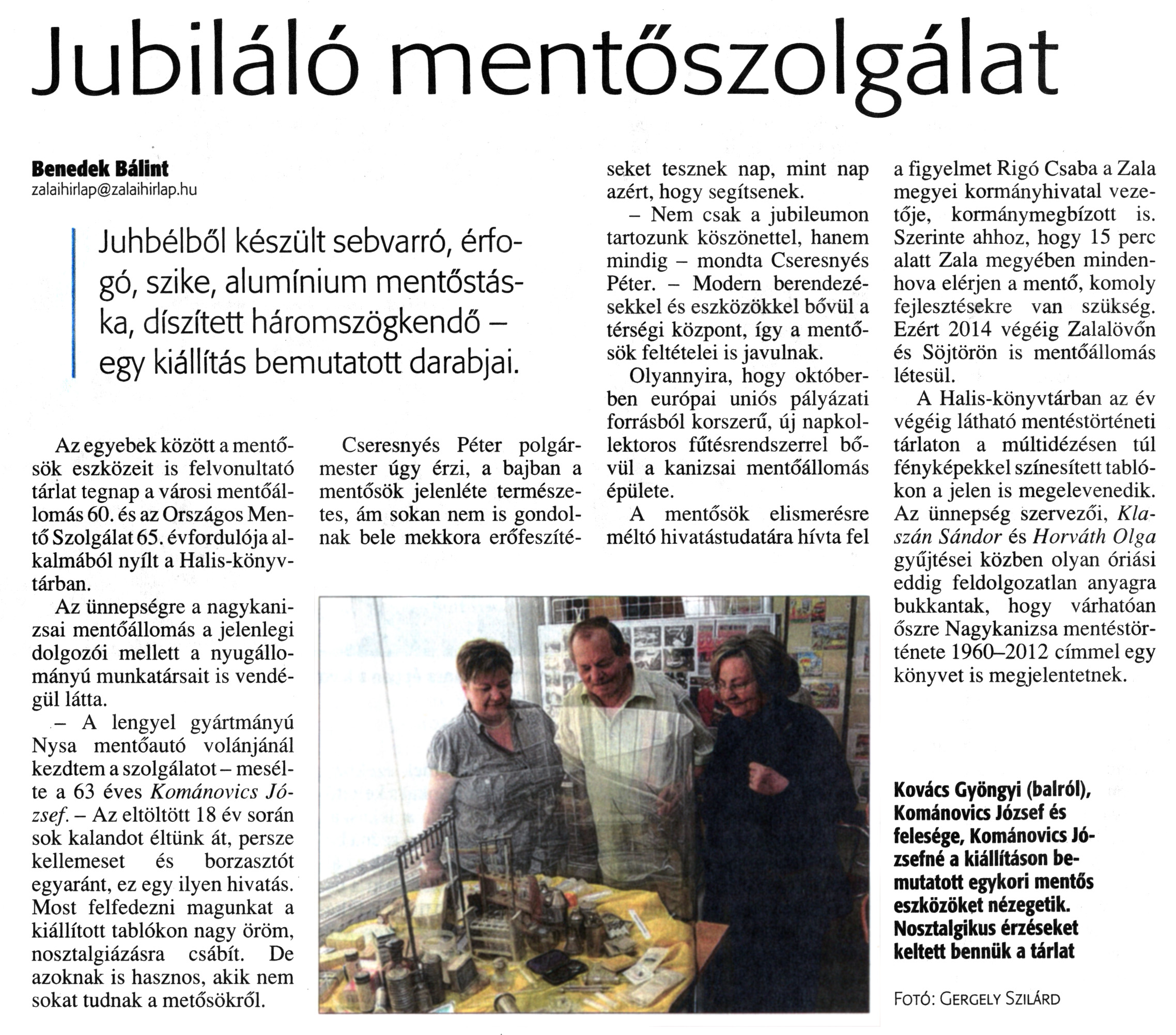 Nyilvános 1475 | 3258 | Zalai Hírlap 2013. május 11. 109. szám 10. oldal - Jubiláló mentőszolgálat | Jubiláló mentőszolgálat Benedek Bálint zalaihirlap@zalaihirlap.hu Juhbélből készült sebvarró, érfogó, szike, alumínium mentőstáska, díszített háromszögkendő -egy kiállítás bemutatott darabjai. Az egyebek között a mentősök eszközeit is felvonultató tárlat tegnap a városi mentőállomás 60. és az Országos Mentő Szolgálat 65. évfordulója alkalmából nyílt a Halis-könyvtárban. Az ünnepségre a nagykanizsai mentőállomás a jelenlegi dolgozói mellett a nyugállományú munkatársait is vendégül látta. - A lengyel gyártmányú Nysa mentőautó volánjánál kezdtem a szolgálatot - mesélte a 63 éves Kománovics József. - Az eltöltött 18 év során sok kalandot éltünk át, persze kellemeset és borzasztót egyaránt, ez egy ilyen hivatás. Most felfedezni magunkat a kiállított tablókon nagy öröm, nosztalgiázásra csábít. De azoknak is hasznos, akik nem sokat tudnak a metősökről. Cseresnyés Péter polgármester úgy érzi, a bajban a mentősök jelenléte természetes, ám sokan nem is gondolnak bele mekkora erőfeszítéseket tesznek nap, mint nap azért, hogy segítsenek. - Nem csak a jubileumon tartozunk köszönettel, hanem mindig - mondta Cseresnyés Péter. - Modern berendezésekkel és eszközökkel bővül a térségi központ, így a mentősök feltételei is javulnak. Olyannyira, hogy októberben európai uniós pályázati forrásból korszerű, új napkollektoros fűtésrendszerrel bővül a kanizsai mentőállomás épülete. A mentősök elismerésre méltó hivatástudatára hívta fel a figyelmet Rigó Csaba a Zala megyei kormányhivatal vezetője, kormánymegbízott is. Szerinte ahhoz, hogy 15 perc alatt Zala megyében mindenhova elérjen a mentő, komoly fejlesztésekre van szükség. Ezért 2014 végéig Zalalövőn és Söjtörön is mentőállomás létesül. A Halis-könyvtárban az év végéig látható mentéstörténeti tárlaton a múltidézésen túl fényképekkel színesített tablókon a jelen is megelevenedik. Az ünnepség szervezői, Klaszán Sándor és Horváth Olga gyűjtései közben olyan óriási eddig feldolgozatlan anyagra bukkantak, hogy várhatóan őszre Nagykanizsa mentéstörténete 1960-2012 címmel egy könyvet is megjelentetnek. Kovács Gyöngyi (balról), Kománovics József és felesége, Kománovics Józsefné a kiállításon bemutatott egykori mentős eszközöket nézegetik. Nosztalgikus érzéseket keltett bennük a tárlat Fotó: Gergely Szilárd |
