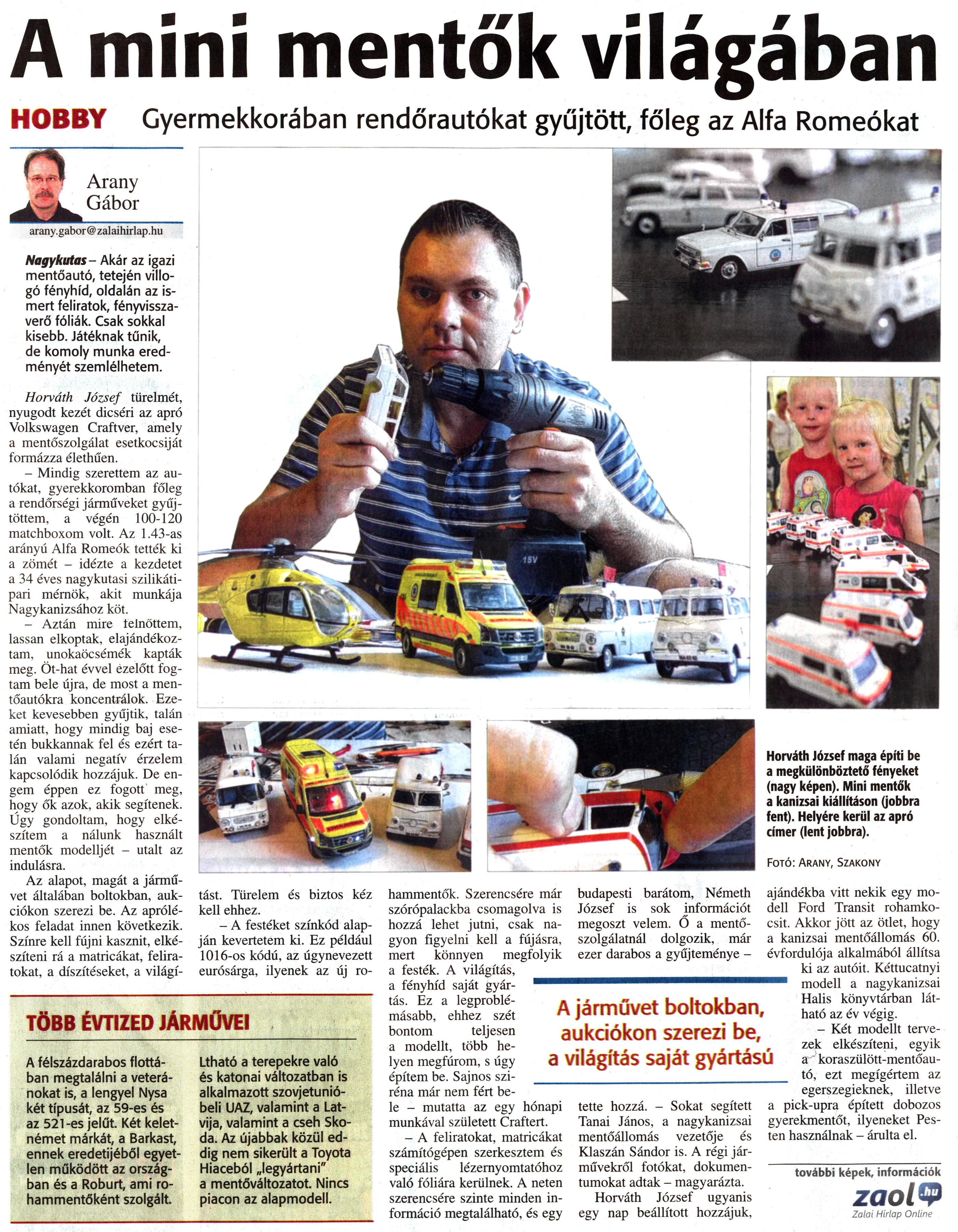 Nyilvános 1649 | 4518 | Zalai Hírlap 2013. július 19. 167. szám 8. oldal - A mini mentők világában | A cikk internetes változata a következő link alatt tekinthető meg: http://zaol.hu/loero/a-mini-mentok-vilagaban-1553058 A mini mentők világában HOBBY Gyermekkorában rendőrautókat gyűjtött, főleg az Alfa Romeókat Nagykutas- Akár az igazi mentőautó, tetején villogó fényhíd, oldalán az ismert feliratok, fényvisszaverő fóliák. Csak sokkal kisebb. Játéknak tűnik, de komoly munka eredményét szemlélhetem. Horváth József türelmét, nyugodt kezét dicséri az apró Volkswagen Craftver, amely a mentőszolgálat esetkocsiját formázza élethűen. - Mindig szerettem az autókat, gyerekkoromban főleg a rendőrségi járműveket gyűjtöttem, a végén 100-120 matchboxom volt. Az 1.43-as arányú Alfa Romeók tették ki a zömét - idézte a kezdetet a 34 éves nagykutasi szilikátipari mérnök, akit munkája Nagykanizsához köt. - Aztán mire felnőttem, lassan elkoptak, elajándékoztam, unokaöcsémék kapták meg. Öt-hat évvel ezelőtt fogtam bele újra, de most a mentőautókra koncentrálok. Ezeket kevesebben gyűjtik, talán amiatt, hogy mindig baj esetén bukkannak fel és ezért talán valami negatív érzelem kapcsolódik hozzájuk. De engem éppen ez fogott meg, hogy ők azok, akik segítenek. Úgy gondoltam, hogy elkészítem a nálunk használt mentők modelljét - utalt az indulásra. Az alapot, magát a járművet általában boltokban, aukciókon szerezi be. Az aprólékos feladat innen következik. Színre kell fújni kasznit, elkészíteni rá a matricákat, feliratokat, a díszítéseket, a világítást. Türelem és biztos kéz kell ehhez. - A festéket színkód alapján kevertetem ki. Ez például 1016-os kódú, az úgynevezett eurósárga, ilyenek az új rohammentők. Szerencsére már szórópalackba csomagolva is hozzá lehet jutni, csak nagyon figyelni kell a fújásra, mert könnyen megfolyik a festék. A világítás, a fényhíd saját gyártás. Ez a legproblémásabb, ehhez szét bontom teljesen a modellt, több helyen megfúrom, s úgy építem be. Sajnos sziréna már nem fért bele - mutatta az egy hónapi munkával született Craftert. - A feliratokat, matricákat számítógépen szerkesztem és speciális lézernyomtatóhoz való fóliára kerülnek. A neten szerencsére szinte minden információ megtalálható, és egy budapesti barátom, Németh József is sok információt megoszt velem. Ő a mentőszolgálatnál dolgozik, már ezer darabos a gyűjteménye - tette hozzá. - Sokat segített Tanai János, a nagykanizsai mentőállomás vezetője és Klaszán Sándor is. A régi járművekről fotókat, dokumentumokat adtak - magyarázta. Horváth József ugyanis egy nap beállított hozzájuk, ajándékba vitt nekik egy modell Ford Transit rohamkocsit. Akkor jött az ötlet, hogy a kanizsai mentőállomás 60. évfordulója alkalmából állítsa ki az autóit. Kéttucatnyi modell a nagykanizsai Halis könyvtárban látható az év végig. - Két modellt tervezek elkészíteni, egyik a koraszülött-mentőautó, ezt megígértem az egerszegieknek, illetve a pickupra épített dobozos gyerekmentőt, ilyeneket Pesten használnak - árulta el. Arany Gábor arany.gabor@zalaihirlap.hu TÖBB ÉVTIZED JÁRMŰVEI A félszázdarabos flottában megtalálni a veteránokat is, a lengyel Nysa két típusát, az 59-es és az 521-es jelűt. Két keletnémet márkát, a Barkast, ennek eredetijéből egyetlen működött az országban és a Roburt, ami rohammentőként szolgált. Látható a terepekre való és katonai változatban is alkalmazott szovjetunióbeli UAZ, valamint a Lat-vija, valamint a cseh Skoda. Az újabbak közül eddig nem sikerült a Toyota Hiaceból „legyártani" a mentőváltozatot. Nincs piacon az alapmodell. Fotó: Arany, Szakony A járművet boltokban, aukciókon szerezi be, a világítás saját gyártású további képek, információk zaol.hu Zalai Hírlap Online Horváth József maga építi be a megkülönböztető fényeket (nagy képen). Mini mentők a kanizsai kiállításon (jobbra fent). Helyére kerül az apró címer (lent jobbra). |