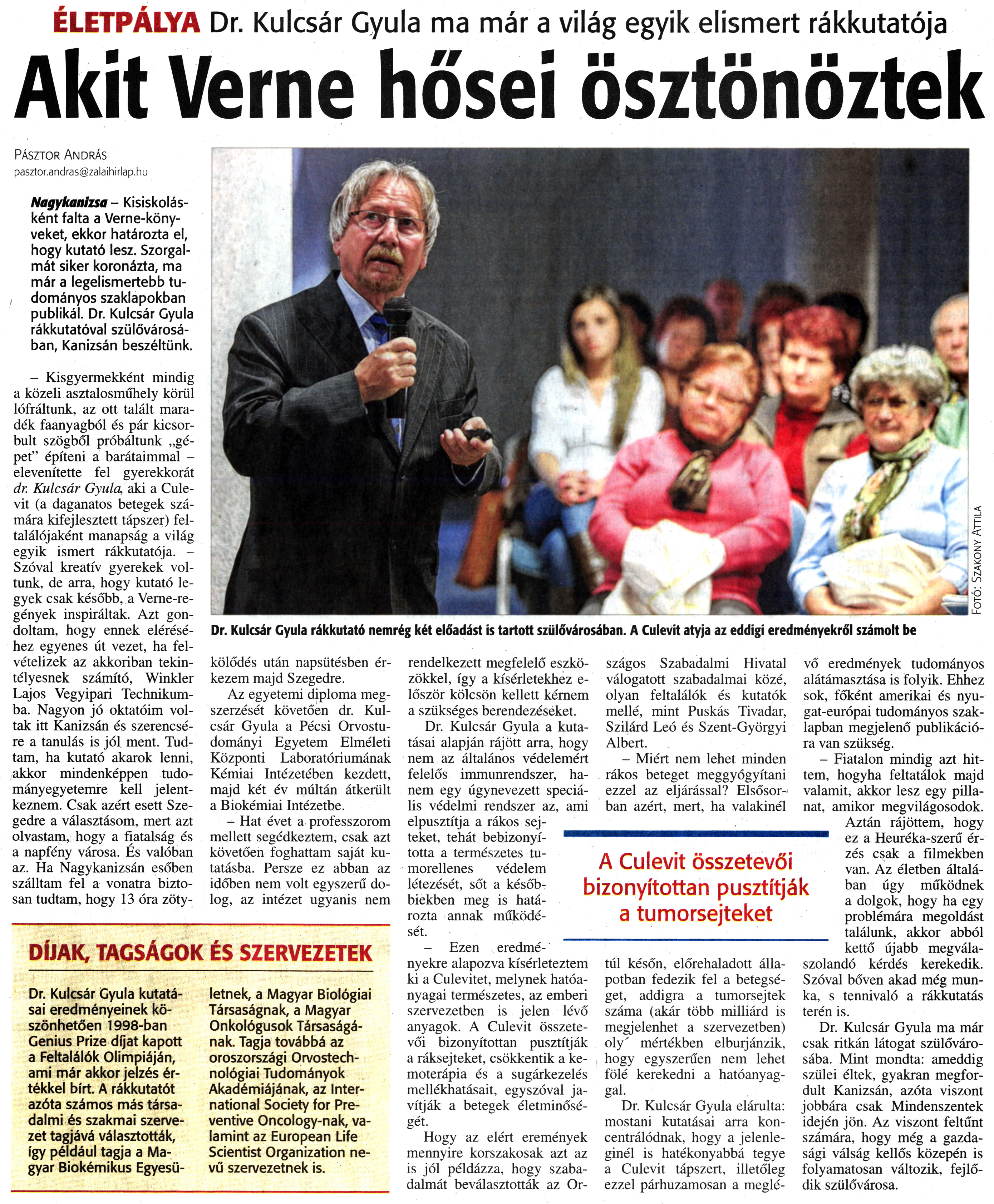 Nyilvános 1649 | 3910 | Zalai Hírlap 2013. november 13. 264. szám 5. oldal | ÉLETPÁLYA Dr. Kulcsár Gyula ma már a világ egyik elismert rákkutatója Akit Verne hősei ösztönöztek Or. Kulcsár Gyula rákkutató nemrég két előadást is tartott szülővárosában. A Culevit atyja az eddigi eredményekről számolt be Pásztor András pasztor.andras@zalaihirlap.hu Nagykanizsa - Kisiskolásként falta a Verne-könyveket, ekkor határozta el, hogy kutató lesz. Szorgalmát siker koronázta, ma már a legelismertebb tudományos szaklapokban publikál. Dr. Kulcsár Gyula rákkutatóval szülővárosában, Kanizsán beszéltünk. - Kisgyermekként mindig a közeli asztalosműhely körül lófráltunk, az ott talált maradék faanyagból és pár kicsorbult szögből próbáltunk „gépet" építeni a barátaimmal -elevenítette fel gyerekkorát dr. Kulcsár Gyula, aki a Culevit (a daganatos betegek számára kifejlesztett tápszer) feltalálójaként manapság a világ egyik ismert rákkutatója. - Szóval kreatív gyerekek voltunk, de arra, hogy kutató legyek csak később, a Verne-regények inspiráltak. Azt gondoltam, hogy ennek eléréséhez egyenes út vezet, ha felvételizek az akkoriban tekintélyesnek számító, Winkler Lajos Vegyipari Technikumba. Nagyon jó oktatóim voltak itt Kanizsán és szerencsére a tanulás is jól ment. Tudtam, ha kutató akarok lenni, akkor mindenképpen tudományegyetemre kell jelentkeznem. Csak azért esett Szegedre a választásom, mert azt olvastam, hogy a fiatalság és a napfény városa. És valóban az. Ha Nagykanizsán esőben szálltam fel a vonatra biztosan tudtam, hogy 13 óra zöty- kölődés után napsütésben érkezem majd Szegedre. Az egyetemi diploma megszerzését követően dr. Kulcsár Gyula a Pécsi Orvostudományi Egyetem Elméleti Központi Laboratóriumának Kémiai Intézetében kezdett, majd két év múltán átkerült a Biokémiai Intézetbe. - Hat évet a professzorom mellett segédkeztem, csak azt követően foghattam saját kutatásba. Persze ez abban az időben nem volt egyszerű dolog, az intézet ugyanis nem rendelkezett megfelelő eszközökkel, így a kísérletekhez először kölcsön kellett kérnem a szükséges berendezéseket. Dr. Kulcsár Gyula a kutatásai alapján rájött arra, hogy nem az általános védelemért felelős immunrendszer, hanem egy úgynevezett speciális védelmi rendszer az, ami elpusztítja a rákos sejteket, tehát bebizonyította a természetes tumorellenes védelem létezését, sőt a későbbiekben meg is határozta annak működését. - Ezen eredményekre alapozva kísérleteztem ki a Culevitet, melynek hatóanyagai természetes, az emberi szervezetben is jelen lévő anyagok. A Culevit összetevői bizonyítottan pusztítják a ráksejteket, csökkentik a kemoterápia és a sugárkezelés mellékhatásait, egyszóval javítják a betegek életminőségét. Hogy az elért eremények mennyire korszakosak azt az is jól példázza, hogy szabadalmát beválasztották az Országos Szabadalmi Hivatal válogatott szabadalmai közé, olyan feltalálók és kutatók mellé, mint Puskás Tivadar, Szilárd Leó és Szent-Györgyi Albert. - Miért nem lehet minden rákos beteget meggyógyítani ezzel az eljárással? Elsősorban azért, mert, ha valakinél túl későn, előrehaladott állapotban fedezik fel a betegséget, addigra a tumorsejtek száma (akár több milliárd is megjelenhet a szervezetben) oly\' mértékben elburjánzik, hogy egyszerűen nem lehet fölé kerekedni a hatóanyaggal. Dr. Kulcsár Gyula elárulta: mostani kutatásai arra koncentrálódnak, hogy a jelenleginél is hatékonyabbá tegye a Culevit tápszert, illetőleg ezzel párhuzamosan a meglévő eredmények tudományos alátámasztása is folyik. Ehhez sok, főként amerikai és nyugat-európai tudományos szaklapban megjelenő publikációra van szükség. - Fiatalon mindig azt hittem, hogyha feltatálok majd valamit, akkor lesz egy pillanat, amikor megvilágosodok. Aztán rájöttem, hogy ez a Heuréka-szerű érzés csak a filmekben van. Az életben általában úgy működnek a dolgok, hogy ha egy problémára megoldást találunk, akkor abból kettő újabb megválaszolandó kérdés kerekedik. Szóval bőven akad még munka, s tennivaló a rákkutatás terén is. Dr. Kulcsár Gyula ma már csak ritkán látogat szülővárosába. Mint mondta: ameddig szülei éltek, gyakran megfordult Kanizsán, azóta viszont jobbára csak Mindenszentek idején jön. Az viszont feltűnt számára, hogy még a gazdasági válság kellős közepén is folyamatosan változik, fejlődik szülővárosa. A Culevit összetevői bizonyítottan pusztítják a tumorsejteket DÍJAK, TAGSÁGOK ÉS SZERVEZETEK Dr. Kulcsár Gyula kutatásai eredményeinek köszönhetően 1998-ban Genius Prize díjat kapott a Feltalálók Olimpiáján, ami már akkor jelzés értékkel bírt. A rákkutatót azóta számos más társadalmi és szakmai szervezet tagjává választották, így például tagja a Magyar Biokémikus Egyesületnek, a Magyar Biológiai Társaságnak, a Magyar Onkológusok Társaságának. Tagja továbbá az oroszországi Orvostechnológiai Tudományok Akadémiájának, az International Society for Preventive Oncology-nak, valamint az European Life Scientist Organization nevű szervezetnek is. |