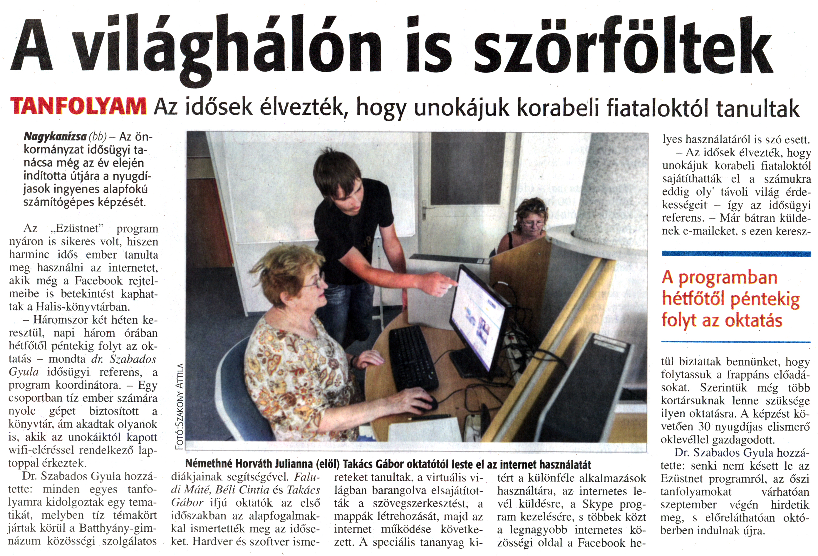 Nyilvános 1795 | 3485 | Zalai Hírlap 2014. szeptember 4. 206. szám 4. oldal | A világhálón is szörföltek TANFOLYAM Az idősek élvezték, hogy unokájuk korabeli fiataloktól tanultak Nagykanizsa (bb) - Az önkormányzat idősügyi tanácsa még az év elején indította útjára a nyugdíjasok ingyenes alapfokú számítógépes képzését. Az „Ezüstnet" program nyáron is sikeres volt, hiszen harminc idős ember tanulta meg használni az internetet, akik még a Facebook rejtelmeibe is betekintést kaphattak a Halis-könyvtárban. - Háromszor két héten keresztül, napi három órában hétfőtől péntekig folyt az oktatás - mondta dr. Szabados Gyula idősügyi referens, a program koordinátora. - Egy csoportban tíz ember számára nyolc gépet biztosított a könyvtár, ám akadtak olyanok is, akik az unokáiktól kapott wifi-eléréssel rendelkező laptoppal érkeztek. Dr. Szabados Gyula hozzátette: minden egyes tanfolyamra kidolgoztak egy tematikát, melyben tíz témakört jártak körül a Batthyány-gimnázum közösségi szolgálatos diákjainak segítségével. Faludi Máté, Béli Cintia és Takács Gábor ifjú oktatók az első időszakban az alapfogalmakkal ismertették meg az időseket. Hardver és szoftver ismereteket tanultak, a virtuális világban barangolva elsajátították a szövegszerkesztést, a mappák létrehozását, majd az internet működése következett. A speciális tananyag kitért a különféle alkalmazások használatára, az internetes levél küldésre, a Skype program kezelésére, s többek közt a legnagyobb internetes közösségi oldal a Facebook helyes használatáról is szó esett. - Az idősek élvezték, hogy unokájuk korabeli fiataloktól sajátíthatták el a számukra eddig oly\' távoli világ érdekességeit - így az idősügyi referens. - Már bátran küldenek e-maileket, s ezen keresztül biztattak bennünket, hogy folytassuk a frappáns előadásokat. Szerintük még több kortársuknak lenne szüksége ilyen oktatásra. A képzést követően 30 nyugdíjas elismerő oklevéllel gazdagodott. Dr. Szabados Gyula hozzátette: senki nem késett le az Ezüstnet programról, az őszi tanfolyamokat várhatóan szeptember végén hirdetik meg, s előreláthatóan októberben indulnak újra. Némethné Horváth Julianna (elöl) Takács Gábor oktatótól leste el az internet használatát A programban hétfőtől péntekig folyt az oktatás |