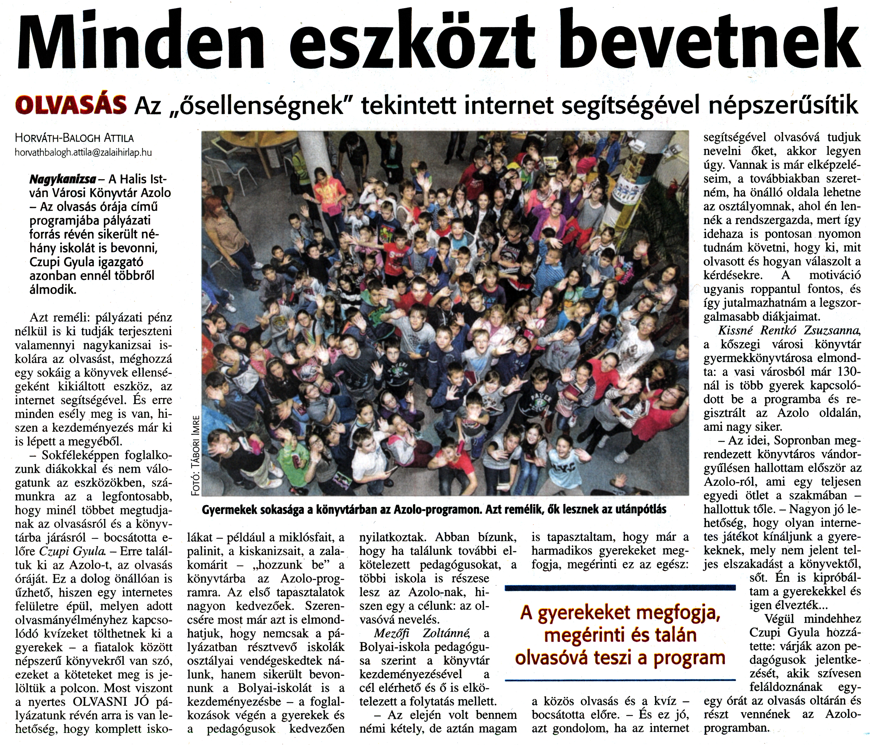 Nyilvános 1767 | 3518 | Zalai Hírlap 2014. november 19. 269. szám 7. oldal - Minden eszközt bevetnek | Minden eszközt bevetnek OLVASÁS Az „ősellenségnek" tekintett internet segítségével népszerűsítik A gyerekeket megfogja, megérinti és talán olvasóvá teszi a program Gyermekek sokasága a könyvtárban az Azolo-programon. Azt remélik, ők lesznek az utánpótlás Horváth-Balogh Attila horvathbalogh.attila@zalaihirlap.hu Nagykanizsa- A Halis István Városi Könyvtár Azolo - Az olvasás órája című programjába pályázati forrás révén sikerült néhány iskolát is bevonni, Czupi Gyula igazgató azonban ennél többről álmodik. Azt reméli: pályázati pénz nélkül is ki tudják terjeszteni valamennyi nagykanizsai iskolára az olvasást, méghozzá egy sokáig a könyvek ellenségeként kikiáltott eszköz, az internet segítségével. És erre minden esély meg is van, hiszen a kezdeményezés már ki is lépett a megyéből. - Sokféleképpen foglalkozunk diákokkal és nem válogatunk az eszközökben, számunkra az a legfontosabb, hogy minél többet megtudjanak az olvasásról és a könyvtárba járásról - bocsátotta e-lőre Czupi Gyula - Erre találtuk ki az Azolo-t, az olvasás óráját. Ez a dolog önállóan is űzhető, hiszen egy internetes felületre épül, melyen adott olvasmányélményhez kapcsolódó kvízeket tölthetnek ki a gyerekek - a fiatalok között népszerű könyvekről van szó, ezeket a köteteket meg is jelöltük a polcon. Most viszont a nyertes OLVASNI JÓ pályázatunk révén arra is van lehetőség, hogy komplett iskolákat - például a miklósfait, a palinit, a kiskanizsait, a zalakomárit - „hozzunk be" a könyvtárba az Azolo-programra. Az első tapasztalatok nagyon kedvezőek. Szerencsére most már azt is elmondhatjuk, hogy nemcsak a pályázatban résztvevő iskolák osztályai vendégeskedtek nálunk, hanem sikerült bevonnunk a Bolyai-iskolát is a kezdeményezésbe - a foglalkozások végén a gyerekek és a pedagógusok kedvezően nyilatkoztak. Abban bízunk, hogy ha találunk további elkötelezett pedagógusokat, a többi iskola is részese lesz az Azolo-nak, hiszen egy a célunk: az olvasóvá nevelés. Mezőfi Zoltánné, a Bolyai-iskola pedagógusa szerint a könyvtár kezdeményezésével a cél elérhető és ő is elkötelezett a folytatás mellett. - Az elején volt bennem némi kétely, de aztán magam is tapasztaltam, hogy már a harmadikos gyerekeket megfogja, megérinti ez az egész: a közös olvasás és a kvíz -bocsátotta előre. - És ez jó, azt gondolom, ha az internet segítségével olvasóvá tudjuk nevelni őket, akkor legyen úgy. Vannak is már elképzeléseim, a továbbiakban szeretném, ha önálló oldala lehetne az osztályomnak, ahol én lennék a rendszergazda, mert így idehaza is pontosan nyomon tudnám követni, hogy ki, mit olvasott és hogyan válaszolt a kérdésekre. A motiváció ugyanis roppantul fontos, és így jutalmazhatnám a legszorgalmasabb diákjaimat. Kissné Rentkó Zsuzsanna a kőszegi városi könyvtár gyermekkönyvtárosa elmondta: a vasi városból már 130-nál is több gyerek kapcsolódott be a programba és regisztrált az Azolo oldalán, ami nagy siker. - Az idei, Sopronban megrendezett könyvtáros vándorgyűlésen hallottam először az Azolo-ról, ami egy teljesen egyedi ötlet a szakmában -hallottuk tőle. - Nagyon jó lehetőség, hogy olyan internetes játékot kínáljunk a gyerekeknek, mely nem jelent teljes elszakadást a könyvektől, sőt. Én is kipróbáltam a gyerekekkel és igen élvezték... Végül mindehhez Czupi Gyula hozzátette: várják azon pedagógusok jelentkezését, akik szívesen feláldoznának egy-egy órát az olvasás oltárán és részt vennének az Azolo-programban. |