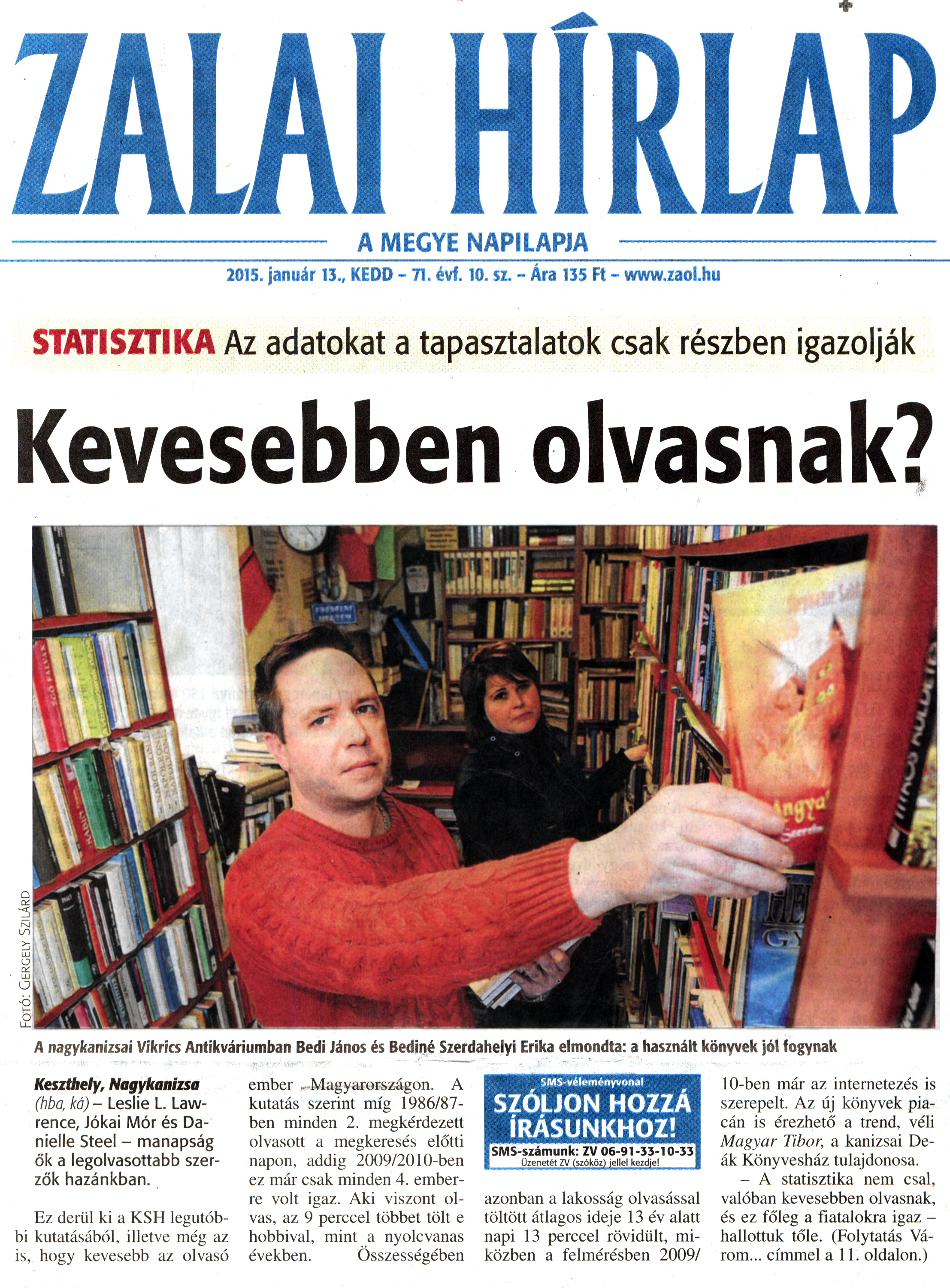 Nyilvános 1646 | 3379 | Zalai Hírlap 2015. január 13. 10. szám 1. oldal - Kevesebben olvasnak | HÍRLAP A MEGYE NAPILAPJA 2015. január 13., KEDD - 71. évf. 10. sz. - Ara 135 Ft - www.zaol.hu STATISZTIKA Az adatokat a tapasztalatok csak részben igazolják Kevesebben olvasnak? A nagykanizsai Vikrics Antikváriumban Bedi János és Bediné Szerdahelyi Erika elmondta: a használt könyvek jól fogynak Keszthely, Nagykanizsa (hba, ka) - Leslie L. Lawrence, Jókai Mór és Danielle Steel - manapság ők a legolvasottabb szerzők hazánkban. Ez derül ki a KSH legutóbbi kutatásából, illetve még az is, hogy kevesebb az olvasó ember Magyarországon. A kutatás szerint míg 1986/87-ben minden 2. megkérdezett olvasott a megkeresés előtti napon, addig 2009/2010-ben ez már csak minden 4. emberre volt igaz. Aki viszont olvas, az 9 perccel többet tölt e hobbival, mint a nyolcvanas években. Összességében azonban a lakosság olvasással töltött átlagos ideje 13 év alatt napi 13 perccel rövidült, miközben a felmérésben 2009/ 10-ben már az internetezés is szerepelt. Az új könyvek piacán is érezhető a trend, véli Magyar Tibor, a kanizsai Deák Könyvesház tulajdonosa. - A statisztika nem csal, valóban kevesebben olvasnak, és ez főleg a fiatalokra igaz - hallottuk tőle. (Folytatás Várom... címmel a 11. oldalon.) |
