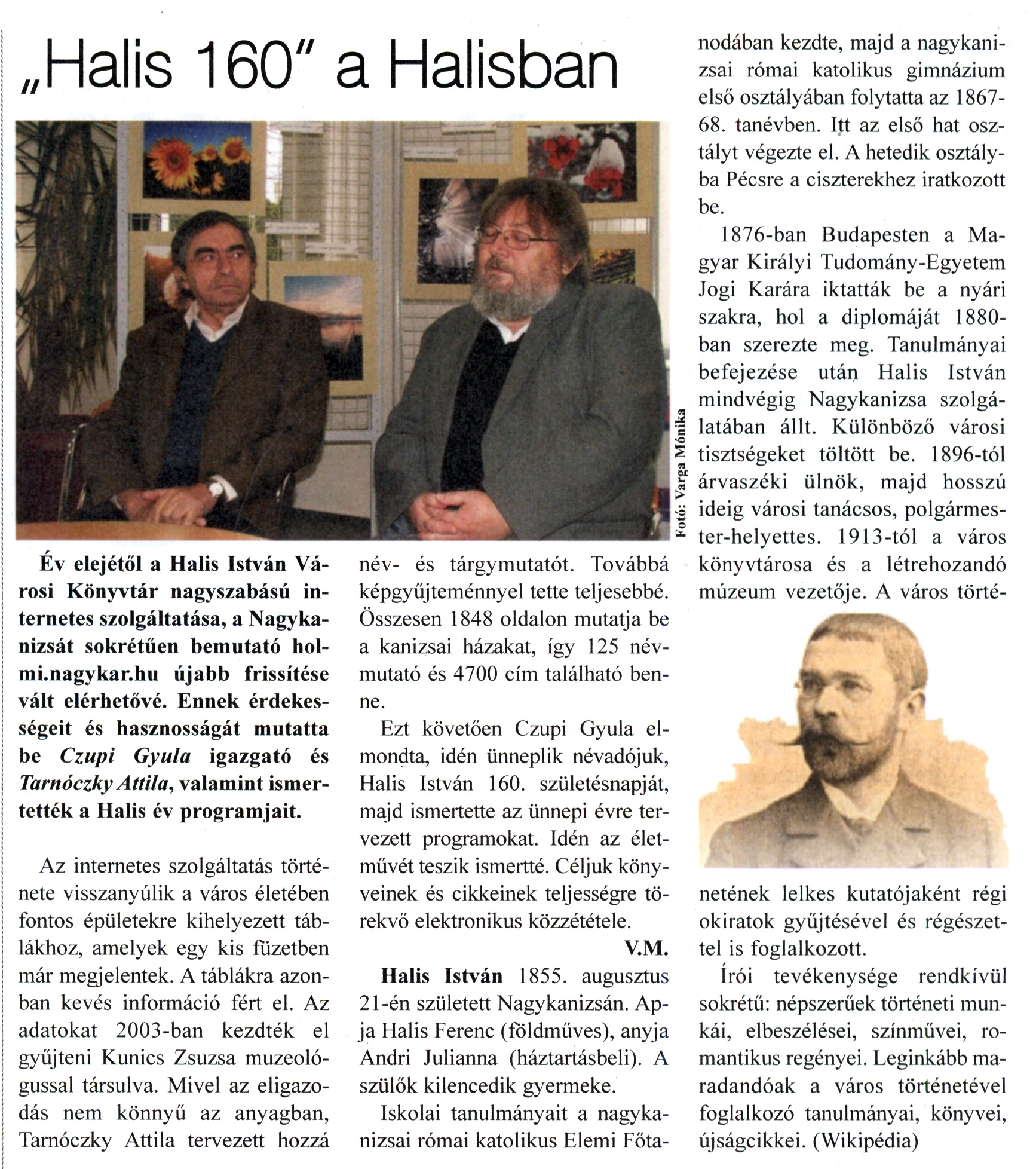 Nyilvános 2133 | 5567 | Kanizsa 2015. január 15. 1. szám 2. oldal | „Halis 160" a Halisban Év elejétől a Halis István Városi Könyvtár nagyszabású internetes szolgáltatása, a Nagykanizsát sokrétűen bemutató hol-mi.nagykar.hu újabb frissítése vált elérhetővé. Ennek érdekességeit és hasznosságát mutatta be Czupi Gyula igazgató és TarnóczkyAttila, valamint ismertették a Halis év programjait. Az internetes szolgáltatás története visszanyúlik a város életében fontos épületekre kihelyezett táblákhoz, amelyek egy kis füzetben már megjelentek. A táblákra azonban kevés információ fért el. Az adatokat 2003-ban kezdték el gyűjteni Kunics Zsuzsa muzeológussal társulva. Mivel az eligazodás nem könnyű az anyagban, Tarnóczky Attila tervezett hozzá név- és tárgymutatót. Továbbá képgyűjteménnyel tette teljesebbé. Összesen 1848 oldalon mutatja be a kanizsai házakat, így 125 névmutató és 4700 cím található benne. Ezt követően Czupi Gyula elmondta, idén ünneplik névadójuk, Halis István 160. születésnapját, majd ismertette az ünnepi évre tervezett programokat. Idén az életművét teszik ismertté. Céljuk könyveinek és cikkeinek teljességre törekvő elektronikus közzététele. V.M. Halis István 1855. augusztus 21-én született Nagykanizsán. Apja Halis Ferenc (földműves), anyja Andri Julianna (háztartásbeli). A szülők kilencedik gyermeke. Iskolai tanulmányait a nagykanizsai római katolikus Elemi Főtanodában kezdte, majd a nagykanizsai római katolikus gimnázium első osztályában folytatta az 1867-68. tanévben. Itt az első hat osztályt végezte el. A hetedik osztályba Pécsre a ciszterekhez iratkozott be. 1876-ban Budapesten a Magyar Királyi Tudomány-Egyetem Jogi Karára iktatták be a nyári szakra, hol a diplomáját 1880-ban szerezte meg. Tanulmányai befejezése után Halis István mindvégig Nagykanizsa szolgálatában állt. Különböző városi tisztségeket töltött be. 1896-tól árvaszéki ülnök, majd hosszú ideig városi tanácsos, polgármester-helyettes. 1913-tól a város könyvtárosa és a létrehozandó múzeum vezetője. A város történetének lelkes kutatójaként régi okiratok gyűjtésével és régészettel is foglalkozott. írói tevékenysége rendkívül sokrétű: népszerűek történeti munkái, elbeszélései, színművei, romantikus regényei. Leginkább maradandóak a város történetével foglalkozó tanulmányai, könyvei, újságcikkei. (Wikipédia) |
