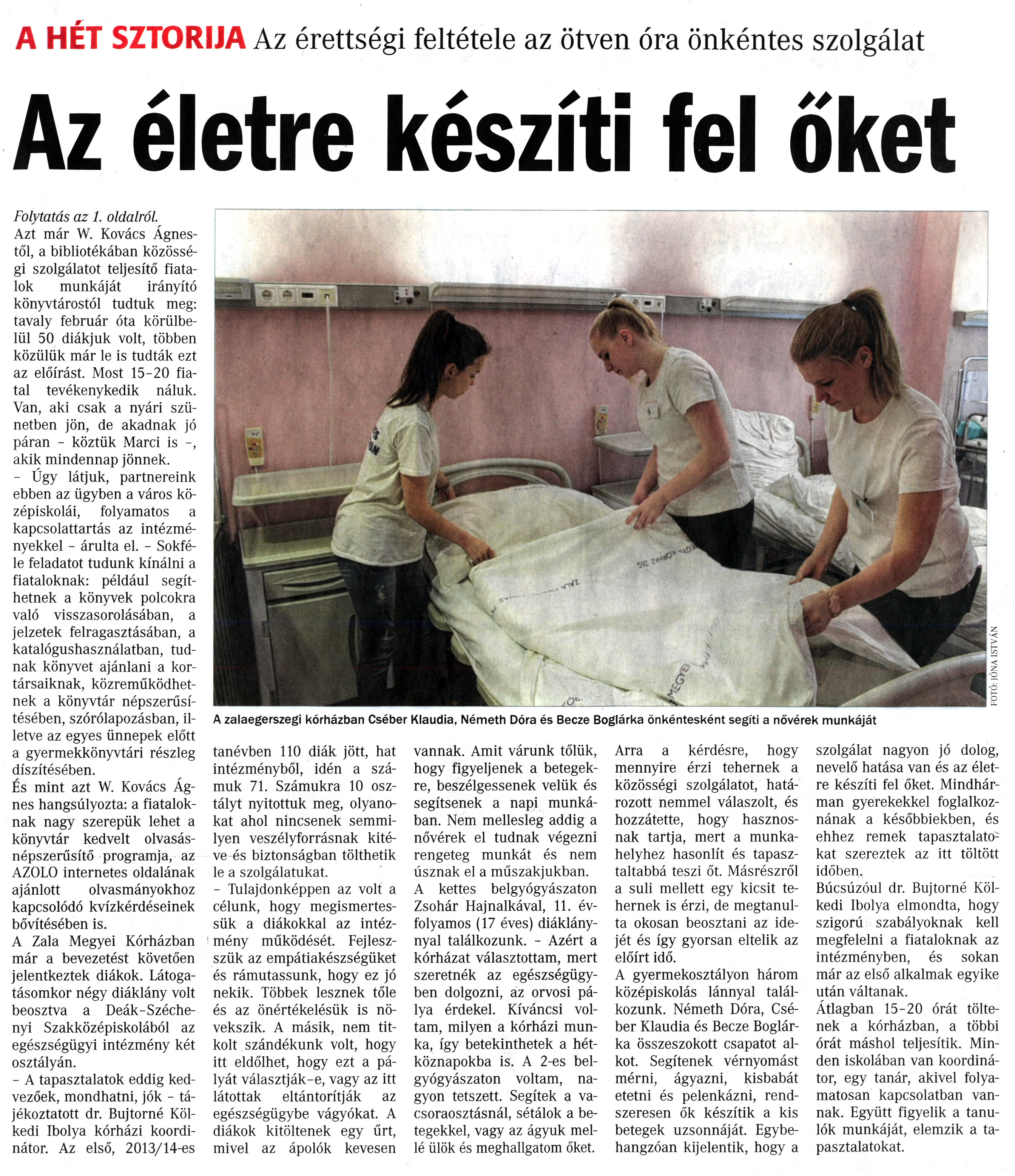 Nyilvános 1836 | 4463 | Vasárnapi Zalai Hírlap 2015. február 1. 5. szám 3. oldal - Az életre készíti fel őket | A cikk előzménye: http://www.nagykar.hu/keptar/7307/60358.html m' A HET SZTORIJA Az érettségi feltétele az ötven óra önkéntes szolgálat Az életre készíti fel őket A zalaegerszegi kórházban Cséber Klaudia, Németh Dóra és Becze Boglárka önkéntesként segíti a nővérek munkáját Folytatás az 1. oldalról. Azt már W. Kovács Ágnestől, a bibliotékában közösségi szolgálatot teljesítő fiatalok munkáját irányító könyvtárostól tudtuk meg: tavaly február óta körülbelül 50 diákjuk volt, többen közülük már le is tudták ezt az előírást. Most 15-20 fiatal tevékenykedik náluk. Van, aki csak a nyári szünetben jön, de akadnak jó páran - köztük Marci is -, akik mindennap jönnek. - Úgy látjuk, partnereink ebben az ügyben a város középiskolái, folyamatos a kapcsolattartás az intézményekkel - árulta el. - Sokféle feladatot tudunk kínálni a fiataloknak: például segíthetnek a könyvek polcokra való visszasorolásában, a jelzetek felragasztásában, a katalógushasználatban, tudnak könyvet ajánlani a kortársaiknak, közreműködhetnek a könyvtár népszerűsítésében, szórólapozásban, illetve az egyes ünnepek előtt a gyermekkönyvtári részleg díszítésében. És mint azt W. Kovács Ágnes hangsúlyozta: a fiataloknak nagy szerepük lehet a könyvtár kedvelt olvasásnépszerűsítő programja, az AZOLO internetes oldalának ajánlott olvasmányokhoz kapcsolódó kvízkérdéseinek bővítésében is. A Zala Megyei Kórházban már a bevezetést követően jelentkeztek diákok. Látogatásomkor négy diáklány volt beosztva a Deák-Széchenyi Szakközépiskolából az egészségügyi intézmény két osztályán. - A tapasztalatok eddig kedvezőek, mondhatni, jók - tájékoztatott dr. Bujtorné Köl-kedi Ibolya kórházi koordinátor. Az első, 2013/14-es tanévben 110 diák jött, hat intézményből, idén a számuk 71. Számukra 10 osztályt nyitottuk meg, olyanokat ahol nincsenek semmilyen veszélyforrásnak kitéve és biztonságban tölthetik le a szolgálatukat. - Tulajdonképpen az volt a célunk, hogy megismertessük a diákokkal az intézmény működését. Fejlesz-szük az empátiakészségüket és rámutassunk, hogy ez jó nekik. Többek lesznek tőle és az önértékelésük is növekszik. A másik, nem titkolt szándékunk volt, hogy itt eldőlhet, hogy ezt a pályát választják-e, vagy az itt látottak eltántorítják az egészségügybe vágyókat. A diákok kitöltenek egy űrt, mivel az ápolók kevesen vannak. Amit várunk tőlük, hogy figyeljenek a betegekre, beszélgessenek velük és segítsenek a napi munkában. Nem mellesleg addig a nővérek el tudnak végezni rengeteg munkát és nem úsznak el a műszakjukban. A kettes belgyógyászaton Zsohár Hajnalkával, 11. évfolyamos (17 éves) diáklánynyal találkozunk. - Azért a kórházat választottam, mert szeretnék az egészségügyben dolgozni, az orvosi pálya érdekel. Kíváncsi voltam, milyen a kórházi munka, így betekinthetek a hétköznapokba is. A 2-es belgyógyászaton voltam, nagyon tetszett. Segítek a vacsoraosztásnál, sétálok a betegekkel, vagy az ágyuk mellé ülök és meghallgatom őket. Arra a kérdésre, hogy mennyire érzi tehernek a közösségi szolgálatot, határozott nemmel válaszolt, és hozzátette, hogy hasznosnak tartja, mert a munkahelyhez hasonlít és tapasztaltabbá teszi őt. Másrészről a suli mellett egy kicsit tehernek is érzi, de megtanulta okosan beosztani az idejét és így gyorsan eltelik az előírt idő. A gyermekosztályon három középiskolás lánnyal találkozunk. Németh Dóra, Cséber Klaudia és Becze Boglárka összeszokott csapatot alkot. Segítenek vérnyomást mérni, ágyazni, kisbabát etetni és pelenkázni, rendszeresen ők készítik a kis betegek uzsonnáját. Egybehangzóan kijelentik, hogy a > szolgálat nagyon jó dolog, nevelő hatása van és az életre készíti fel őket. Mindhárman gyerekekkel foglalkoznának a későbbiekben, és ehhez remek tapasztalatokat szereztek az itt töltött időben. Búcsúzóul dr. Bujtorné Köl-kedi Ibolya elmondta, hogy szigorú szabályoknak kell megfelelni a fiataloknak az intézményben, és sokan már az első alkalmak egyike után váltanak. Átlagban 15-20 órát töltenek a kórházban, a többi órát máshol teljesítik. Minden iskolában van koordinátor, egy tanár, akivel folyamatosan kapcsolatban vannak. Együtt figyelik a tanulók munkáját, elemzik a tapasztalatokat. |