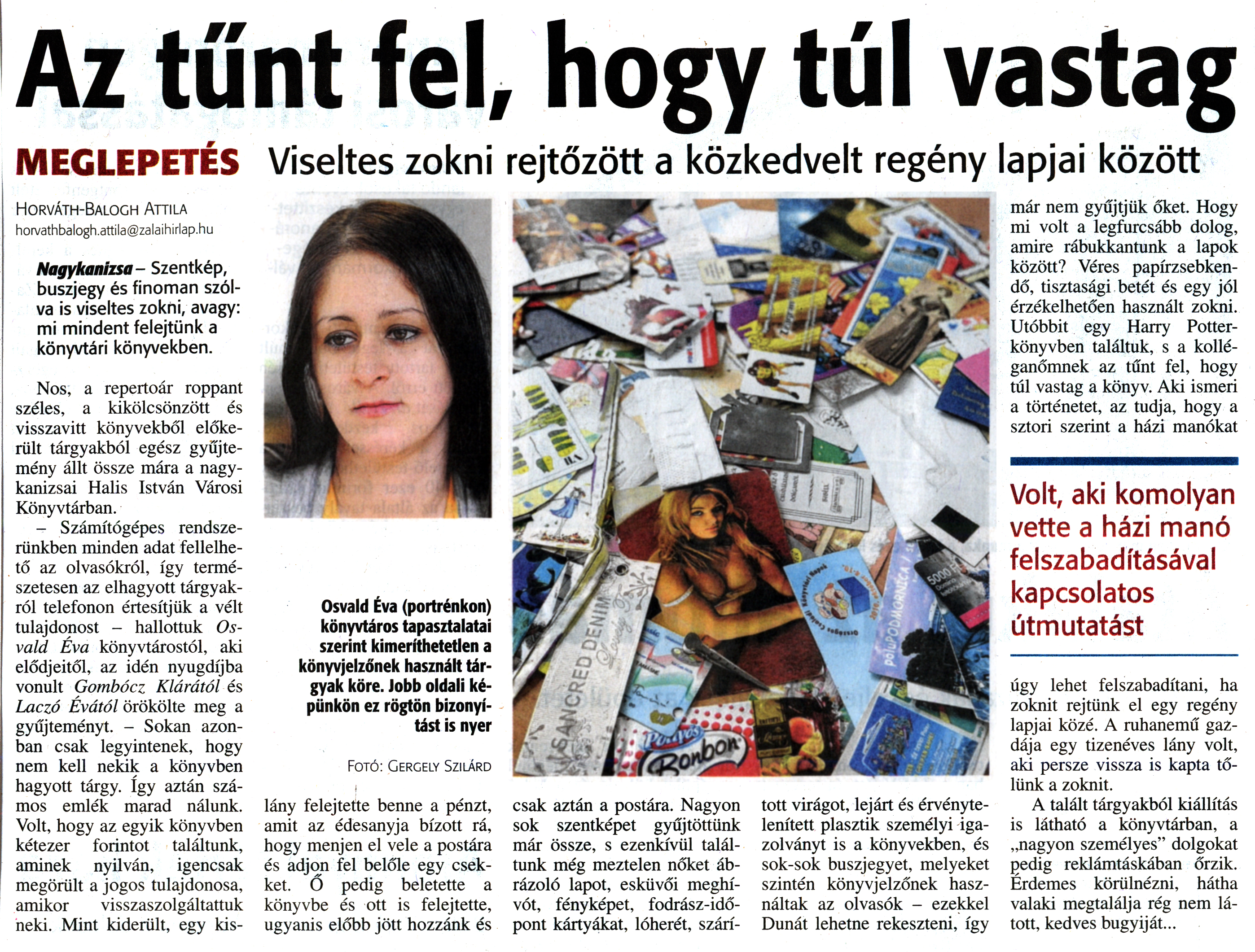 Nyilvános 1483 | 3271 | Zalai Hírlap 2015. május 6. 105. szám 3. oldal | Az tűnt fel, hogy túl vastag MEGLEPETÉS Viseltes zokni rejtőzött a közkedvelt regény lapjai között Horváth-Balogh Attila horvathbalogh.attila@zalaihirlap.hu Nagykanizsa- Szentkép, buszjegy és finoman szólva is viseltes zokni, avagy: mi mindent felejtünk a könyvtári könyvekben. Nos, a repertoár roppant széles, a kikölcsönzött és visszavitt könyvekből előkerült tárgyakból egész gyűjtemény állt össze mára a nagykanizsai Halis István Városi Könyvtárban. - Számítógépes rendszerünkben minden adat fellelhető az olvasókról, így természetesen az elhagyott tárgyakról telefonon értesítjük a vélt tulajdonost - hallottuk Os-vald Éva könyvtárostól, aki elődjeitől, az idén nyugdíjba vonult Gombócz Klárától és Laczó Évától örökölte meg a gyűjteményt. - Sokan azonban csak legyintenek, hogy nem kell nekik a könyvben hagyott tárgy. így aztán számos emlék marad nálunk. Volt, hogy az egyik könyvben kétezer forintot találtunk, aminek nyilván, igencsak megörült a jogos tulajdonosa, amikor visszaszolgáltattuk neki. Mint kiderült, egy kis- lány felejtette benne a pénzt, amit az édesanyja bízott rá, hogy menjen el vele a postára és adjon fel belőle egy csekket. O pedig beletette a könyvbe és ott is felejtette, ugyanis előbb jött hozzánk és csak aztán a postára. Nagyon sok szentképet gyűjtöttünk már össze, s ezenkívül találtunk még meztelen nőket ábrázoló lapot, esküvői meghívót, fényképet, fodrász-idő-pont kártyákat, lóherét, szárí- tott virágot, lejárt és érvénytelenített plasztik személyi igazolványt is a könyvekben, és sok-sok buszjegyet, melyeket szintén könyvjelzőnek használtak az olvasók - ezekkel Dunát lehetne rekeszteni, így már nem gyűjtjük őket. Hogy mi volt a legfurcsább dolog, amire rábukkantunk a lapok között? Véres papírzsebkendő, tisztasági betét és egy jól érzékelhetően használt zokni. Utóbbit egy Harry Potter-könyvben találtuk, s a kolléganőmnek az tűnt fel, hogy túl vastag a könyv. Aki ismeri a történetet, az tudja, hogy a sztori szerint a házi manókat Volt, aki komolyan vette a házi manó felszabadításával kapcsolatos útmutatást úgy lehet felszabadítani, ha zoknit rejtünk el egy regény lapjai közé. A ruhanemű gazdája egy tizenéves lány volt, aki persze vissza is kapta tőlünk a zoknit. A talált tárgyakból kiállítás is látható a könyvtárban, a „nagyon személyes" dolgokat pedig reklámtáskában őrzik. Érdemes körülnézni, hátha valaki megtalálja rég nem látott, kedves bugyiját... |