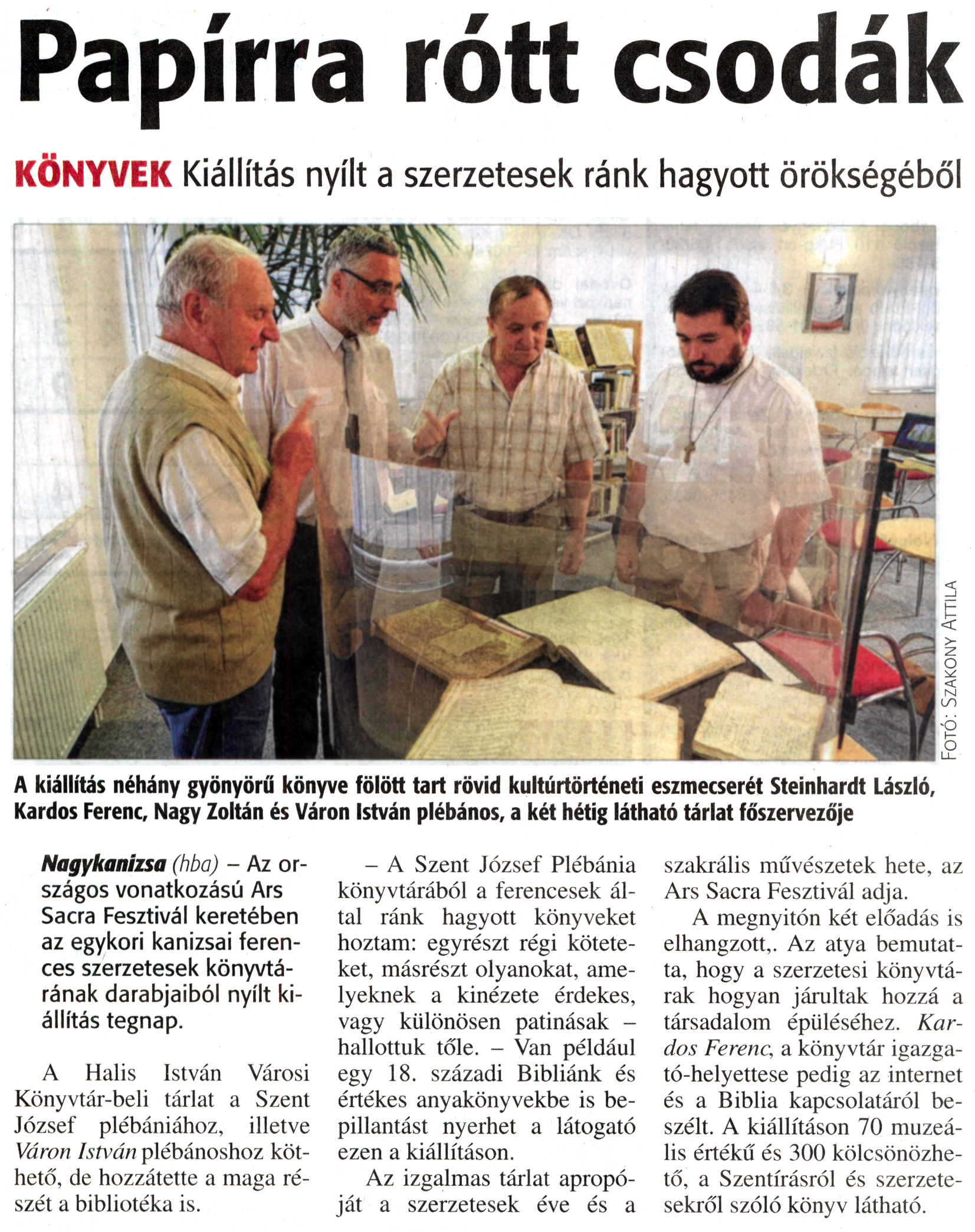 Nyilvános 1497 | 3217 | Zalai Hírlap 2015. szeptember 23. 223. szám 16. oldal | Papírra rótt csodák KÖNYVEK Kiállítás nyílt a szerzetesek ránk hagyott örökségéből A kiállítás néhány gyönyörű könyve fölött tart rövid kultúrtörténeti eszmecserét Steinhardt László, Kardos Ferenc, Nagy Zoltán és Váron István plébános, a két hétig látható tárlat főszervezője Nagykanizsa (hba) - Az országos vonatkozású Ars Sacra Fesztivál keretében az egykori kanizsai ferences szerzetesek könyvtárának darabjaiból nyílt kiállítás tegnap. A Halis István Városi Könyvtár-beli tárlat a Szent József plébániához, illetve Váron István plébánoshoz köthető, de hozzátette a maga részét a bibliotéka is. - A Szent József Plébánia könyvtárából a ferencesek által ránk hagyott könyveket hoztam: egyrészt régi köteteket, másrészt olyanokat, amelyeknek a kinézete érdekes, vagy különösen patinásak -hallottuk tőle. - Van például egy 18. századi Bibliánk és értékes anyakönyvekbe is bepillantást nyerhet a látogató ezen a kiállításon. Az izgalmas tárlat apropóját a szerzetesek éve és a szakrális művészetek hete, az Ars Sacra Fesztivál adja. A megnyitón két előadás is elhangzott. Az atya bemutatta, hogy a szerzetesi könyvtárak hogyan járultak hozzá a társadalom épüléséhez. Kardos Ferenc, a könyvtár igazgató-helyettese pedig az internet és a Biblia kapcsolatáról beszélt. A kiállításon 70 muzeális értékű és 300 kölcsönözhető, a Szentírásról és szerzetesekről szóló könyv látható. |