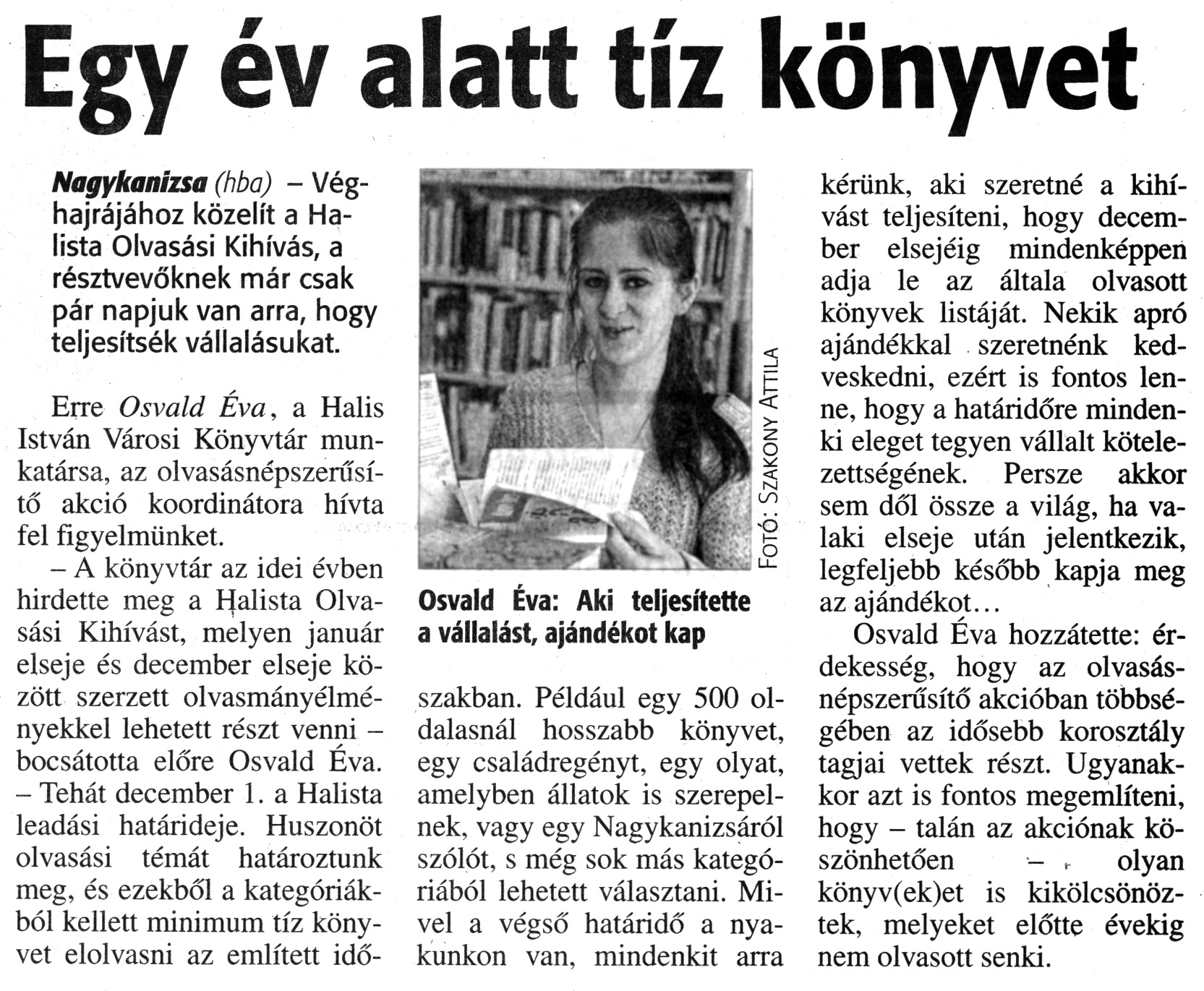 Nyilvános 1647 | 3276 | Zalai Hírlap 2015. november 26. 277. szám 7. oldal | Egy év alatt tíz könyvet Nagykanizsa (hba) - Véghajrájához közelít a Ha-lista Olvasási Kihívás, a résztvevőknek már csak pár napjuk van arra, hogy teljesítsék vállalásukat. Erre Osvald Éva, a Halis István Városi Könyvtár munkatársa, az olvasásnépszerűsítő akció koordinátora hívta fel figyelmünket. - A könyvtár az idei évben hirdette meg a Halista Olvasási Kihívást, melyen január elseje és december elseje között szerzett olvasmányélményekkel lehetett részt venni -bocsátotta előre Osvald Éva. - Tehát december 1. a Halista leadási határideje. Huszonöt olvasási témát határoztunk meg, és ezekből a kategóriákból kellett minimum tíz könyvet elolvasni az említett időszakban. Például egy 500 oldalasnál hosszabb könyvet, egy családregényt, egy olyat, amelyben állatok is szerepelnek, vagy egy Nagykanizsáról szólót, s még sok más kategóriából lehetett választani. Mivel a végső határidő a nyakunkon van, mindenkit arra kérünk, aki szeretné a kihívást teljesíteni, hogy december elsejéig mindenképpen adja le az általa olvasott könyvek listáját. Nekik apró ajándékkal szeretnénk kedveskedni, ezért is fontos lenne, hogy a határidőre mindenki eleget tegyen vállalt kötelezettségének. Persze akkor sem dől össze a világ, ha valaki elseje után jelentkezik, legfeljebb később kapja meg az ajándékot... Osvald Éva hozzátette: érdekesség, hogy az olvasás-népszerűsítő akcióban többségében az idősebb korosztály tagjai vettek részt. Ugyanakkor azt is fontos megemlíteni, hogy - talán az akciónak köszönhetően - olyan könyv(ek)et is kikölcsönöztek, melyeket előtte évekig nem olvasott senki. Osvald Éva: Aki teljesítette a vállalást, ajándékot kap |