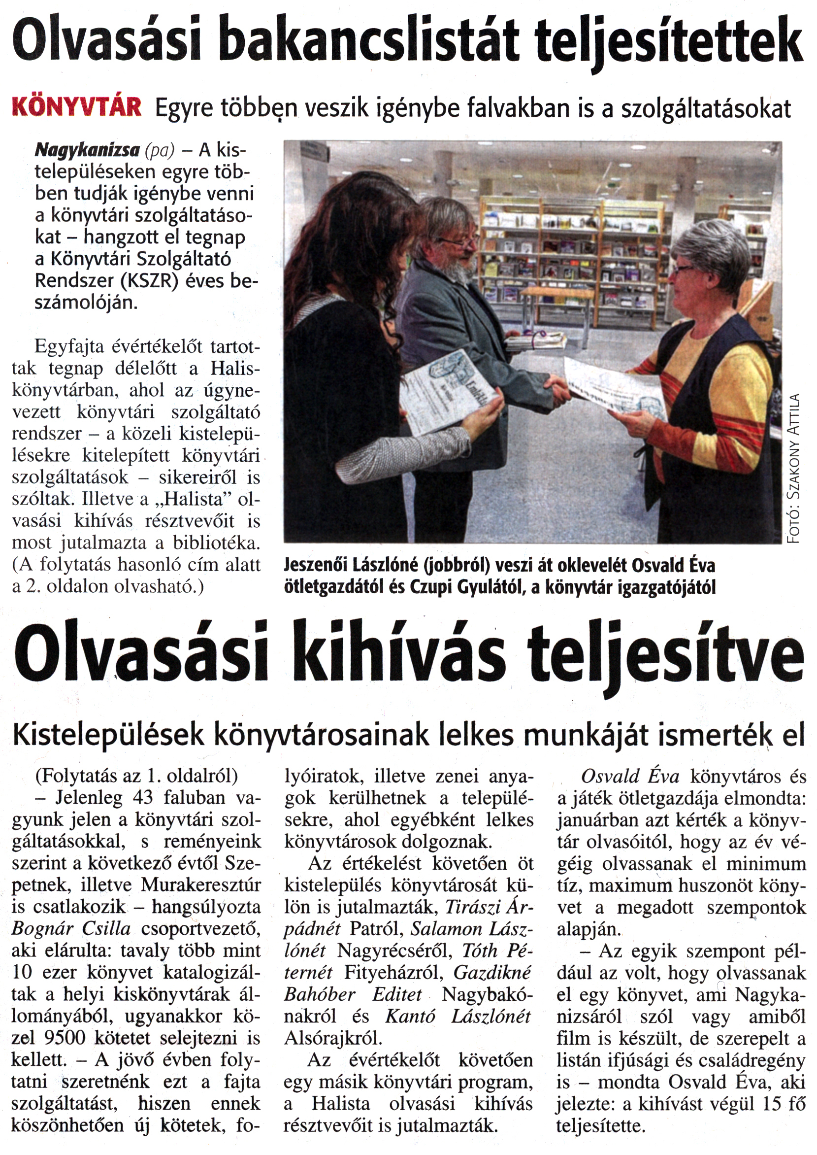 Nyilvános 1668 | 3229 | Zalai Hírlap 2015. december 16. 294. szám 1, 3. oldal | Olvasási bakancslistát teljesítettek KÖNYVTÁR Egyre többen veszik igénybe falvakban is a szolgáltatásokat Nagykanizsa (pa) - A kistelepüléseken egyre többen tudják igénybe venni a könyvtári szolgáltatásokat - hangzott el tegnap a Könyvtári Szolgáltató Rendszer (KSZR) éves beszámolóján. Egyfajta évértékelőt tartottak tegnap délelőtt a Halis-könyvtárban, ahol az úgynevezett könyvtári szolgáltató rendszer - a közeli kistelepülésekre kitelepített könyvtári szolgáltatások - sikereiről is szóltak. Illetve a „Halista" olvasási kihívás résztvevőit is most jutalmazta a bibliotéka. (A folytatás hasonló cím alatt a 2. oldalon olvasható.) Jeszenői Lászlóné (jobbról) veszi át oklevelét Osvald Éva ötletgazdától és Czupi Gyulától, a könyvtár igazgatójától Olvasási kihívás teljesítve Kistelepülések könyvtárosainak lelkes munkáját ismerték el (Folytatás az 1. oldalról) - Jelenleg 43 faluban vagyunk jelen a könyvtári szolgáltatásokkal, s reményeink szerint a következő évtől Sze-petnek, illetve Murakeresztúr is csatlakozik - hangsúlyozta Bognár Csilla csoportvezető, aki elárulta: tavaly több mint 10 ezer könyvet katalogizáltak a helyi kiskönyvtárak állományából, ugyanakkor közel 9500 kötetet selejtezni is kellett. - A jövő évben folytatni szeretnénk ezt a fajta szolgáltatást, hiszen ennek köszönhetően új kötetek, fo- lyóiratok, illetve zenei anyagok kerülhetnek a településekre, ahol egyébként lelkes könyvtárosok dolgoznak. Az értékelést követően öt kistelepülés könyvtárosát külön is jutalmazták, Tirászi Árpádnét Patról, Salamon Lászlónét Nagyrécséről, Tóth Péternét Fityeházról, Gazdikné Bahóber Editet Nagybakónakról és Kantó Lászlónét Alsórajkról. Az évértékelőt követően egy másik könyvtári program, a Halista olvasási kihívás résztvevőit is jutalmazták. Osvald Éva könyvtáros és a játék ötletgazdája elmondta: januárban azt kérték a könyvtár olvasóitól, hogy az év végéig olvassanak el minimum tíz, maximum huszonöt könyvet a megadott szempontok alapján. - Az egyik szempont például az volt, hogy olvassanak el egy könyvet, ami Nagykanizsáról szól vagy amiből film is készült, de szerepelt a listán ifjúsági és családregény is - mondta Osvald Éva, aki jelezte: a kihívást végül 15 fő teljesítette. |