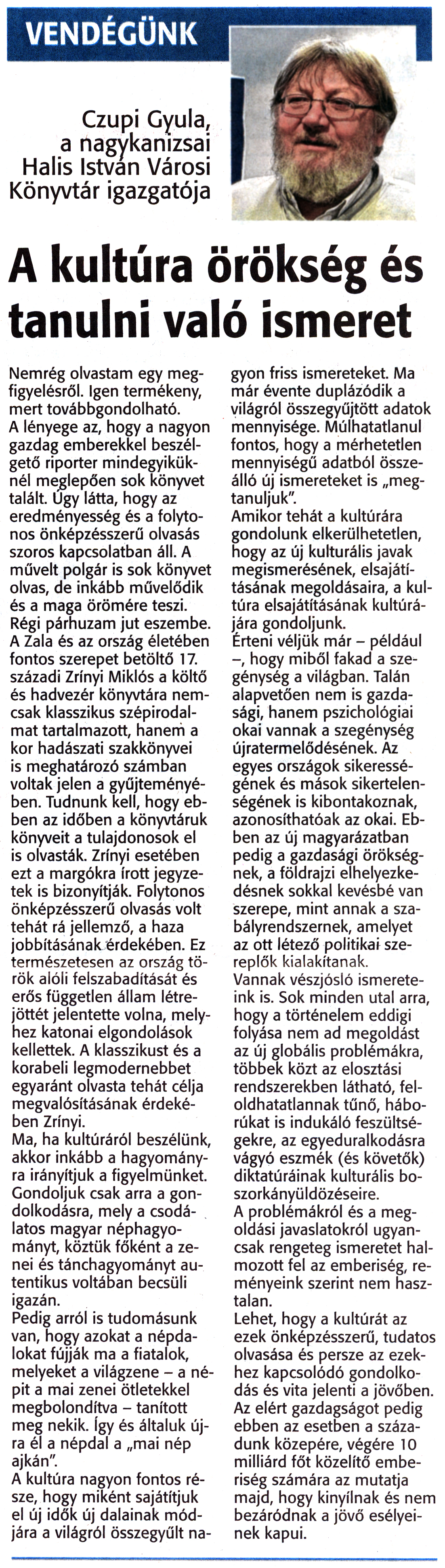 Nyilvános 1827 | 3345 | Zalai Hírlap 2016. január 16. 13. szám 2. oldal | VENDÉGÜNK Czupi Gyula, a nagykanizsai Halis István Városi Könyvtár igazgatója A kultúra örökség és tanulni való ismeret Nemrég olvastam egy megfigyelésről. Igen termékeny, mert továbbgondolható. A lényege az, hogy a nagyon gazdag emberekkel beszélgető riporter mindegyiküknél meglepően sok könyvet talált. Úgy látta, hogy az eredményesség és a folytonos önképzésszerű olvasás szoros kapcsolatban áll. A művelt polgár is sok könyvet olvas, de inkább művelődik és a maga örömére teszi. Régi párhuzam jut eszembe. A Zala és az ország életében fontos szerepet betöltő 17. századi Zrínyi Miklós a költő és hadvezér könyvtára nemcsak klasszikus szépirodalmat tartalmazott, hanem a kor hadászati szakkönyvei is meghatározó számban voltak jelen a gyűjteményében. Tudnunk kell, hogy ebben az időben a könyvtáruk könyveit a tulajdonosok el is olvasták. Zrínyi esetében ezt a margókra írott jegyzetek is bizonyítják. Folytonos önképzésszerű olvasás volt tehát rá jellemző, a haza jobbításának érdekében. Ez természetesen az ország török alóli felszabadítását és erős független állam létrejöttét jelentette volna, melyhez katonai elgondolások kellettek. A klasszikust és a korabeli legmodernebbet egyaránt olvasta tehát célja megvalósításának érdekében Zrínyi. Ma, ha kultúráról beszélünk, akkor inkább a hagyományra irányítjuk a figyelmünket. Gondoljuk csak arra a gondolkodásra, mely a csodálatos magyar néphagyományt, köztük főként a zenei és tánchagyományt autentikus voltában becsüli igazán. Pedig arról is tudomásunk van, hogy azokat a népdalokat fújják ma a fiatalok, melyeket a világzene - a népit a mai zenei ötletekkel megbolondítva - tanított meg nekik. Így és általuk újra él a népdal a „mai nép ajkán". A kultúra nagyon fontos része, hogy miként sajátítjuk el új idők új dalainak módjára a világról összegyűlt nagyon friss ismereteket. Ma már évente duplázódik a világról összegyűjtött adatok mennyisége. Múlhatatlanul fontos, hogy a mérhetetlen mennyiségű adatból összeálló új ismereteket is „megtanuljuk". Amikor tehát a kultúrára gondolunk elkerülhetetlen, hogy az új kulturális javak megismerésének, elsajátításának megoldásaira, a kultúra elsajátításának kultúrájára gondoljunk. Érteni véljük már - például hogy miből fakad a szegénység a világban. Talán alapvetően nem is gazdasági, hanem pszichológiai okai vannak a szegénység újratermelődésének. Az egyes országok sikerességének és mások sikertelenségének is kibontakoznak, azonosíthatóak az okai. Ebben az új magyarázatban pedig a gazdasági örökségnek, a földrajzi elhelyezkedésnek sokkal kevésbé van szerepe, mint annak a szabályrendszernek, amelyet az ott létező politikai szereplők kialakítanak. Vannak vészjósló ismereteink is. Sok minden utal arra, hogy a történelem eddigi folyása nem ad megoldást az új globális problémákra, többek közt az elosztási rendszerekben látható, feloldhatatlannak tűnő, háborúkat is indukáló feszültségekre, az egyeduralkodásra vágyó eszmék (és követők) diktatúráinak kulturális boszorkányüldözéseire. A problémákról és a megoldási javaslatokról ugyancsak rengeteg ismeretet halmozott fel az emberiség, reményeink szerint nem hasztalan. Lehet, hogy a kultúrát az ezek önképzésszerű, tudatos olvasása és persze az ezekhez kapcsolódó gondolkodás és vita jelenti a jövőben. Az elért gazdagságot pedig ebben az esetben a századunk közepére, végére 10 milliárd főt közelítő emberiség számára az mutatja majd, hogy kinyílnak és nem bezáródnak a jövő esélyeinek kapui. |