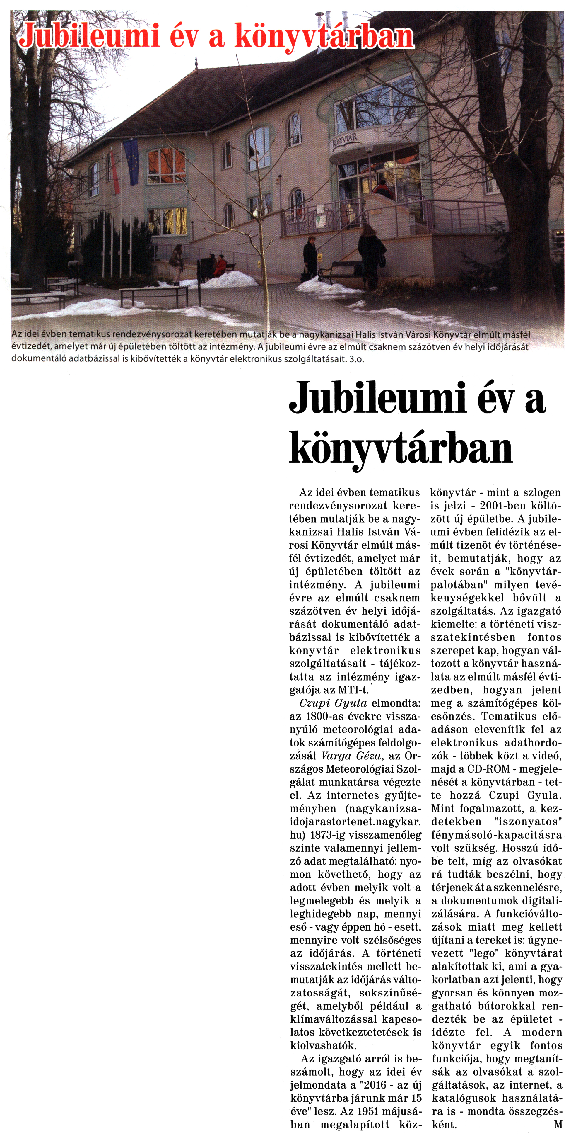 Nyilvános 1765 | 3658 | Nagykanizsai Maraton 2016. január 15. 2. szám 1, 3. oldal | Jubileumi év a könyvtárban Az idei évben tematikus rendezvénysorozat keretében mutatják be a nagykanizsai Halis István Városi Könyvtár elmúlt másfél évtizedét, amelyet már új épületében töltött az intézmény. A jubileumi évre az elmúlt csaknem százötven év helyi időjárását dokumentáló adatbázissal is kibővítették a könyvtár elektronikus szolgáltatásait. 3.o. Jubileumi év a könyvtárban Az idei évben tematikus rendezvénysorozat keretében mutatják be a nagykanizsai Halis István Városi Könyvtár elmúlt másfél évtizedét, amelyet már új épületében töltött az intézmény. A jubileumi évre az elmúlt csaknem százötven év helyi időjárását dokumentáló adatbázissal is kibővítették a könyvtár elektronikus szolgáltatásait - tájékoztatta az intézmény igazgatója az MTI-t. Czupi Gyula elmondta: az 1800-as évekre visszanyúló meteorológiai adatok számítógépes feldolgozását Varga Géza, az Országos Meteorológiai Szolgálat munkatársa végezte el. Az internetes gyűjteményben (nagykanizsaidojarastortenet.nagykar.hu) 1873-ig visszamenőleg szinte valamennyi jellemző adat megtalálható: nyomon követhető, hogy az adott évben melyik volt a legmelegebb és melyik a leghidegebb nap, mennyi eső - vagy éppen hó - esett, mennyire volt szélsőséges az időjárás. A történeti visszatekintés mellett bemutatják az időjárás változatosságát, sokszínűségét, amelyből például a klímaváltozással kapcsolatos következtetetések is kiolvashatók. Az igazgató arról is beszámolt, hogy az idei év jelmondata a "2016 - az új könyvtárba járunk már 15 éve" lesz. Az 1951 májusában megalapított közkönyvtár - mint a szlogen is jelzi - 2001-ben költözött új épületbe. A jubileumi évben felidézik az elmúlt tizenöt év történéseit, bemutatják, hogy az évek során a "könyvtárpalotában" milyen tevékenységekkel bővült a szolgáltatás. Az igazgató kiemelte: a történeti visszatekintésben fontos szerepet kap, hogyan változott a könyvtár használata az elmúlt másfél évtizedben, hogyan jelent meg a számítógépes kölcsönzés. Tematikus előadáson elevenítik fel az elektronikus adathordozók - többek közt a videó, majd a CD-ROM - megjelenését a könyvtárban - tette hozzá Czupi Gyula. Mint fogalmazott, a kezdetekben "iszonyatos" fénymásoló-kapacitásra volt szükség. Hosszú időbe telt, míg az olvasókat rá tudták beszélni, hogy térjenek át a szkennelésre, a dokumentumok digitalizálására. A funkcióváltozások miatt meg kellett újítani a tereket is: úgynevezett "lego" könyvtárat alakítottak ki, ami a gyakorlatban azt jelenti, hogy gyorsan és könnyen mozgatható bútorokkal rendezték be az épületet -idézte fel. A modern könyvtár egyik fontos funkciója, hogy megtanítsák az olvasókat a szolgáltatások, az internet, a katalógusok használatára is - mondta összegzésként. M |