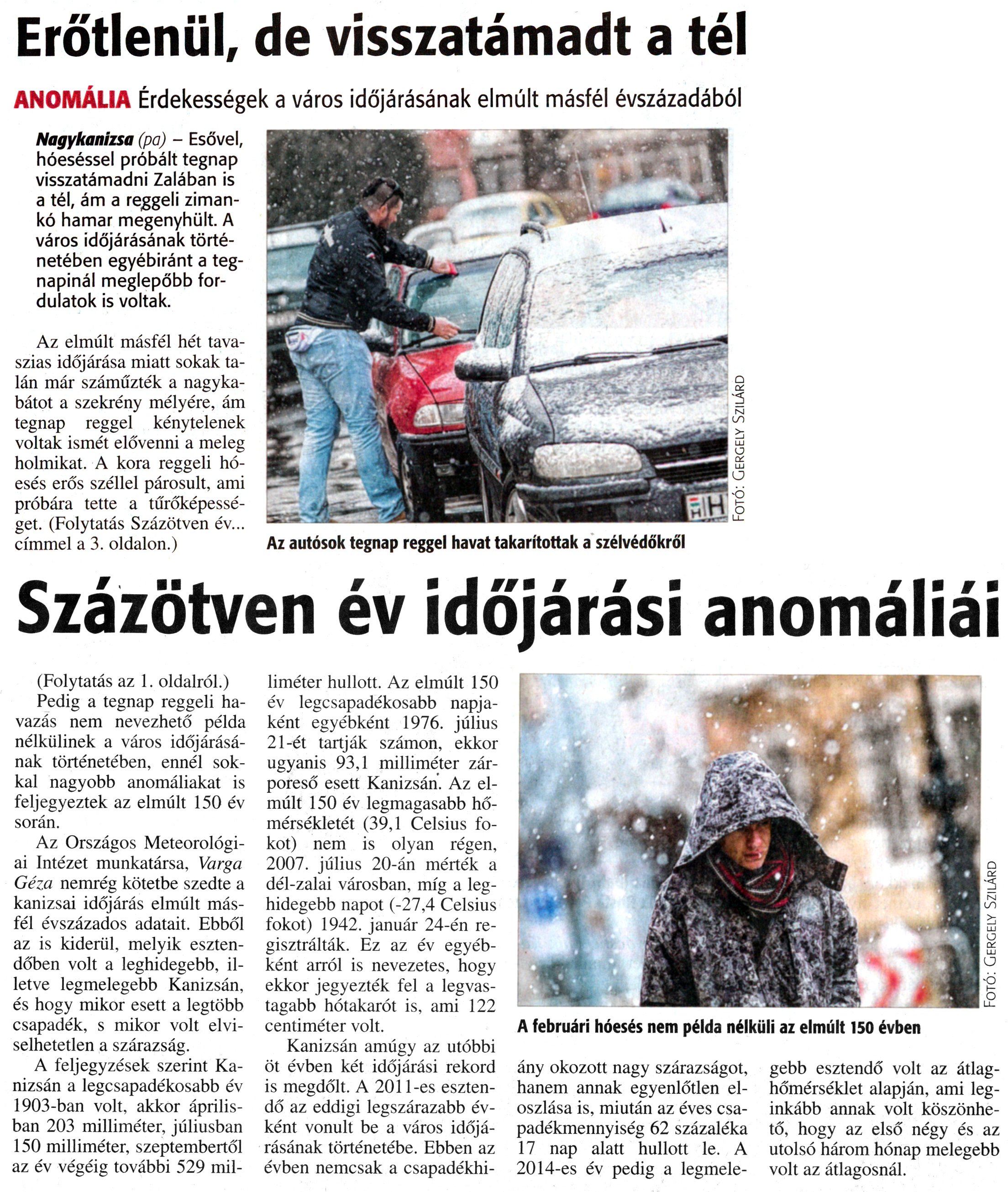 Nyilvános 1550 | 2923 | Zalai Hírlap 2016. február 11. 035. szám 1, 3. oldal | Erőtlenül, de visszatámadt a tél ANOMÁLIA Érdekességek a város időjárásának elmúlt másfél évszázadából Nagykanizsa (pa) - Esővel, hóeséssel próbált tegnap visszatámadni Zalában is a tél, ám a reggeli zimankó hamar megenyhült. A város időjárásának történetében egyébiránt a tegnapinál meglepőbb fordulatok is voltak. Az elmúlt másfél hét tavaszias időjárása miatt sokak talán már száműzték a nagykabátot a szekrény mélyére, ám tegnap reggel kénytelenek voltak ismét elővenni a meleg holmikat. A kora reggeli hóesés erős széllel párosult, ami próbára tette a tűrőképességet. (Folytatás Százötven év... címmel a 3. oldalon.) Az autósok tegnap reggel havat takarítottak a szélvédőkről Százötven év időjárási anomáliái (Folytatás az 1. oldalról.) Pedig a tegnap reggeli havazás nem nevezhető példa nélkülinek a város időjárásának történetében, ennél sokkal nagyobb anomáliakat is feljegyeztek az elmúlt 150 év során. Az Országos Meteorológiai Intézet munkatársa, Varga Géza nemrég kötetbe szedte a kanizsai időjárás elmúlt másfél évszázados adatait. Ebből az is kiderül, melyik esztendőben volt a leghidegebb, illetve legmelegebb Kanizsán, és hogy mikor esett a legtöbb csapadék, s mikor volt elviselhetetlen a szárazság. A feljegyzések szerint Kanizsán a legcsapadékosabb év 1903-ban volt, akkor áprilisban 203 milliméter, júliusban 150 milliméter, szeptembertől az év végéig további 529 milliméter hullott. Az elmúlt 150 év legcsapadékosabb napjaként egyébként 1976. július 21-ét tartják számon, ekkor ugyanis 93,1 milliméter zárporeső esett Kanizsán. Az elmúlt 150 év legmagasabb hőmérsékletét (39,1 Celsius fokot) nem is olyan régen, 2007. július 20-án mérték a dél-zalai városban, míg a leghidegebb napot (-27,4 Celsius fokot) 1942. január 24-én regisztrálták. Ez az év egyébként arról is nevezetes, hogy ekkor jegyezték fel a legvastagabb hótakarót is, ami 122 centiméter volt. Kanizsán amúgy az utóbbi öt évben két időjárási rekord is megdőlt. A 2011-es esztendő az eddigi legszárazabb évként vonult be a város időjárásának történetébe. Ebben az évben nemcsak a csapadékhiány okozott nagy szárazságot, hanem annak egyenlőtlen eloszlása is, miután az éves csapadékmennyiség 62 százaléka 17 nap alatt hullott le. A 2014-es év pedig a legmelegebb esztendő volt az átlaghőmérséklet alapján, ami leginkább annak volt köszönhető, hogy az első négy és az utolsó három hónap melegebb volt az átlagosnál. |