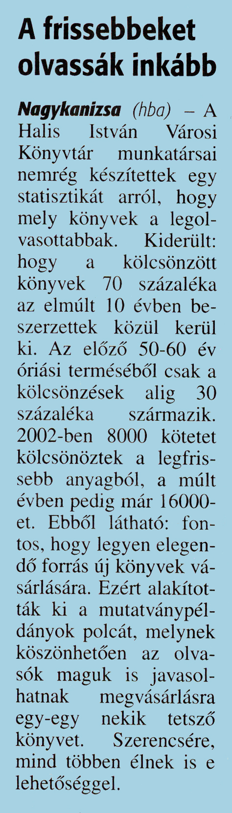 Nyilvános 1715 | 3311 | Zalai Hírlap 2016. február 15. 38. szám 4. oldal | A frissebbeket olvassák inkább Nagykanizsa (hba) - A Halis István Városi Könyvtár munkatársai nemrég készítettek egy statisztikát arról, hogy mely könyvek a legolvasottabbak. Kiderült: hogy a kölcsönzött könyvek 70 százaléka az elmúlt 10 évben beszerzettek közül kerül ki. Az előző 50-60 év óriási terméséből csak a kölcsönzések alig 30 százaléka származik. 2002-ben 8000 kötetet kölcsönöztek a legfrissebb anyagból, a múlt évben pedig már 16000-et. Ebből látható: fontos, hogy legyen elegendő forrás új könyvek vásárlására. Ezért alakították ki a mutatványpéldányok polcát, melynek köszönhetően az olvasók maguk is javasolhatnak megvásárlásra egy-egy nekik tetsző könyvet. Szerencsére, mind többen élnek is e lehetőséggel. |