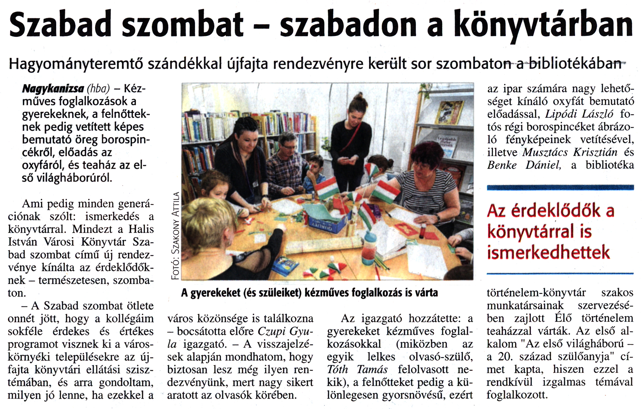 Nyilvános 1726 | 3381 | Zalai Hírlap 2016. február 29. 50. szám 4. oldal | Szabad szombat - szabadon a könyvtárban Hagyományteremtő szándékkal újfajta rendezvényre került sor szombaton a bibliotékában. Nagykanizsa (hba) - Kézműves foglalkozások a gyerekeknek, a felnőtteknek pedig vetített képes bemutató öreg borospincékről, előadás az oxyfáról, és teaház az első világháborúról. Ami pedig minden generációnak szólt: ismerkedés a könyvtárral. Mindezt a Halis István Városi Könyvtár Szabad szombat című új rendezvénye kínálta az érdeklődőknek - természetesen, szombaton. - A Szabad szombat ötlete onnét jött, hogy a kollégáim sokféle érdekes és értékes programot visznek ki a városkörnyéki településekre az újfajta könyvtári ellátási szisztémában, és arra gondoltam, milyen jó lenne, ha ezekkel a A gyerekeket (és szüleiket) kézműves foglalkozás is várta város közönsége is találkozna - bocsátotta előre Czupi Gyula igazgató. - A visszajelzések alapján mondhatom, hogy biztosan lesz még ilyen rendezvényünk, mert nagy sikert aratott az olvasók körében. Az igazgató hozzátette: a gyerekeket kézműves foglalkozásokkal (miközben az egyik lelkes olvasó-szülő, Tóth Tamás felolvasott nekik), a felnőtteket pedig a különlegesen gyorsnövésű, ezért az ipar számára nagy lehetőséget kínáló oxyfát bemutató előadással, Lipódi László fotós régi borospincéket ábrázoló fényképeinek vetítésével, illetve Musztács Krisztián és Benke Dániel, a bibliotéka Az érdeklődők a könyvtárral is ismerkedhettek történelem-könyvtár szakos munkatársainak szervezésében zajlott Élő történelem teaházzal várták. Az első alkalom "Az első világháború -a 20. század szülőanyja" címet kapta, hiszen ezzel a rendkívül izgalmas témával foglalkozott. |