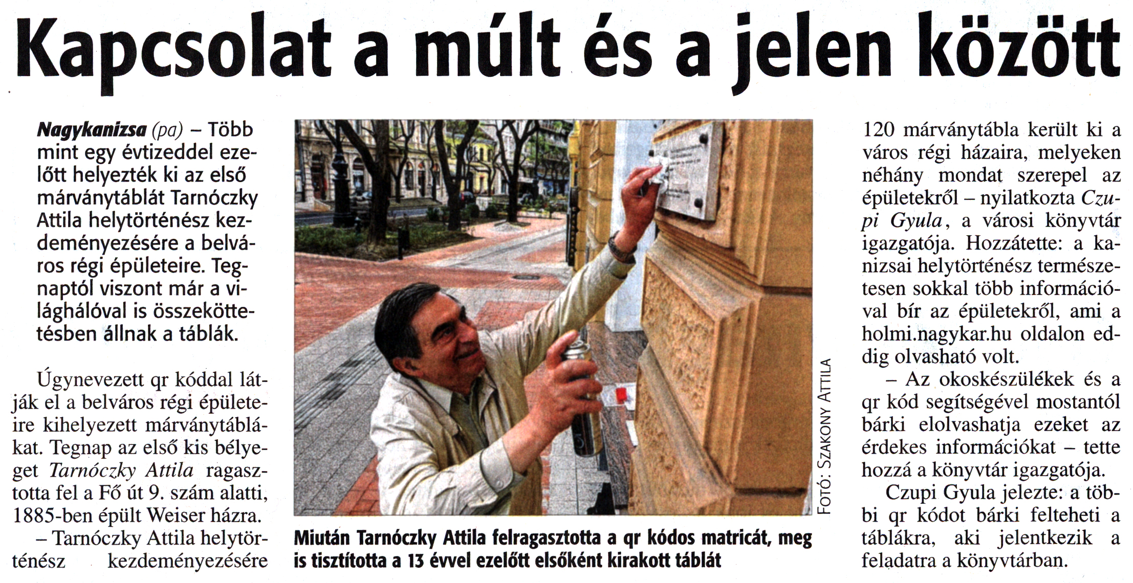 Nyilvános 1487 | 2679 | Zalai Hírlap 2016. április 15. 72. szám 2. oldal | Kapcsolat a múlt és a jelen között Nagykanizsa (pa) - Több mint egy évtizeddel ezelőtt helyezték ki az első márványtáblát Tarnóczky Attila helytörténész kezdeményezésére a belváros régi épületeire. Tegnaptól viszont már a világhálóval is összeköttetésben állnak a táblák. Úgynevezett qr kóddal látják el a belváros régi épületeire kihelyezett márványtáblákat. Tegnap az első kis bélyeget Tarnóczky Attila ragasztotta fel a Fő út 9. szám alatti, 1885-ben épült Weiser házra. - Tarnóczky Attila helytörténész kezdeményezésére Miután Tarnóczky Attila felragasztotta a qr kódos matricát, meg is tisztította a 13 évvel ezelőtt elsőként kirakott táblát 120 márványtábla került ki a város régi házaira, melyeken néhány mondat szerepel az épületekről - nyilatkozta Czupi Gyula, a városi könyvtár igazgatója. Hozzátette: a kanizsai helytörténész természetesen sokkal több információval bír az épületekről, ami a holmi.nagykar.hu oldalon eddig olvasható volt. - Az okoskészülékek és a qr kód segítségével mostantól bárki elolvashatja ezeket az érdekes információkat - tette hozzá a könyvtár igazgatója. Czupi Gyula jelezte: a többi qr kódot bárki felteheti a táblákra, aki jelentkezik a feladatra a könyvtárban. |